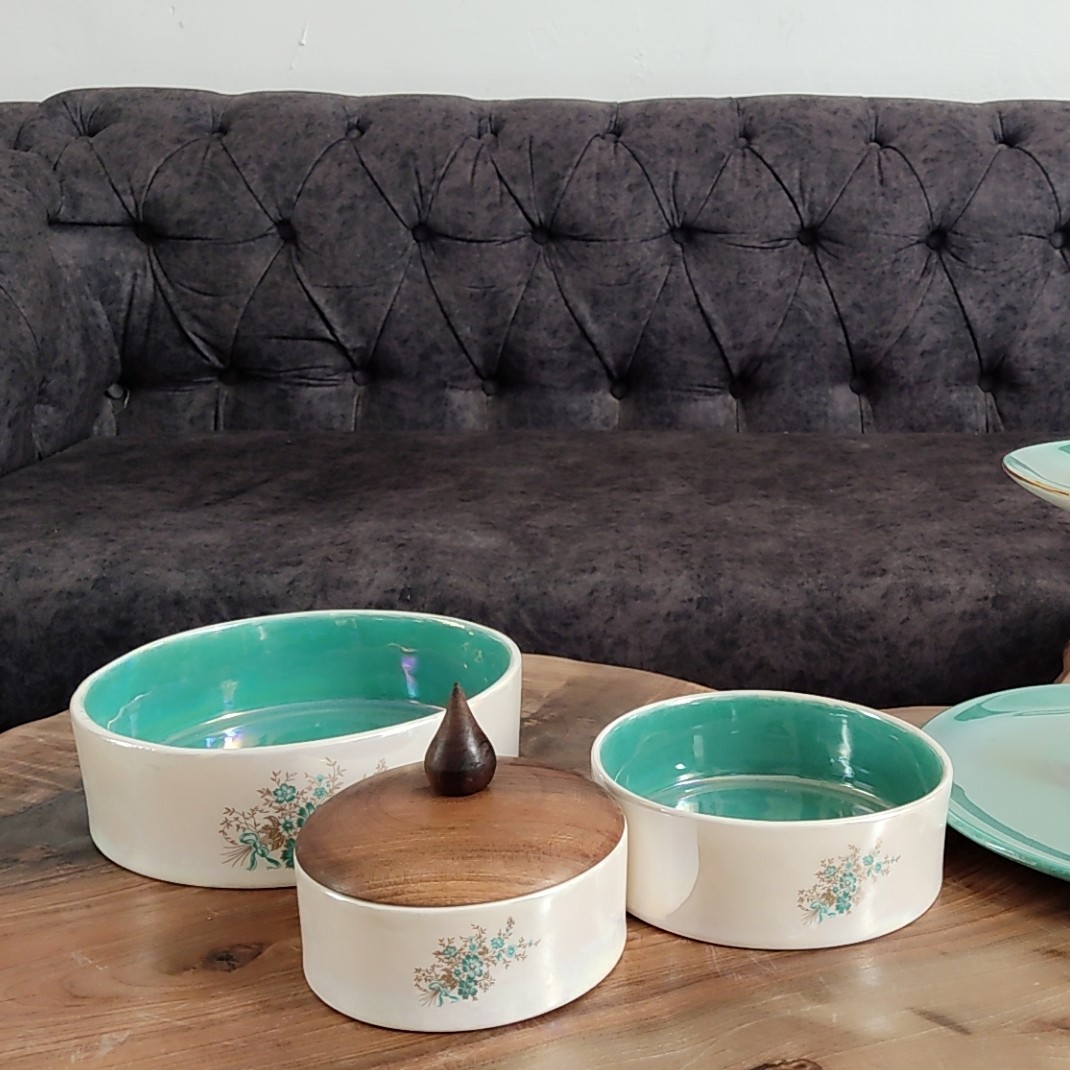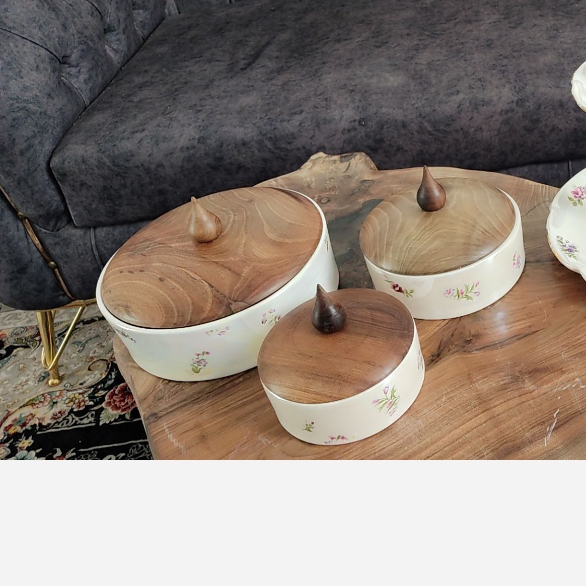ست سه تایی شکلات خوری درب دار با درب چوبی و لاستر صدفی خورده