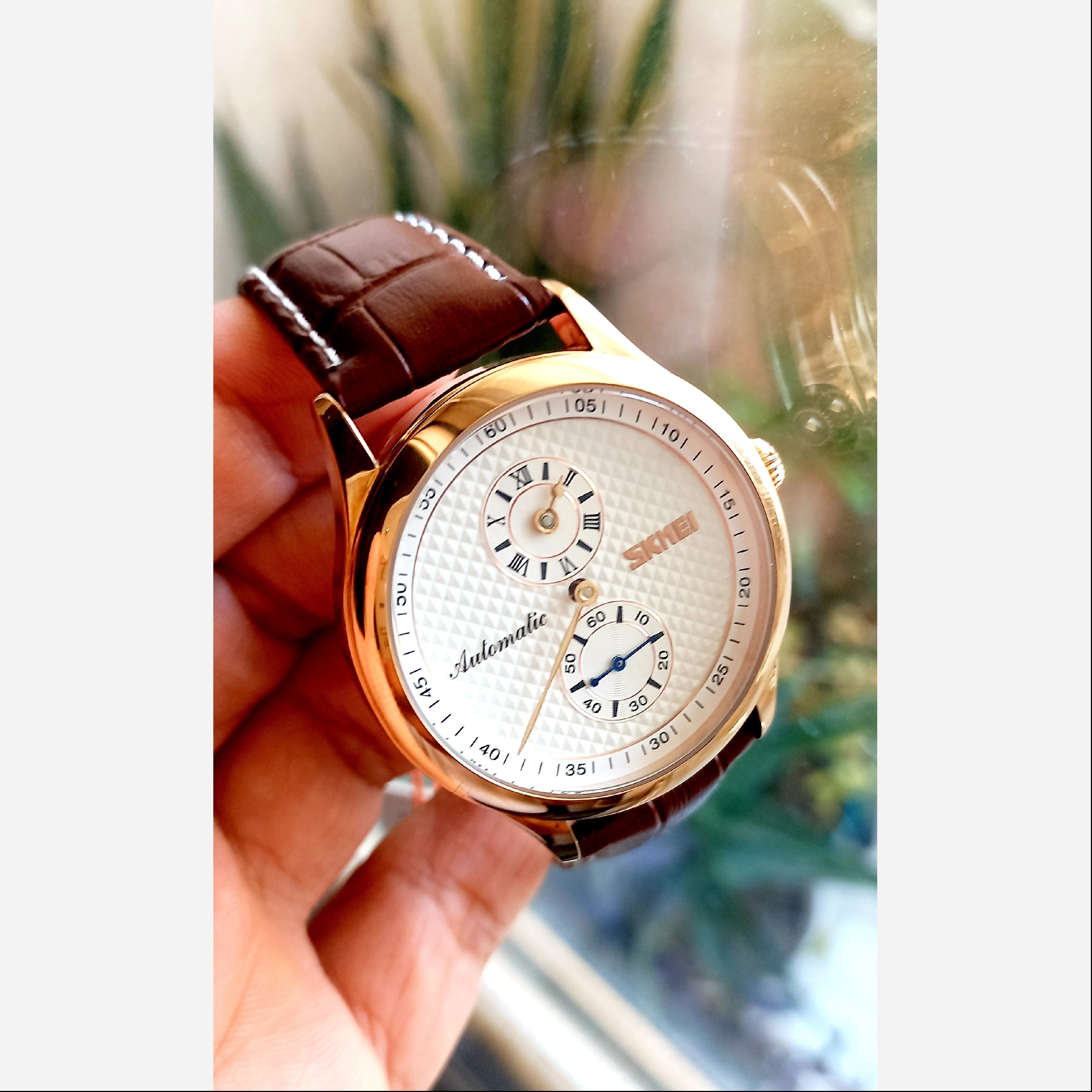 جهت دریافت تخفیف 400 هزار تومنی لطفا پیام بدین حتما حتما قبل از خرید و ثبت سفارش پیام بدین و از موجودی ساعت مطمئن بشید ساعت اسکمی skmei9238 اتوماتیک نبضی کوکی بدون نیاز به باتری طراحی خاص و کمیاب عقربه کوچک پایین : ثانیه شمار عقربه کوچک بالا : ساعت شمار عقربه وسط : دقیقه شمار پشت ساعت شیشه ای و موتور نمایان بند چرم با قفل سگکی آرم دار بهمراه جعبه فابریک شرکتی قیمت بازار بالای هشت میلیون