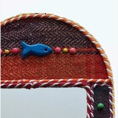 این آینه کار دست میباشد پشت آینه چوبی وروی کار با جاجیم دستباف پوشش داده و با مهرههای رنگی تزیین شده که زیبایی کار رو دوچندان کرده