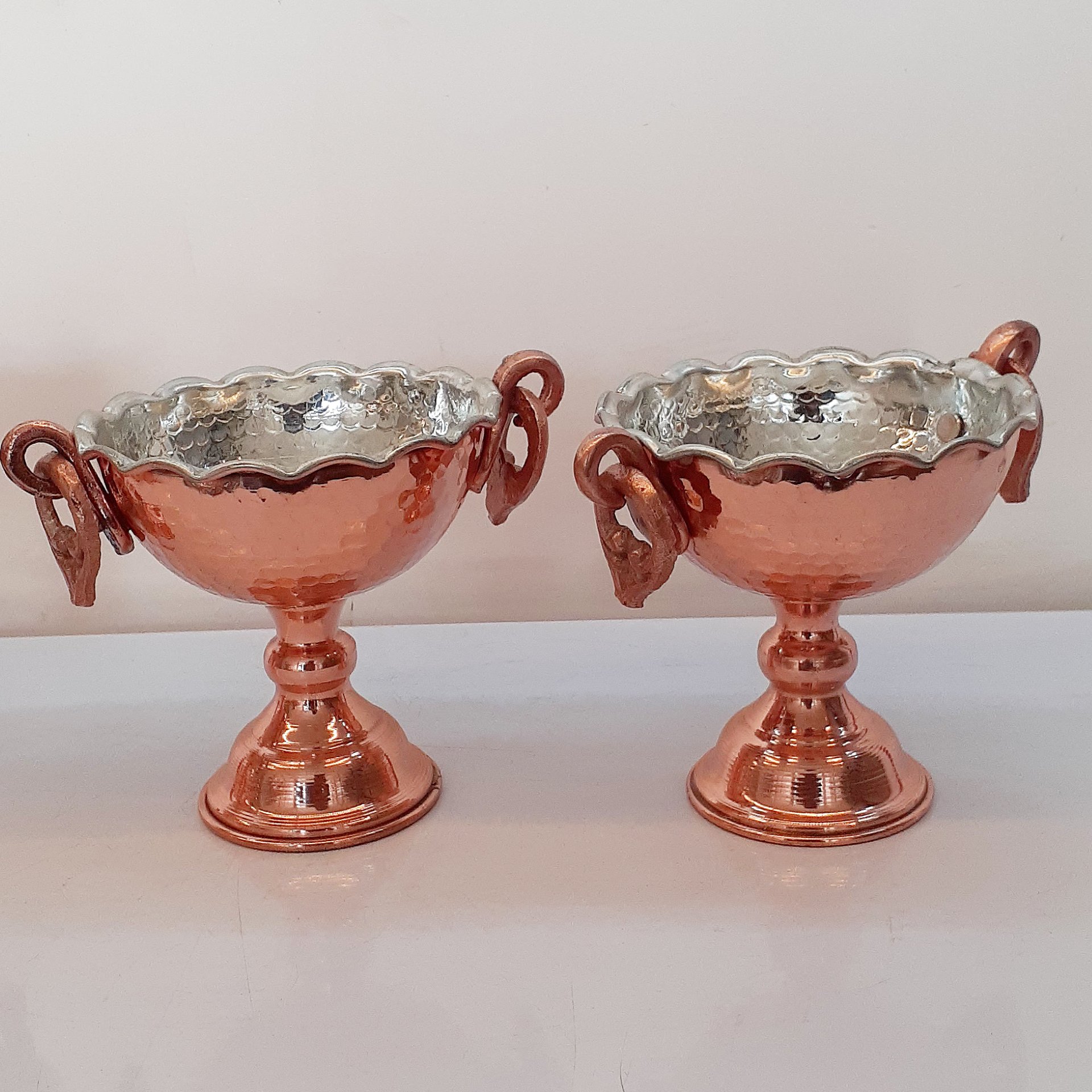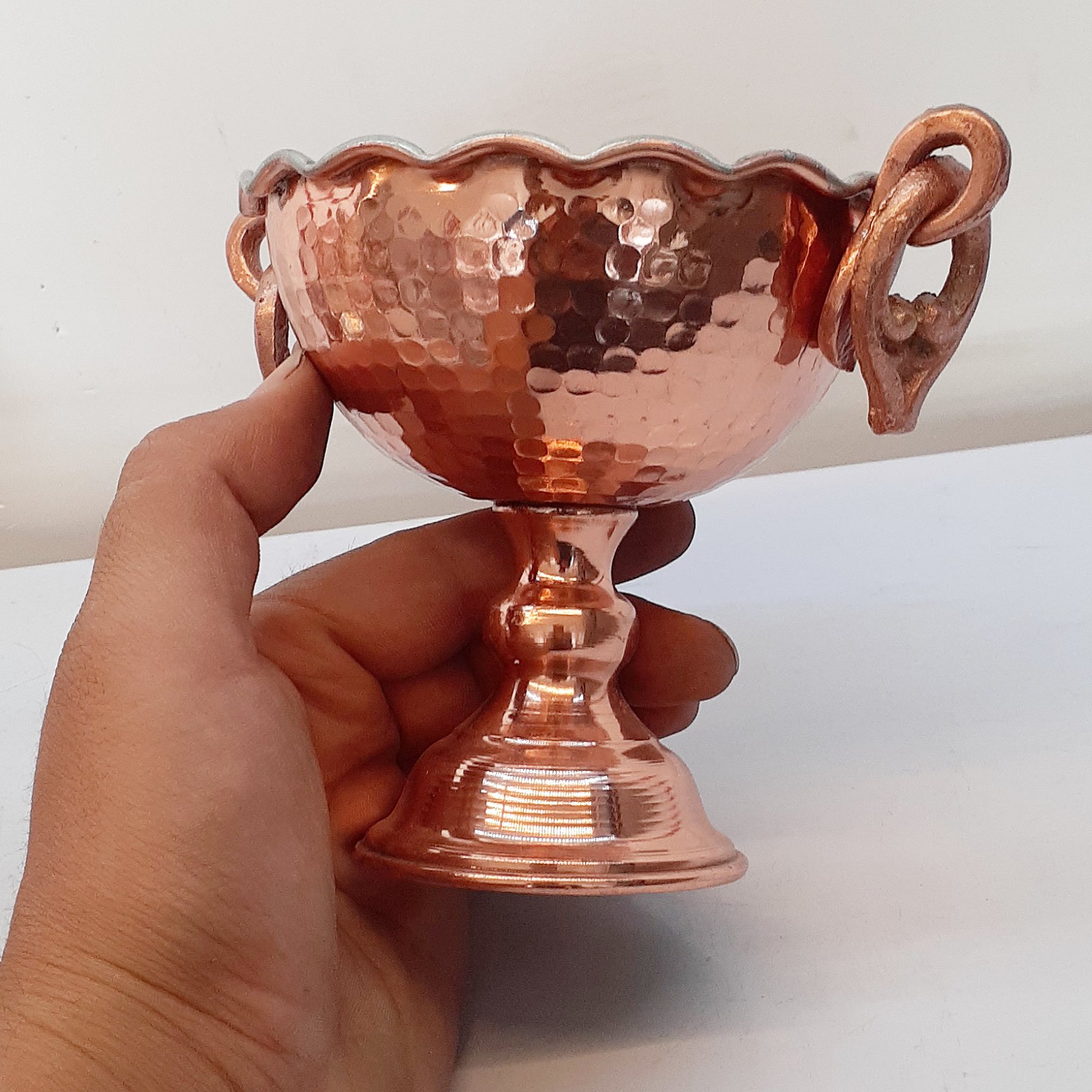 جام پسی اجیل خوری مسی تمام دست ساز تک پایه چکشی ، داخل قلع ، نانو شده ، ضمنا مدل 3 پایه هم موجود داریم، ارسال هم رایگانه، در صورت انجام دو خرید همزمان از کد تخفیف ۳۰ هزار تومانی messroz2 استفاده نمایید صنایع مس رز زنجان افتخار تولید و پخش ظروف مسی اصیل زنجان را دارد که بصورت سنتی تولید می شوند کیفیت عالی، بسته بندی خوب، ارسال رایگان و سریع و نانو بودن محصولات از ویژگی های غرفه ماست، نانو پوشش خیلی نازک از مواد خاص و مقاوم می باشد که روی ظروف مسی زنجان قرار می گیرد و در کوره های مخصوص به وسیله حرارت تثبیت می شود این پوشش نانو ظرف را در مقابل هوا و رطوبت محافظت کرده و از اکسید و کدر شدن جلو گیری می نماید . خواهشمندیم هنگام شستشو جهت ماندگاری ظروف مسی بخصوص ظروف مسی نانو شده و قلع شده از اسکاچ بدون سیم و نرم استفاده شود و بلافاصله با دستمال نرم خشگ گردد و از تماس انها با مواد شیمیایی مانند وایتکس و غیره خوداری گردد، ظروفی که در انها غذا پخته و سرو می شود باید داخل انها به وسیله فلز قلع پوشش داده شود، پوشش قلع باعث جلو گیری از حل شدن زیاد یون های مس در غذا می شود. عنصر مس نقش مهمی در مبارزه بدن با التهاب مزمن ، تشکیل سلول های قرمز خون، و افزایش ایمنی بدن دارد ، همچنین برای تشکیل میلین که برای اعصاب مانند عایق است، مورد نیاز می باشد، عنصر مس باعث نابودی میکروب های مختلف می شود بطوری که دستگیره درب ها و شیر های اب اطاق عمل را از جنس مس می سازند،