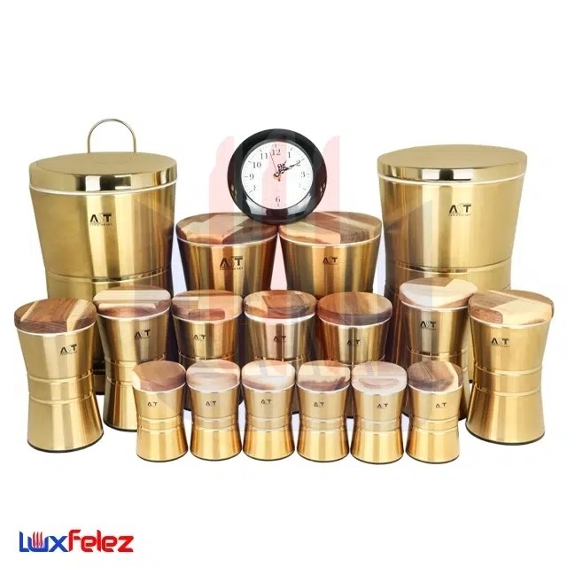 اقلام همراه سرویس شامل 1عدد سطل زباله،1عدد سطل برنج،2عدد بانکه قند و شکر،4عدد بانکه حبوبات سایز 1،1عدد بانکه حبوبات سایز 6،2 عدد جا ادویه،1عدد ساعت رومیزی
