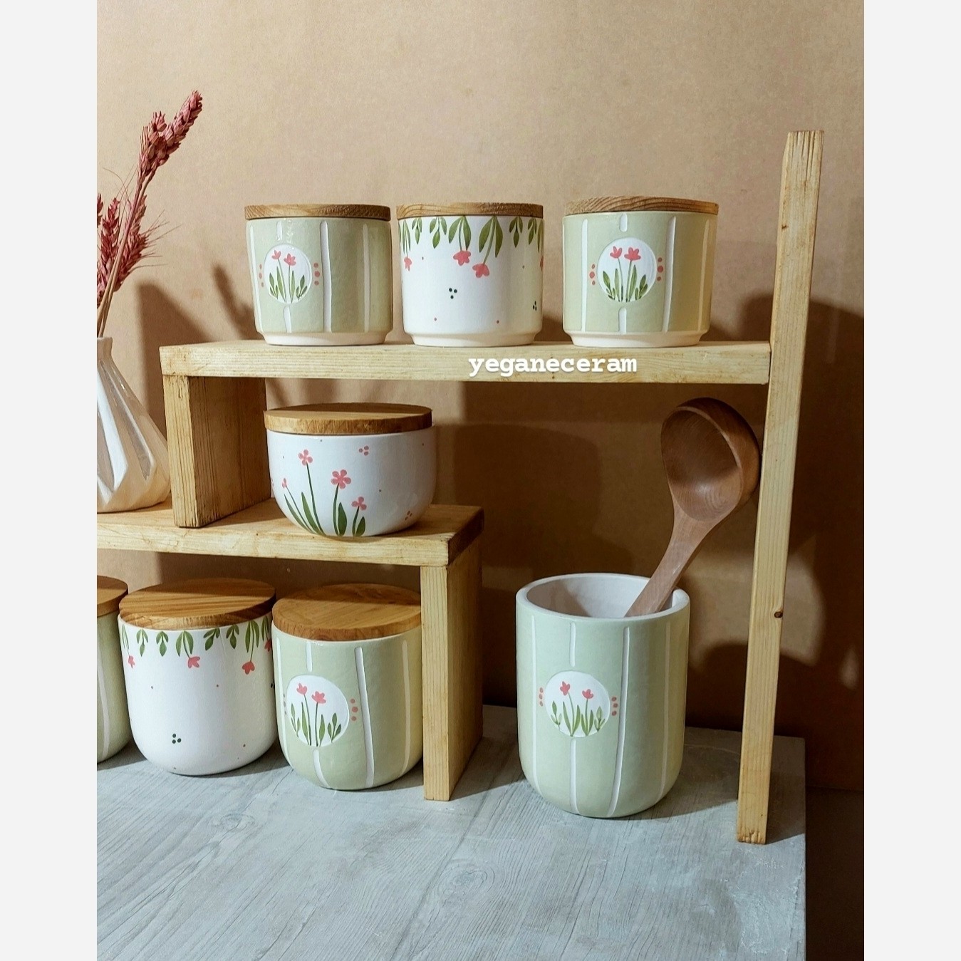 جنس سرامیک مصرفی و لعاب خورده . نقاشی شده با دست و رنگهای کوره ای دربها جنس چوب روس و واشردار قیمت درج شده محصول مربوط به ست کل بانکه های داخل عکس میباشد.