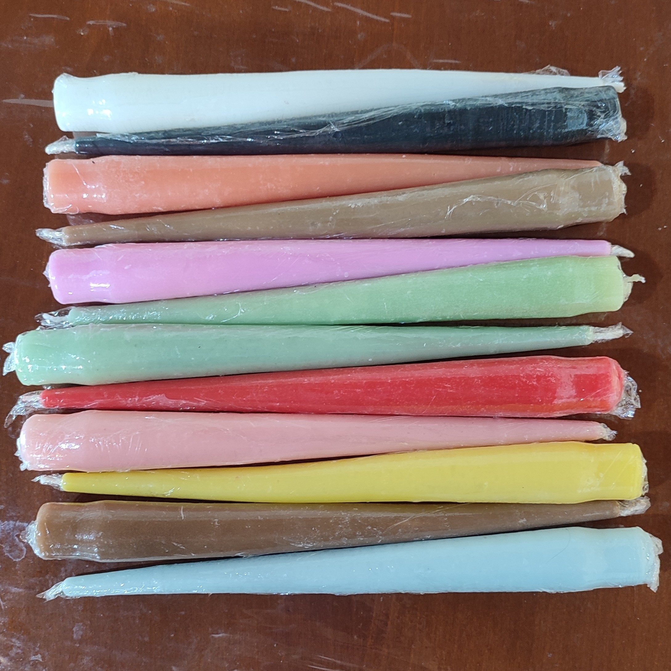 شمع های قلمی زیبا و پر کاربرد ،مناسب مراسمات وتزیین و هدیه و .. بسته های 10 تایی تک رنگ بسته 10 تایی همه رنگ سفید ،زرد،طلایی،مشکی ،سبز،ابی،قرمز،صورتی،نارنجی ،بنفش ،قهوه ای ،گلبهی سبز کم رنگ ،نیلی