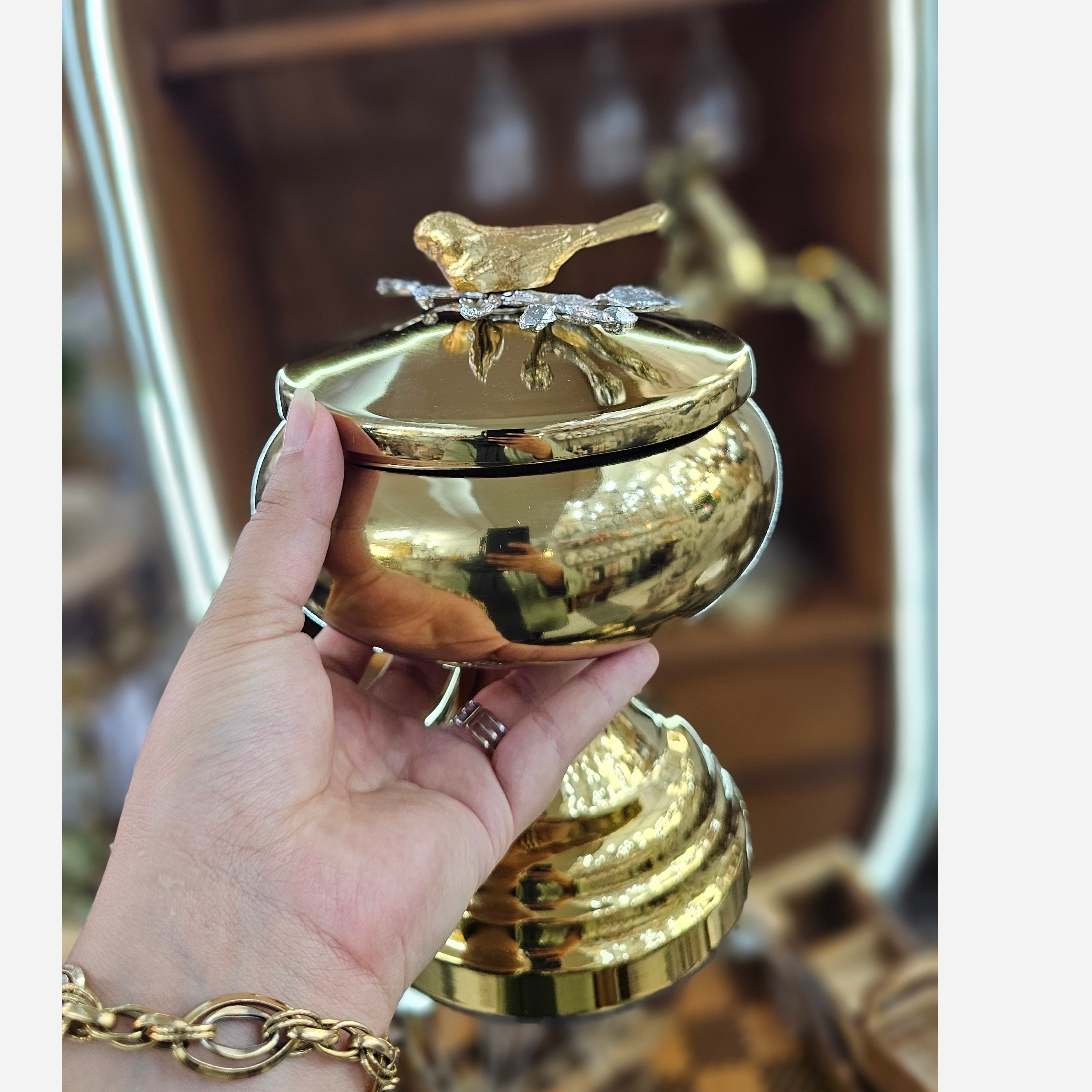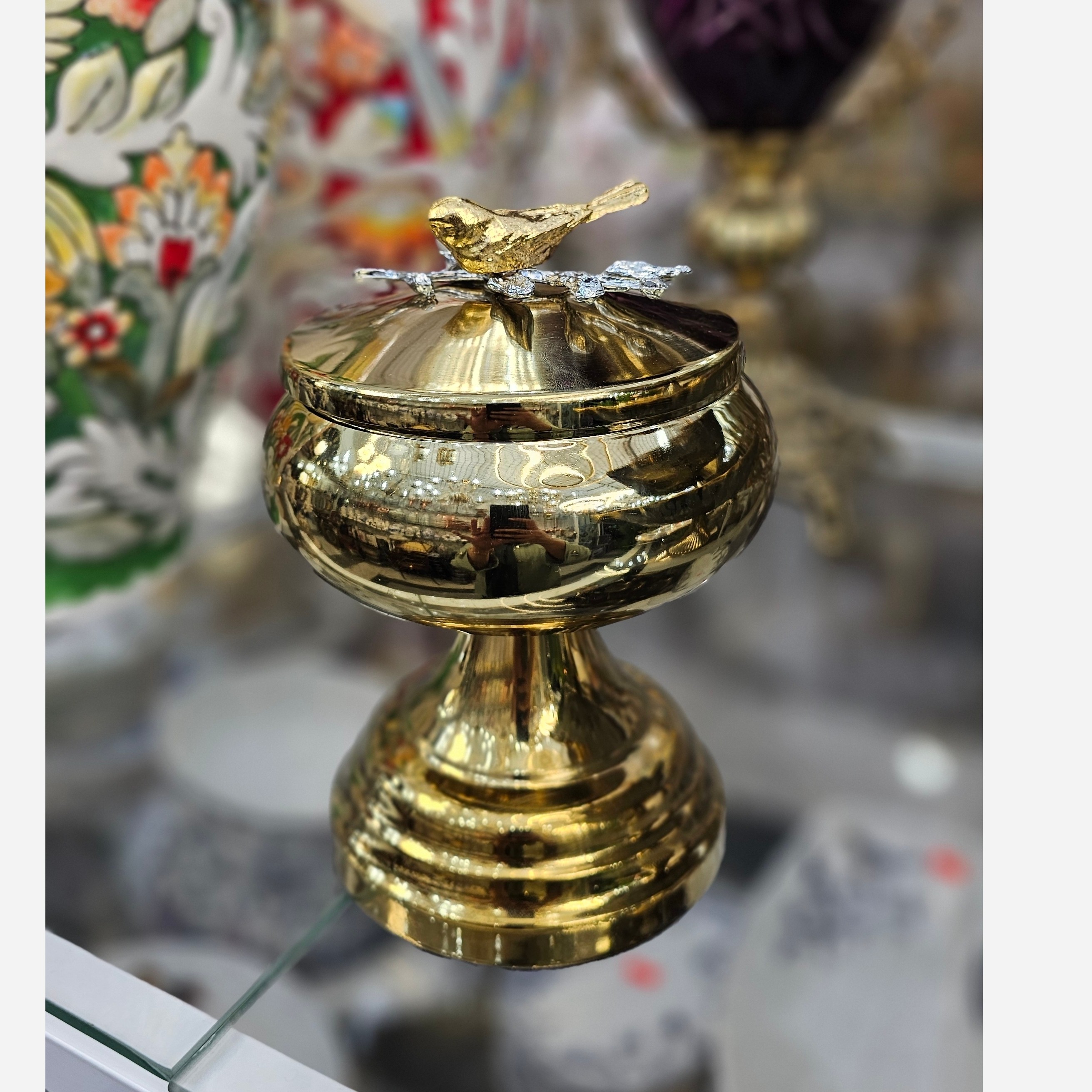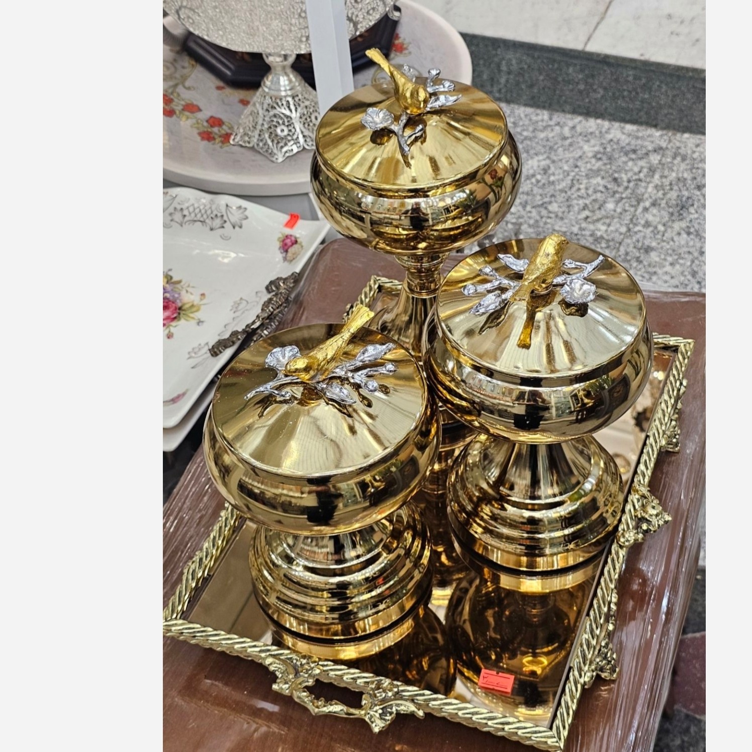 ظرف پذیرایی مناسب شکلات ،نبات،انجیر و آجیل و ... جنس فلز آبکاری رنگ ثابت قابل شستشو سه سایز باهم در غرفه موجوده تک سایز متوسط و کوچک موجوده
