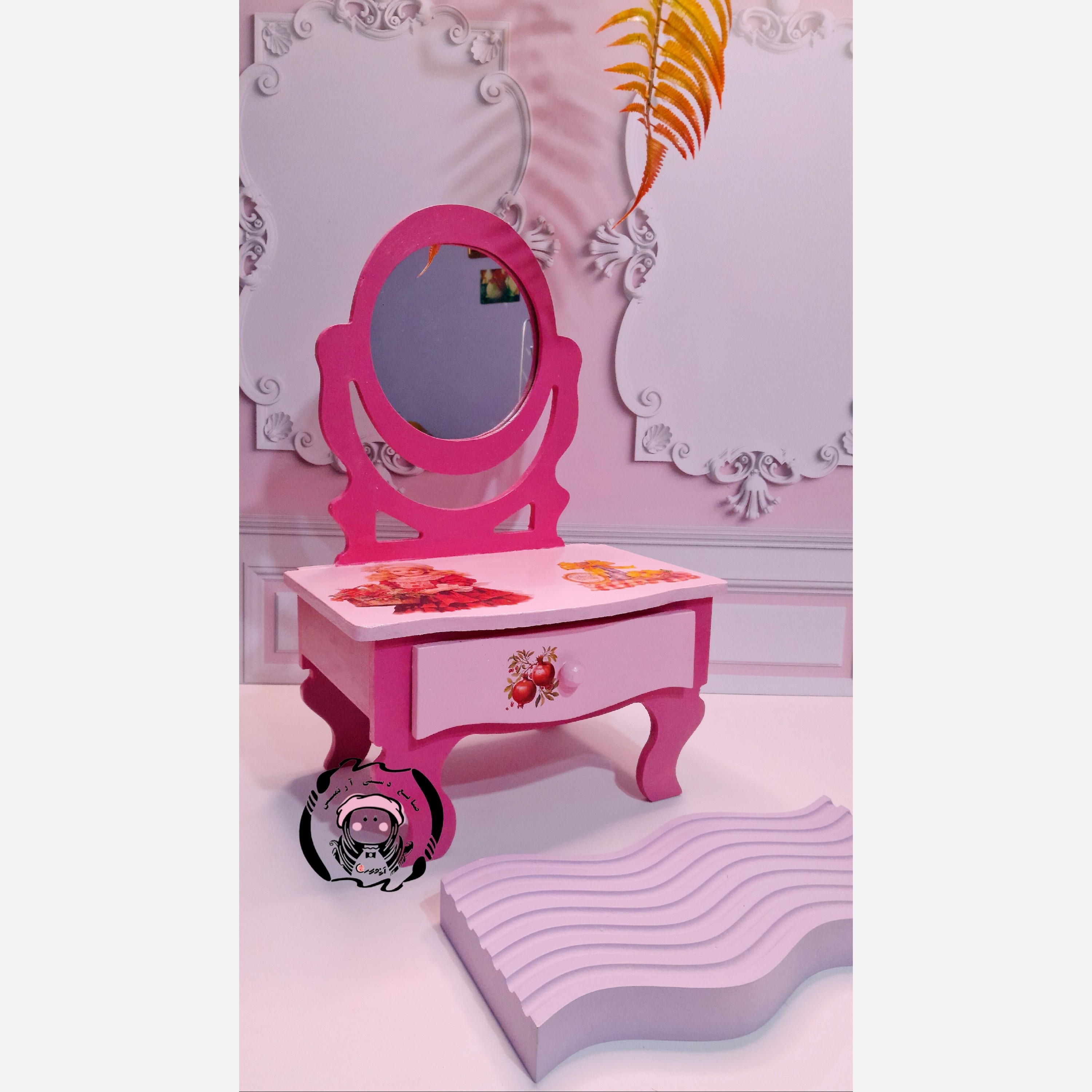 این میز یک میز آرایش مینیاتوری و فانتزی به رنگ صورتی تیره و صورتی روشن است. قاب آینه آن به شکل بیضی با طراحی منحنی و رنگ صورتی ساخته شده و روی صفحه میز دو تصویر چاپی با طرح عروسکی وجود دارد. کشوی کوچک جلو با یک دستگیره گرد صورتی روشن و طرح انار تزئین شده و پایههای میز نیز به شکل منحنی و ظریف طراحی شدهاند. ابعاد : طول 25 سانت ارتفاع 39 سانت رنگ : کشوها صورتی روشن . بدنه صورتی تیره .