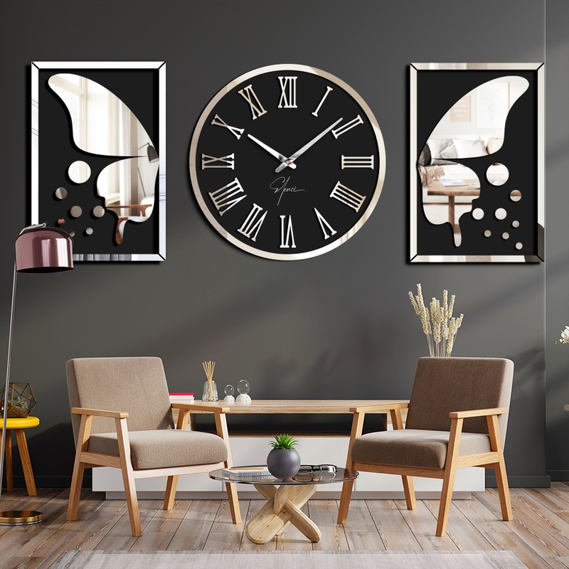 مجموعه ساعت و قاب آینه های کارولین، امکان پوشش یک دیوار کامل را دارد.کارولین از بدنه چوبی با رنگ آمیزی مات ساخته شده و زیبایی این محصول بعلت ترکیب بدنه مات تیره با پنل و فریم آینه ای براق است که روی دیوار خودنمایی می کند. طرفین ساعت کارولین، گوشواره های آینه ای با طرح پروانه قرار گرفته که امکان نصب با فاصله دلخواه نسبت به ساعت را دارند. از ویژگی ساعت و قاب آینه های کارولین، برجسته بودن فریم ، اعداد و پروانه ها بوسیله اسپیسر فومی است که سایه زیبایی رو صفحه ساعت و قاب آینه ها ایجاد می کند. قلب ساعت دیواری کارولین بوسیله موتور کوارتز اصل تایوان به حرکت در می آید. جنس قاب: MDF نحوه نمایش: عقربهای منبع انرژی: باتری نوع باتری: قلمی AA نمایش زمان: رومی مشخصات-ابعاد: 1800x600x35 میلیمتر مشخصات-وزن: 3 کیلوگرم مشخصات-قطر صفحه: 60 سانتیمتر مشخصات-جنس قاب: MDF مشخصات-نحوه نمایش: عقربهای مشخصات-منبع انرژی: باتری مشخصات-نوع باتری: قلمی AA مشخصات-نمایش زمان: رومی