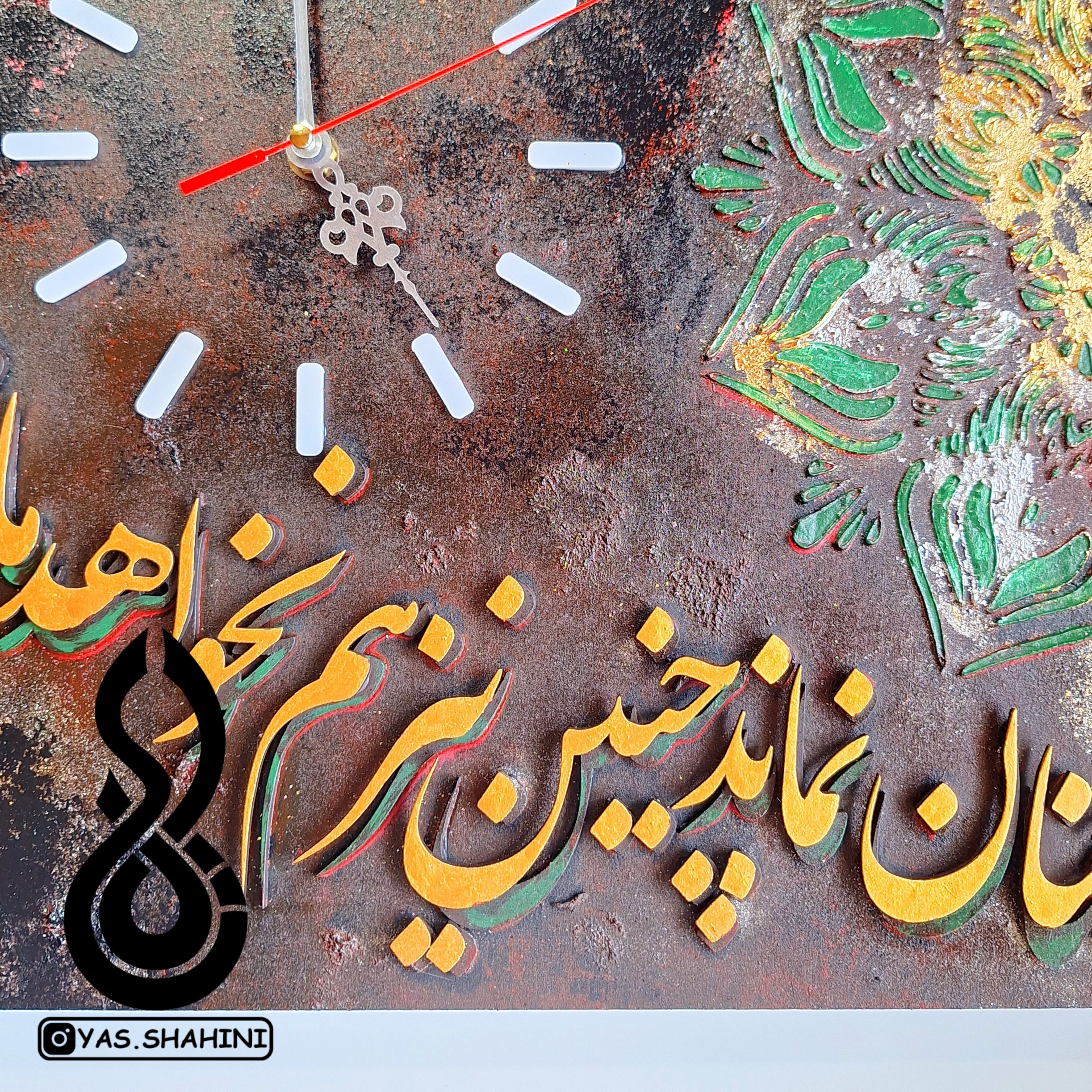 کاملا دست ساز به صورت برجسته کار شده با متریال با کفیت موتور عقربه جنس عالی سایز کار 45در 45 هست پشتش گیره اویز دارد رنگکاملا ثابت
