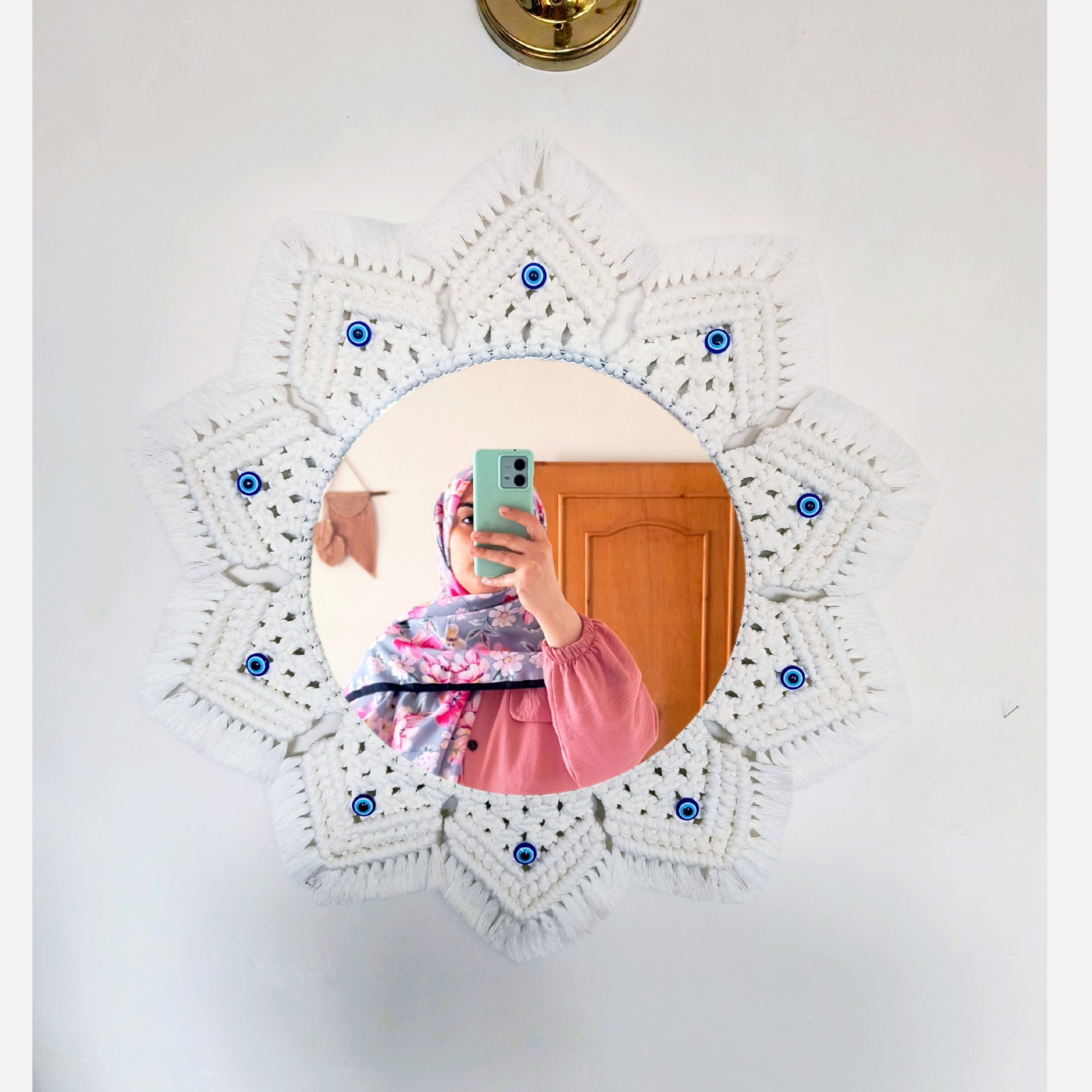 🔹آینه مکرومه بافی 🔹قطر آینه 30 سانتیمتر 🔹قطر کل کار 50 سانت 🔹دارای مهره چشم زخم 🔹استفاده شده از بهترین متریال 🔹آینه ضخیم و محکم