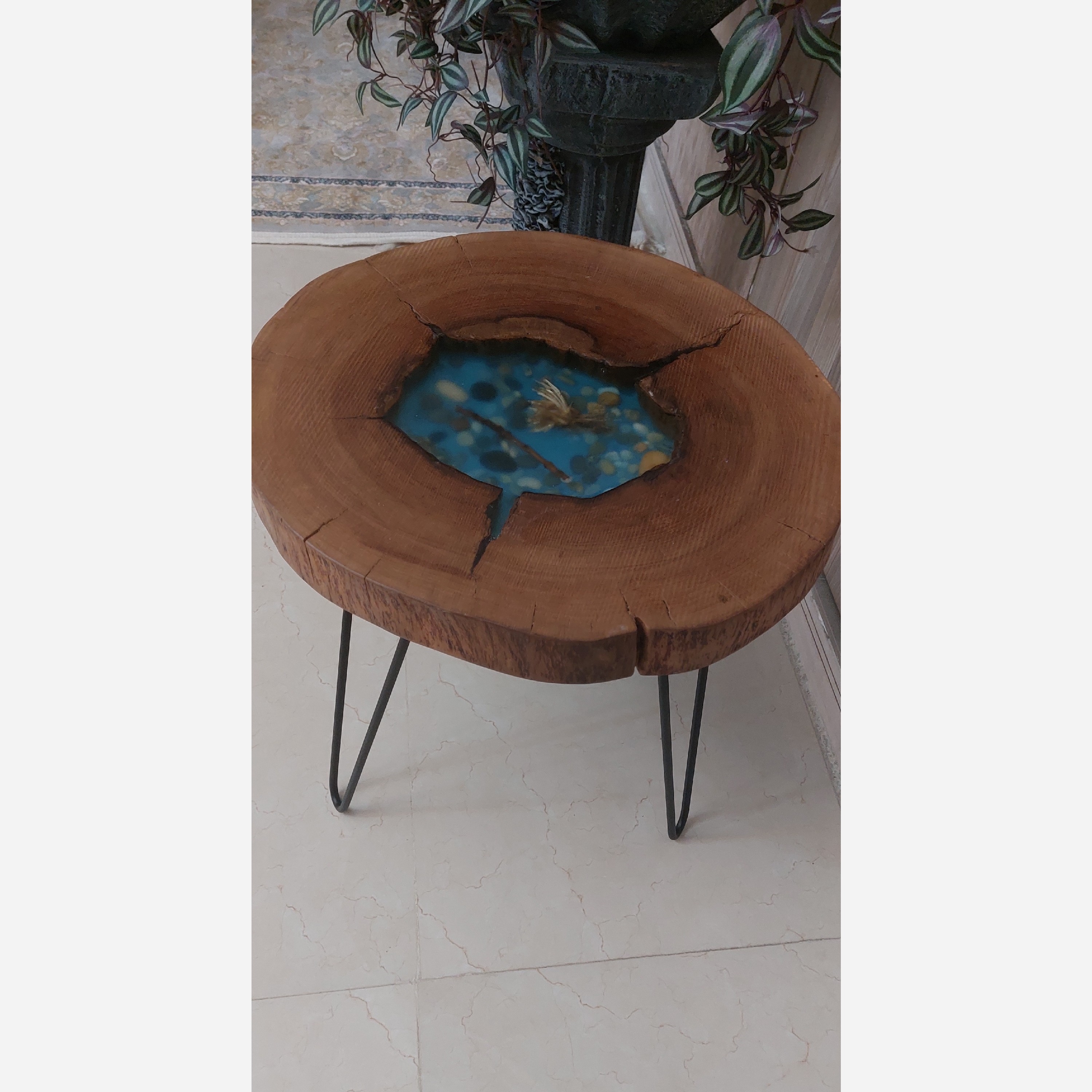 میز چوبی شیک وزیبا چوبی ورزینی پایه های میز فلزی با رنگ کوره ای ضد زنگ ارتفاع پایه ها 40 سانتی متر روی پایه ها حدود 7 سانتی متر بسیار شیک وجذاب که زیبایی خاصی به منزل شما می دهد