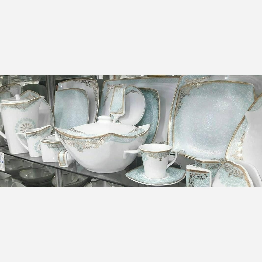 سرویس چینی پردیس طرح دنیا فیروزه 105 پارچه 12 نفره جنس درجه یک با قابلیت فر و ماشین