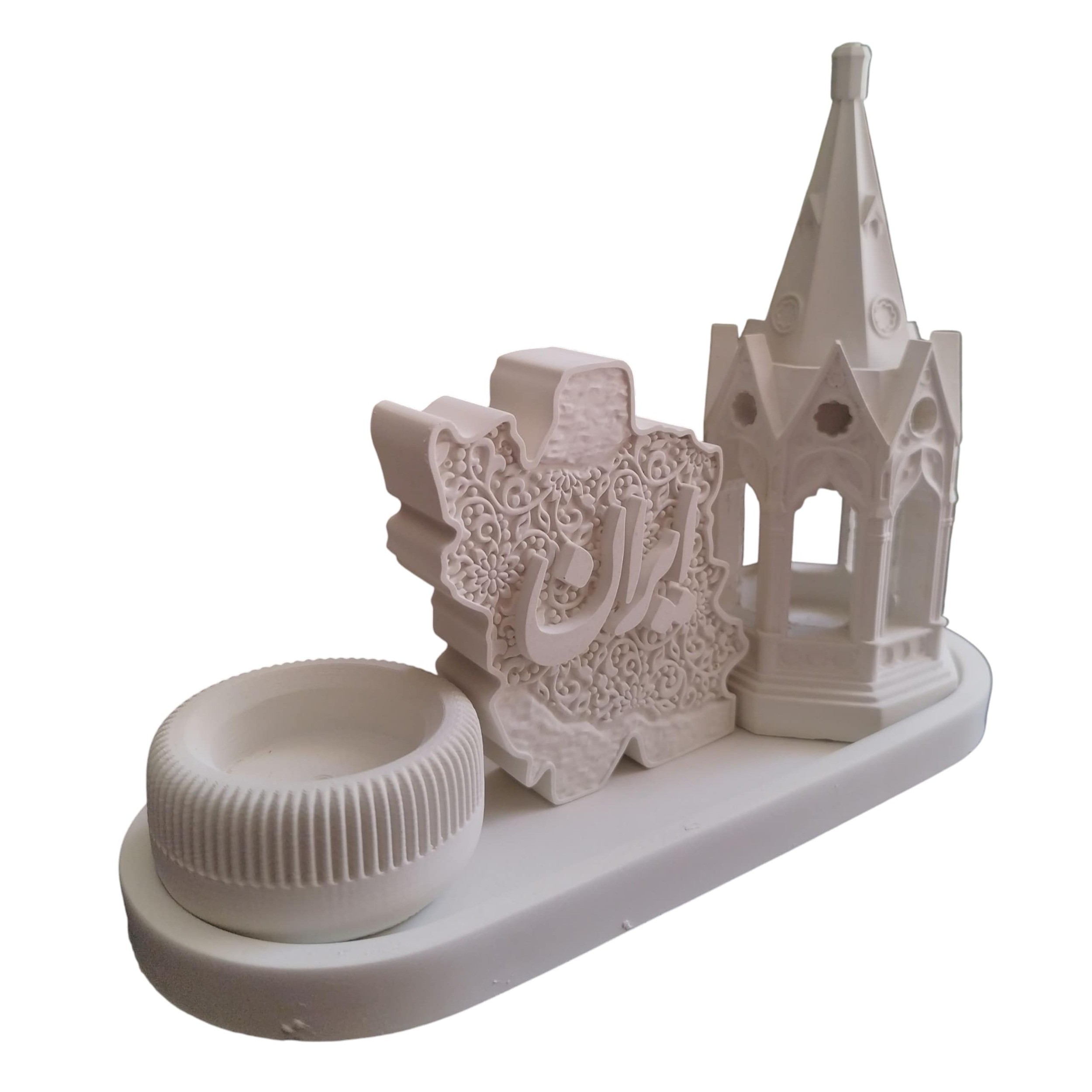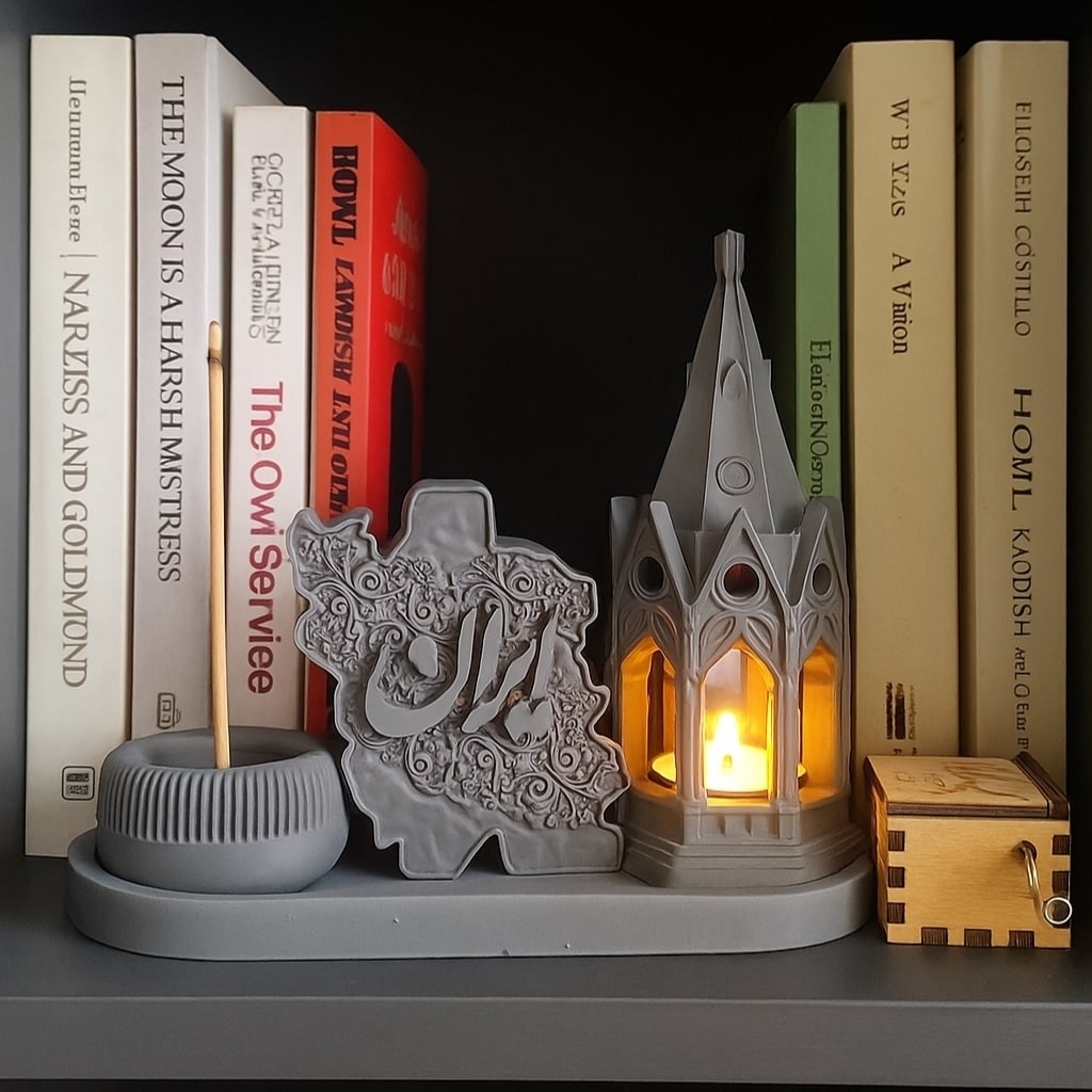 این محصول یک ست دکوری خاص و چشمنواز است که با طراحی مینیمال و ترکیب عناصر فرهنگی، مذهبی و سنتی جلوهای منحصر بهفرد به فضای خانه یا محل کار شما میبخشد. این ست شامل یک سینی پایه، جاوارمری به شکل کلیسا، مجسمه ایران، جاعودی و شمع وارمری است که هم کاربردی و هم تزئینی میباشد. سینی پایه با ابعاد طول 24 سانتیمتر و عرض 9.8 سانتیمتر طراحی ساده و ظریفی دارد و امکان چیدمان مرتب اجزا را فراهم میکند. جاوارمری طرح کلیسا با طول و عرض 8 سانتیمتر و ارتفاع 18.5 سانتیمتر دارای محفظه داخلی برای قرار دادن وارمر یا شمع کوچک است و با طراحی برجمانند و پنجرههای زیبا هنگام روشن شدن شمع نوری ملایم و آرامبخش ایجاد میکند. مجسمه ایران با ارتفاع 10 سانتیمتر به شکل نقشه ایران طراحی شده و همراه با خطاطی ظریف و هنری نمادی فرهنگی و ملی برای علاقهمندان به هنر ایرانی به شمار میرود. جاعودی با قطر 6 سانتیمتر و ارتفاع 3 سانتیمتر طراحی ساده و مدرنی دارد و با قابلیت نگهداری عود فضایی خوشبو و آرامشبخش به محیط میبخشد. این محصول با طراحی خاص و مدرن و الهام از فرهنگ و هنر ایرانی انتخابی مناسب برای دکوراسیون منزل، محل کار یا هدیهای خاص و ماندگار است و با ترکیب نور شمع و رایحه عود فضایی آرام و دلنشین ایجاد میکند. رنگ سفید این ست نیز باعث میشود با هر سبک دکوراسیونی بهراحتی هماهنگ شود و جلوهای متفاوت به محیط شما ببخشد.