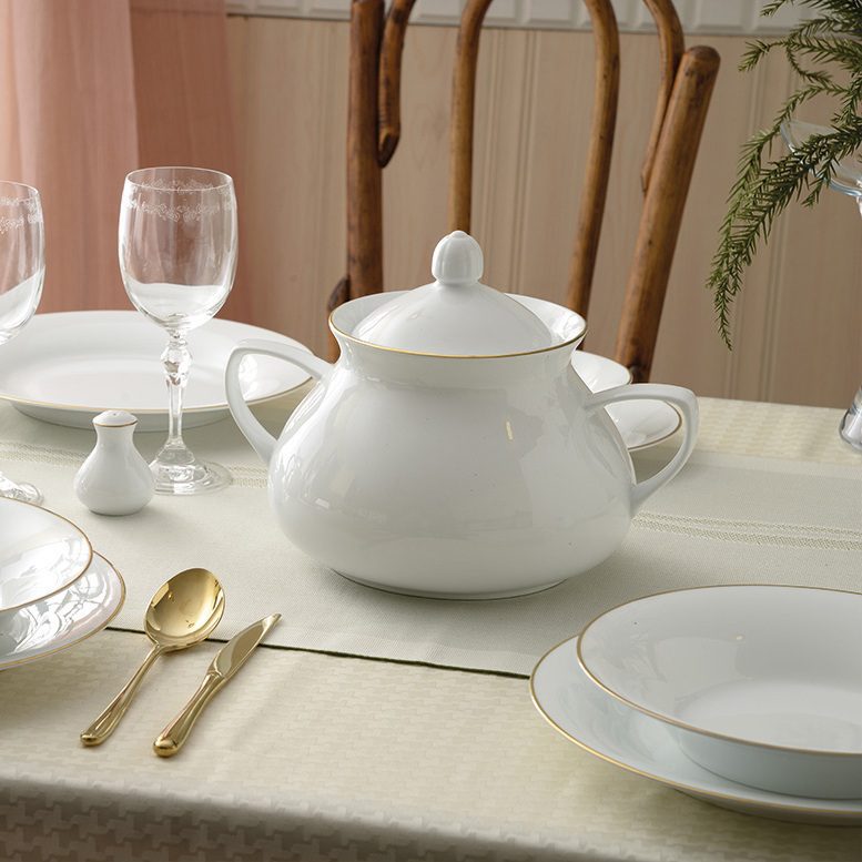 سرویس غذاخوری شهرزاد لومیو 35 پارچه چینی زرین سرویس غذاخوری شهرزاد لومیو 35 پارچه چینی زرین و یا 6 نفره شامل 35 پارچه به شرح زیر میباشد: دیس: دو عدد با قطر + سانتی متر بشقاب غذا خوری: شش عدد با قطر 27 سانتی متر بشقاب خورش خوری: شش عدد با قطر 23 سانتی متر بشقاب میوه خوری: شش عدد با قطر 20 سانتی متر سالاد خوری بزرگ: یک عدد با قطر 26 سانتی متر پیاله 18: شش عدد با قطر 18 سانتی متر سالاد خوری کوچک: شش عدد با قطر 14 سانتی متر نمک پاش: یک عدد با گنجایش 40 سی سی فلفل پاش: یک عدد با گنجایش 40 سی سی درباره پیکره شهرزاد شهرزاد را می توان آغاز یک تحول بزرگ در تولید چینی در ایران دانست. چینی زرین ایران با تولید این قالب از تکنولوژی جدید خود در تولید چینی پرده برداری کرد. قوس های اغراق شده و کشیدگی های منحصر به فرد، این سری چینی زرین را متمایز کرده است. طراح قالب شهرزاد از فرم بدن زن الهام گرفته است و با اغراق در فرم های انتزاعی دست به طراحی زده است. ظروف در قالب شهرزاد بزرگتر از دیگر قالب های چینی زرین طراحی شده اند که احساسی از تجمل و شکوه را به بیننده القا می کند و باعث می شود مجلسی تر از دیگر ظروف به نظر آیند. قالب شهرزاد چینی زرین به صورت سرویس های چینی 12 نفره کامل ، سرویس های 6 نفره غذاخوری ، سرویس 6 نفره چای خوری کامل و سرویس 6 نفره چای خوری .تولید و عرضه می شوند. درباره نگاره لومیو چینی طرح لومیو یکی از مدل های سری شهرزاد چینی زرین است، این طرح را می توان همان طرح زرین دانست که پیش از این بر روی قالب های ایتالیا¬اف، کواترو و وینچی الیسه شاهد آن بوده ایم. طرح لومیو همچون طرح زرین شامل یک خط طلایی است که دور لبه ظروف را پوشانده است و جلوه ای زیبا به ظروف داده است. بدنه شفاف، ظریف، سفید و در عین حال براق ظروف چینی سری شهرزاد با این خطوط طلایی زیبایی دوچندانی پیدا می کنند و محصولی بی بدیل بوجود می آورند. طرح لومیو همچون دیگر ظروف چینی زرین قابل شست و شو در ماشین ظرفشویی می باشد ولی به علت استفاده از طلا در دکور این ظروف، آن ها را نمی توان در مایکروفر قرار داد. طرح لومیو از سری شهرزاد چینی زرین بر روی سرویس های 12 نفره کامل 108 پارچه، 6 نفره 35 پارچه غذاخوری و 6 نفره چای خوری تولید و عرضه می شود. توصیه هایی برای نگهداری بهتر نظر به اینکه در طرح روی سرویس چینی منتخب شما طلا یا پلاتین به کار رفته است، رعایت نکات زیر به حفظ زیبایی و آراستگی ظاهر سرویس چینی شما برای سالیان دراز کمک می کند. استفاده از مواد سفید کننده مانند وایتکس، برای سلامتی انسان مضر است. لیکن در صورت نیاز از محلول رقیق شده در زمان کوتاه استفاده نمایید وحتی المقدور از تماس مستقیم این مواد با طرح روی ظروف جلوگیری کنید. پیشنهاد می شود از پودر ظرفشویی مرغوب به عنوان جایگزین سفیدکننده استفاده نمایید. پایه های ظروف چینی بنا به ضرورت های فنی تولید فاقد لعاب است و اگرچه به دقت صیقل داده می شوند، به علت سختی بسیار بالای بدنه چینی می تواند روی سطح لعاب ظروف زیرین و یا میزهای شیشه ای خط و خش ایجاد نماید. به همین دلیل پیشنهاد می شود در زمان دسته کردن ظروف تخت از ساییده شدن شدید آنها روی یکدیگر جلوگیری نمایید. قرار دادن یک دستمال بین ظروف به این منظور کمک می کند. معرفی چینی زرین ایران چینی زرین ایران معتبرترین تولیدکننده ظروف چینی در خاورمیانه و یکی از مدرن ترین کارخانجات این صنعت در جهان است. به همین سبب قادر بوده است محصولات خود را به بیش از 20 کشور عمدتا اروپایی نظیر آلمان، اسپانیا، ایتالیا، فرانسه، انگلستان، سوئد، هلند، ترکیه، روسیه، کانادا، عربستان، امارات متحده عربی و هندوستان صادر نماید. صنایع چینی زرین ایران به عنوان یکی از اعضای پیشرو انجمن تحقیق و توسعه ایران همواره توجه ویژه ای را به این بخش معطوف داشته است. این شرکت بارها به عنوان صــادرکننده و تولیدکننده نمونه کشور و همچنین واحد نمونه بیمه و صنعت سبز ملی برگزیده شده است و گواهینامه های رعایت حقوق مصرف کننده، صادرات به اروپا