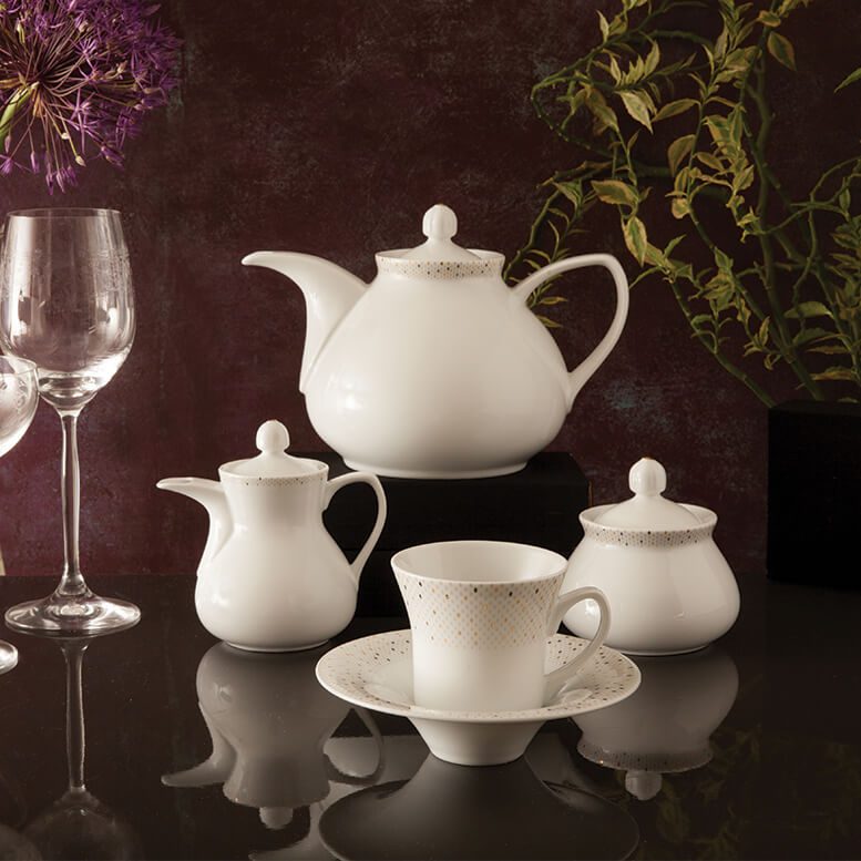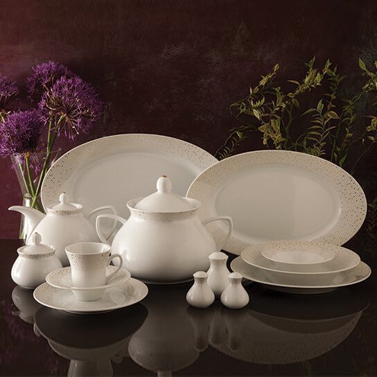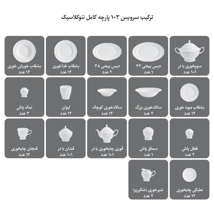 سرویس غذاخوری شهرزاد سان رایز 108 پارچه چینی زرین سرویس غذاخوری شهرزاد سان رایز 108 پارچه چینی زرین و یا 12 نفره شامل 108 پارچه به شرح زیر میباشد: پیاله 18: شش عدد با قطر 18 سانتی متر پیاله21: سه عدد با قطر 21 سانتی متر سوپ خوری با در: یک عدد با گنجایش 2700 سی سی سالاد خوری بزرگ: دو عدد با قطر 26 سانتیمتر سالاد خوری کوچک: دوازده عدد با قطر 14سانتیمتر دیس: سه عدد با قطر + سانتیمتر بشقاب غذا خوری: دوازده عدد با قطر 27 سانتیمتر بشقاب خورش خوری: دوازده عدد با قطر 23سانتیمتر بشقاب میوه خوری: هجده عدد با قطر 20 سانتیمتر قوری چای خوری با در: با گنجایش 1300 سی سی فنجان: دوازده عدد با قطر 8 سانتیمتر نعلبکی: دوازده عدد با قطر 15 سانتیمتر قندان با در: یک عدد با گنجایش 300 سی سی شکر ریز: دو عدد با گنجایش 280 سی سی نمک پاش: شش عدد با گنجایش 40 سی سی درباره پیکره شهرزاد شهرزاد را می توان آغاز یک تحول بزرگ در تولید چینی در ایران دانست. چینی زرین ایران با تولید این قالب از تکنولوژی جدید خود در تولید چینی پرده برداری کرد. قوس های اغراق شده و کشیدگی های منحصر به فرد، این سری چینی زرین را متمایز کرده است. طراح قالب شهرزاد از فرم بدن زن الهام گرفته است و با اغراق در فرم های انتزاعی دست به طراحی زده است. ظروف در قالب شهرزاد بزرگتر از دیگر قالب های چینی زرین طراحی شده اند که احساسی از تجمل و شکوه را به بیننده القا می کند و باعث می شود مجلسی تر از دیگر ظروف به نظر آیند. قالب شهرزاد چینی زرین به صورت سرویس های چینی 12 نفره کامل ، سرویس های 6 نفره غذاخوری ، سرویس 6 نفره چای خوری کامل و سرویس 6 نفره چای خوری .تولید و عرضه می شوند. درباره نگاره سان رایز شهرزاد را می توان آغاز یک تحول بزرگ در تولید چینی در ایران دانست. چینی زرین ایران با تولید این قالب از تکنولوژی جدید خود در تولید چینی پرده برداری کرد. قوس های اغراق شده و کشیدگی های منحصر به فرد، این سری چینی زرین را متمایز کرده است. طراح قالب شهرزاد از فرم بدن زن الهام گرفته است و با اغراق در فرم های انتزاعی دست به طراحی زده است. ظروف در قالب شهرزاد بزرگتر از دیگر قالب های چینی زرین طراحی شده اند که احساسی از تجمل و شکوه را به بیننده القا می کند و باعث می شود مجلسی تر از دیگر ظروف به نظر آیند. قالب شهرزاد چینی زرین به صورت سرویس های چینی 12 نفره کامل ، سرویس های 6 نفره غذاخوری ، سرویس 6 نفره چای خوری کامل و سرویس 6 نفره چای خوری .تولید و عرضه می شوند. توصیه هایی برای نگهداری بهتر نظر به اینکه در طرح روی سرویس چینی منتخب شما طلا یا پلاتین به کار رفته است، رعایت نکات زیر به حفظ زیبایی و آراستگی ظاهر سرویس چینی شما برای سالیان دراز کمک می کند. استفاده از مواد سفید کننده مانند وایتکس، برای سلامتی انسان مضر است. لیکن در صورت نیاز از محلول رقیق شده در زمان کوتاه استفاده نمایید وحتی المقدور از تماس مستقیم این مواد با طرح روی ظروف جلوگیری کنید. پیشنهاد می شود از پودر ظرفشویی مرغوب به عنوان جایگزین سفیدکننده استفاده نمایید. پایه های ظروف چینی بنا به ضرورت های فنی تولید فاقد لعاب است و اگرچه به دقت صیقل داده می شوند، به علت سختی بسیار بالای بدنه چینی می تواند روی سطح لعاب ظروف زیرین و یا میزهای شیشه ای خط و خش ایجاد نماید. به همین دلیل پیشنهاد می شود در زمان دسته کردن ظروف تخت از ساییده شدن شدید آنها روی یکدیگر جلوگیری نمایید. قرار دادن یک دستمال بین ظروف به این منظور کمک می کند. معرفی چینی زرین ایران چینی زرین ایران معتبرترین تولیدکننده ظروف چینی در خاورمیانه و یکی از مدرن ترین کارخانجات این صنعت در جهان است. به همین سبب قادر بوده است محصولات خود را به بیش از 20 کشور عمدتا اروپایی نظیر آلمان، اسپانیا، ایتالیا، فرانسه، انگلستان، سوئد، هلند، ترکیه، روسیه، کانادا، عربستان، امارات متحده عربی و هندوستان صادر نماید. صنایع چینی زرین ایران به عنوان یکی از اعضای پیشرو انجمن تحقیق و توسعه ایران همواره توجه ویژه ای را به این بخش معطوف دا
