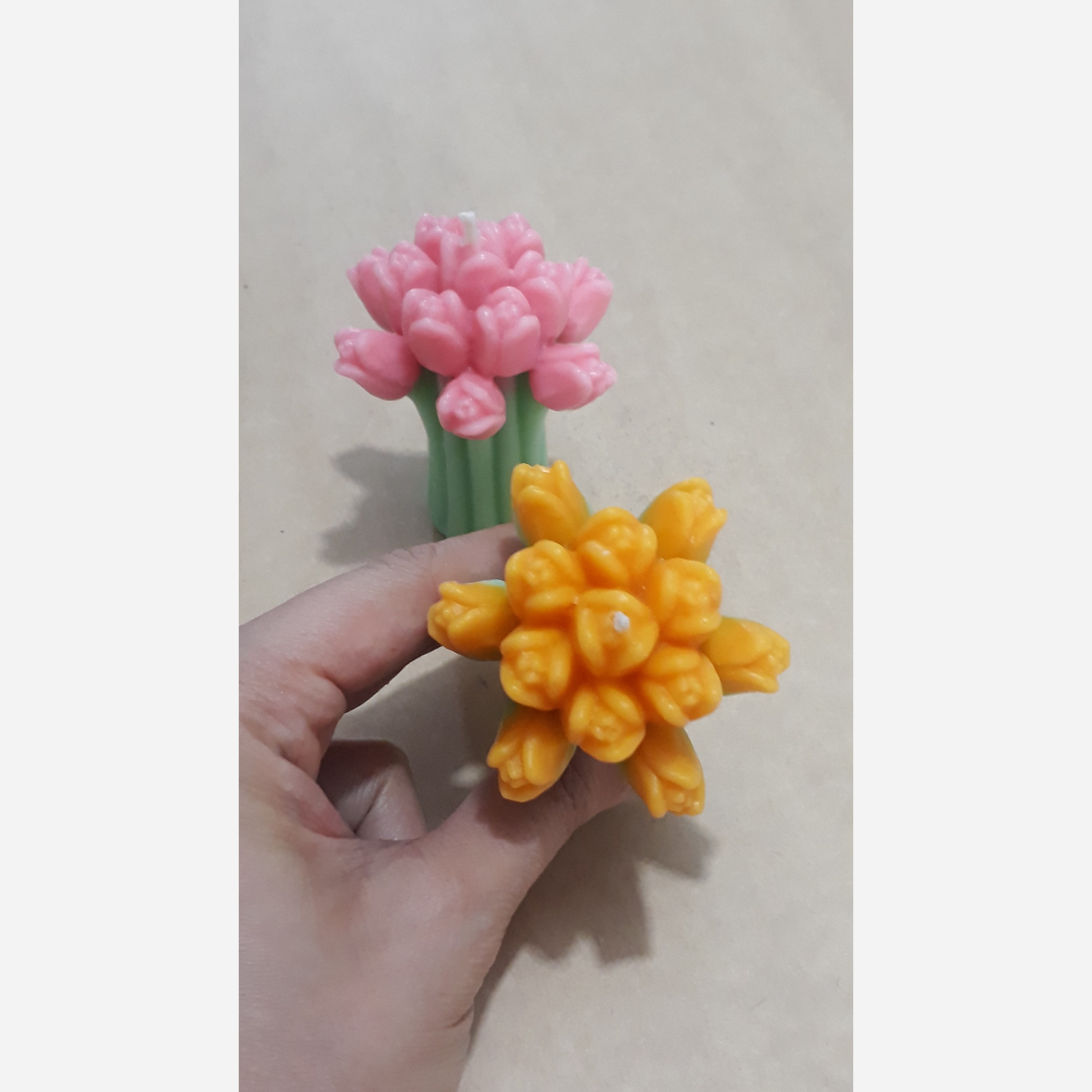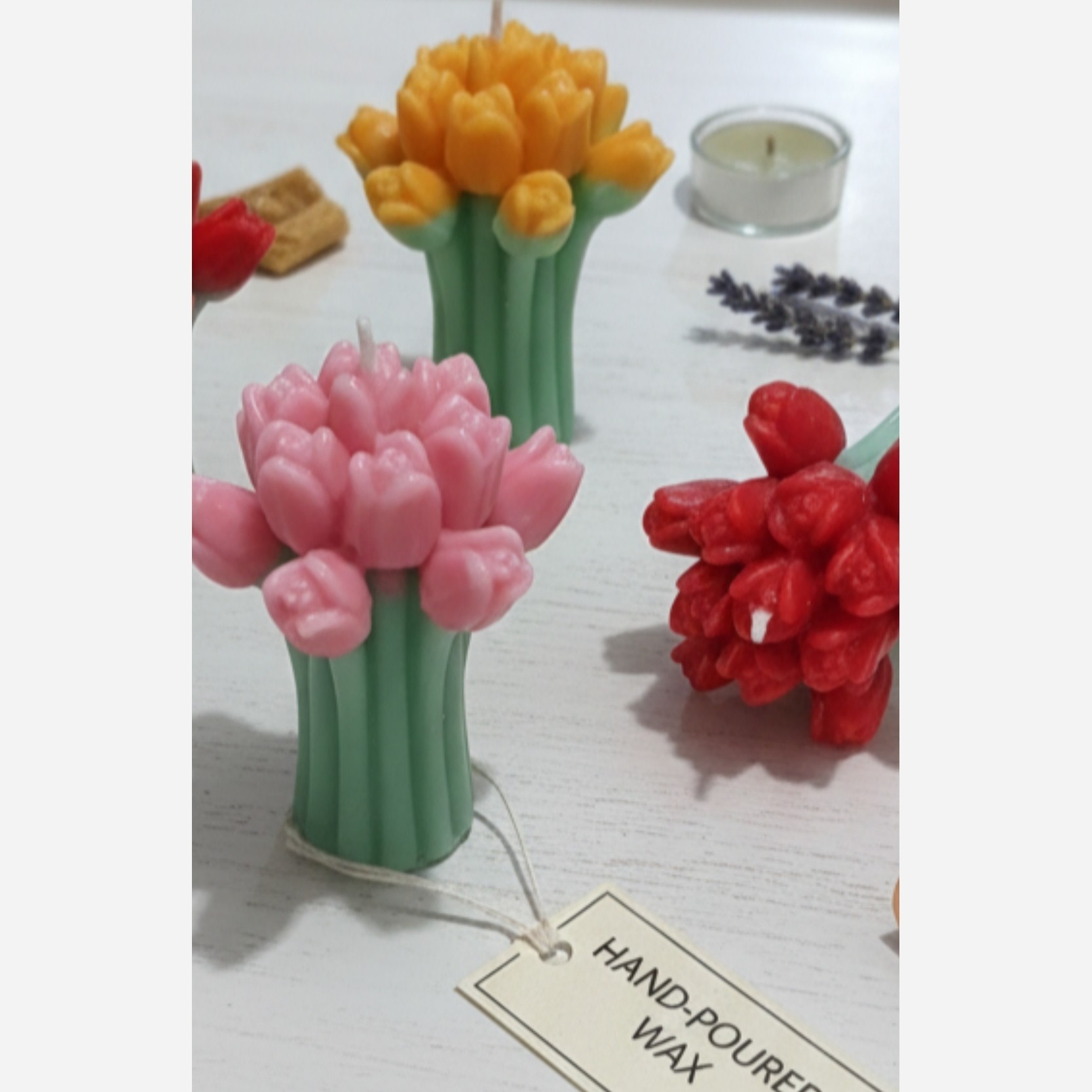 شمع دسته گل لاله با رنگ بندی متنوع بدون دود و بوی نامطبوع ساخته شده از پارافین خالص یک درصد