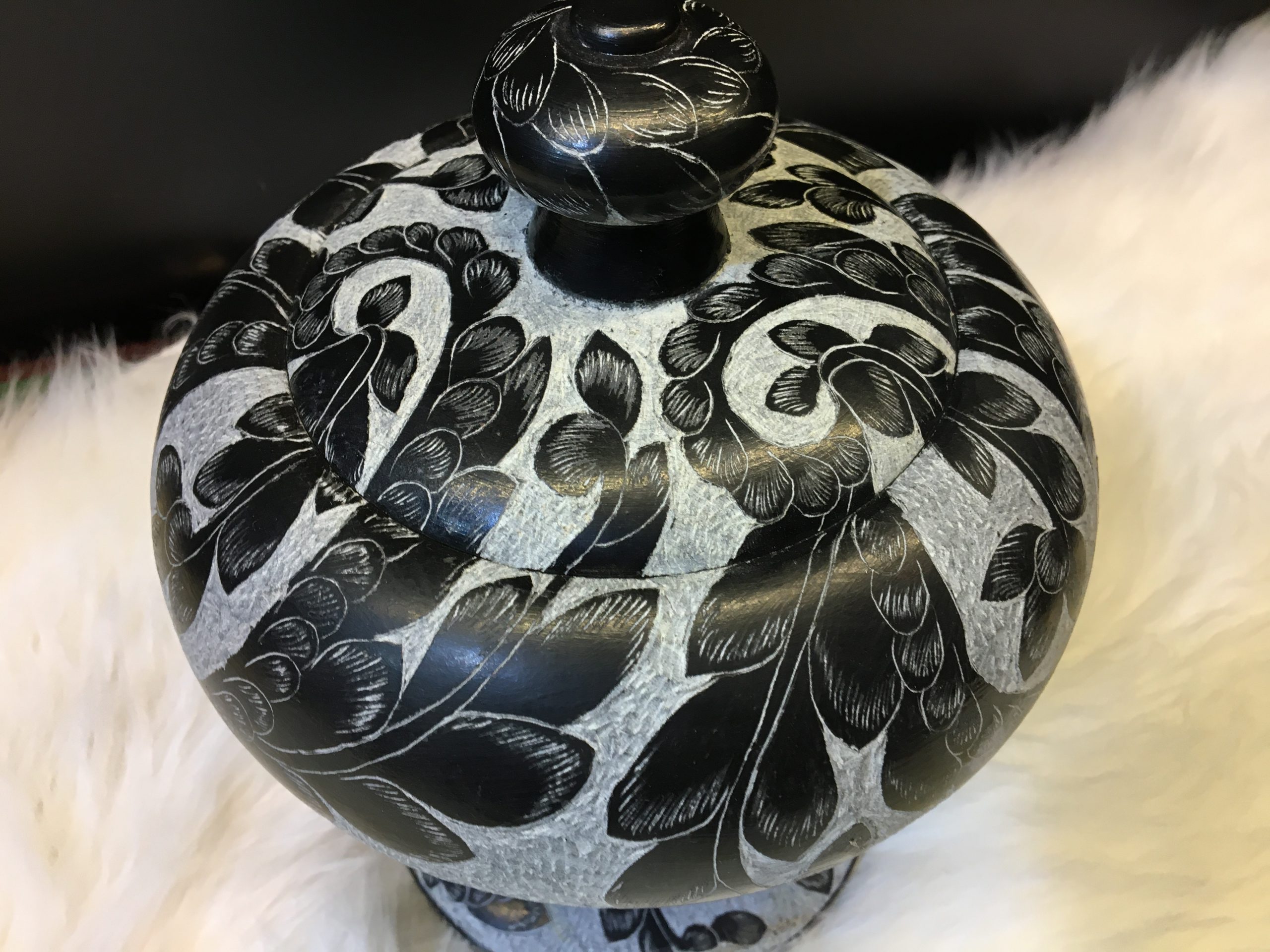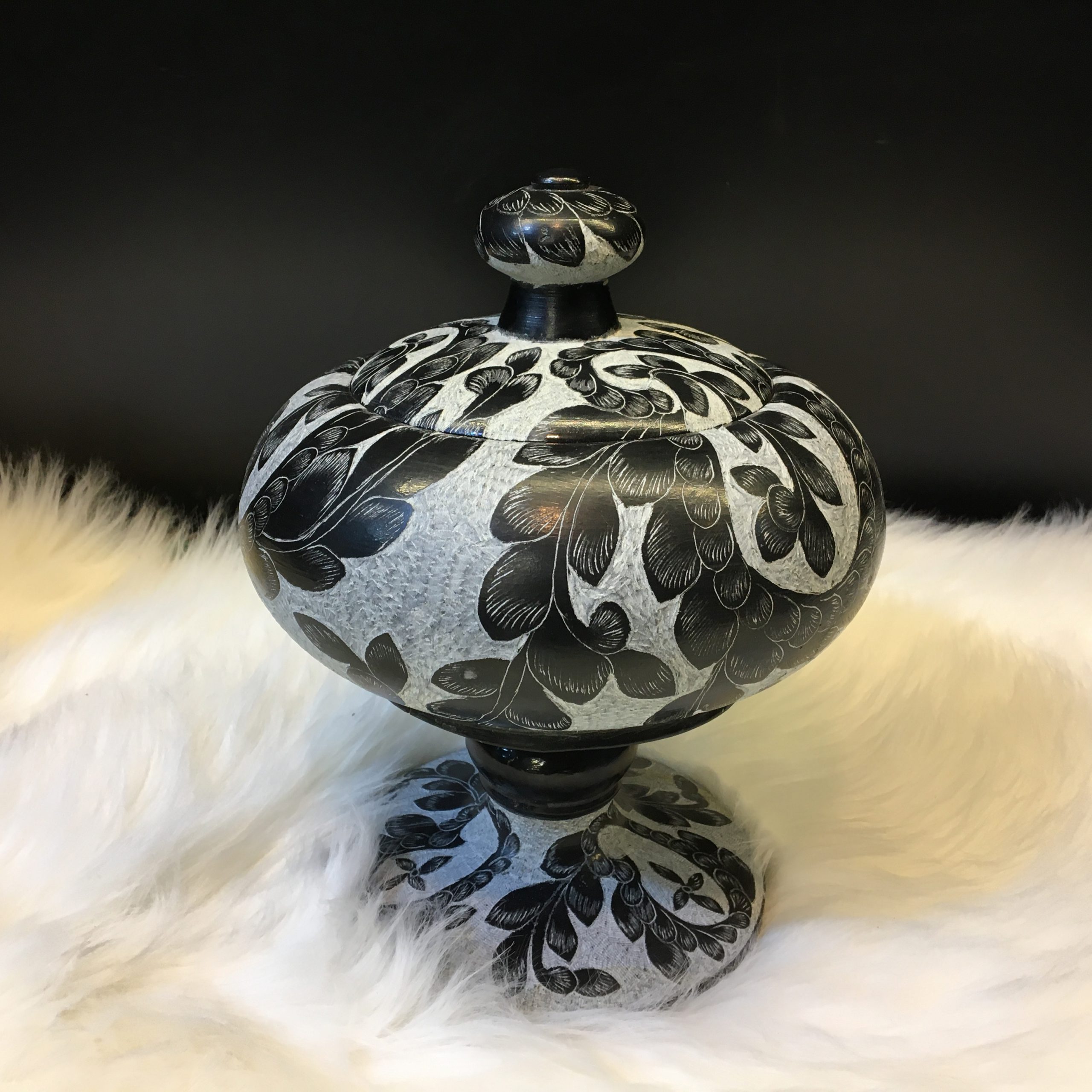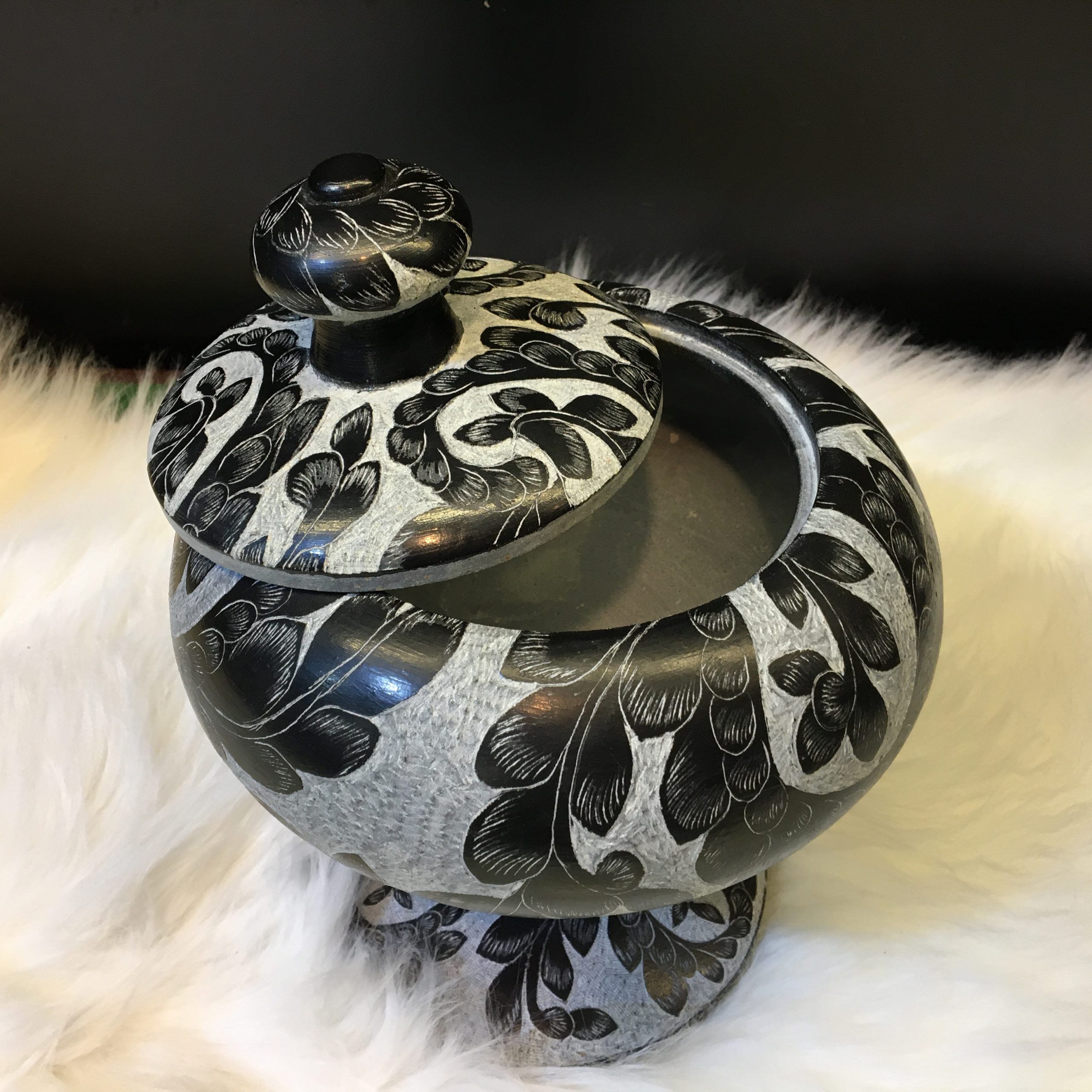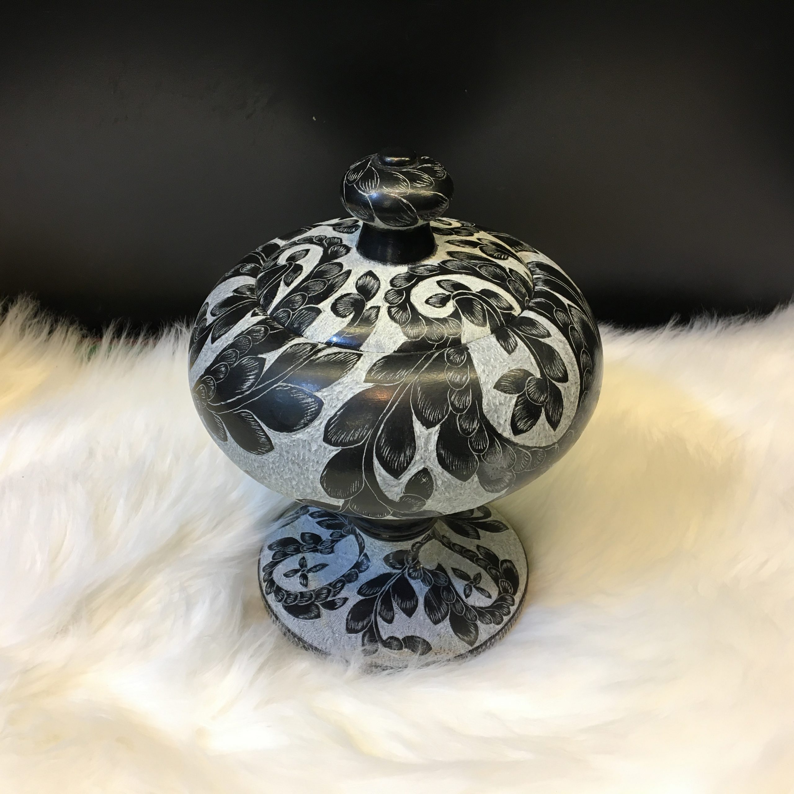 شکلات خوری سنگی پایه دار طرح جقه سرزمین پهناور ایران پیوسته خواستگاه خلق هنرهای ناب،اصیل و معنوی در عین حال متناسب با زندگی مردم و آداب و رسوم جوامع و اقوام خود بوده است. قلم زنی به طور کلی عبارت است از طراحی نقوش وحکاکی بر روی اشیای مخنلف، به ویژه مس ، طلا ،برنج ،نقره و سنگ است، به عبارت دیگر ایجاد خطوط و نقوش به وسیله چکش قلم بر روی اشیا مختلف و حک انها برروی این اجناس است . سنگ تراشی و قلم زنی روی سنگ صابون یکی از صنایع و فنون کهن ایرانی است که صنعتگران سنگ تراش از گذشته های دور با بهره گیری از بعضی از ابزار و اشیاها ، وسایل اشپزخانه و زینتی، دکوری ،و ظروف قابل استقاده را می ساختند و استادان قلم زن بر روی انها نقش و طراحی می انداختند و روی سنگ سرپانتین حکاکی میکردند. صنایع دستی یعنی جریان زندگی در رگهای هنر یک ملت