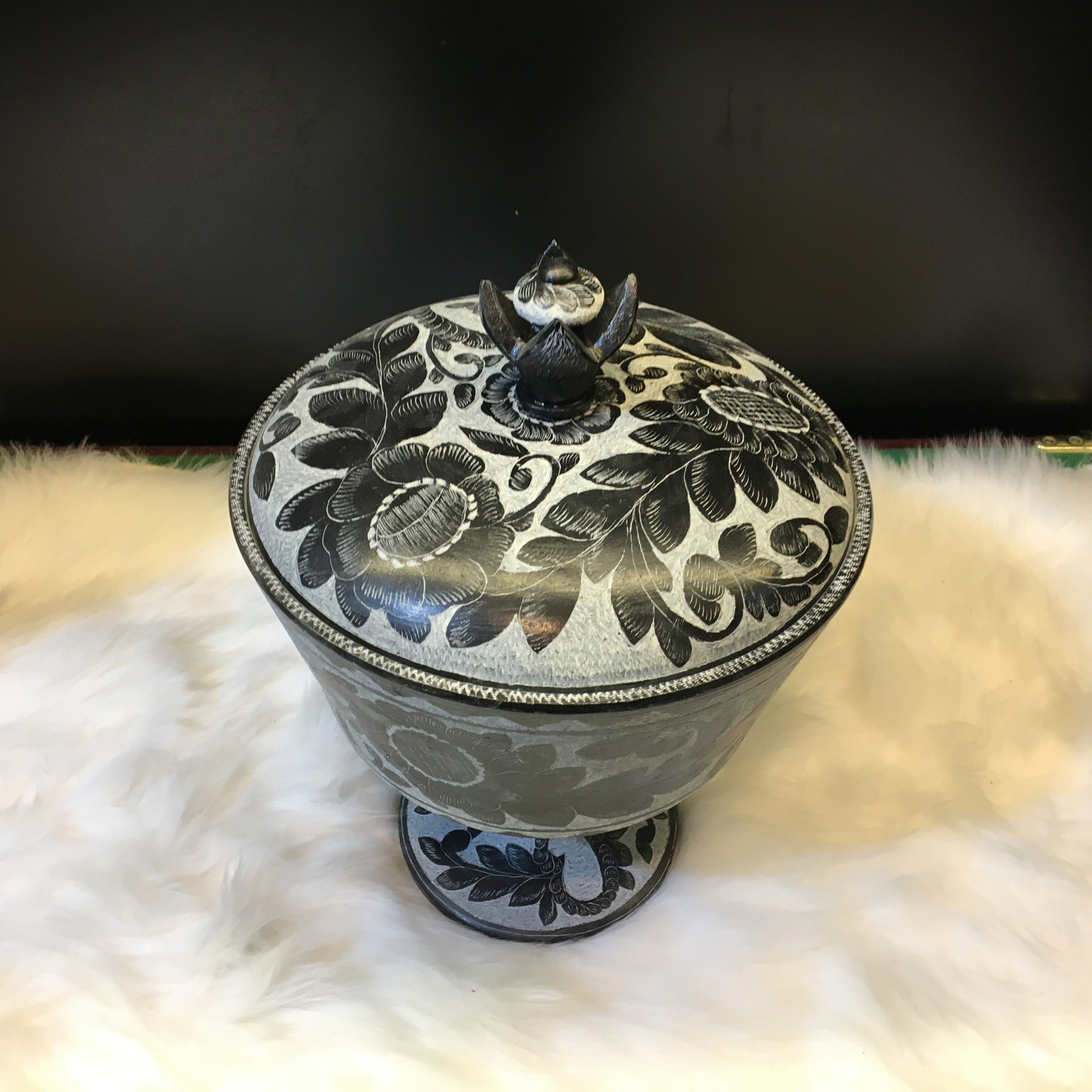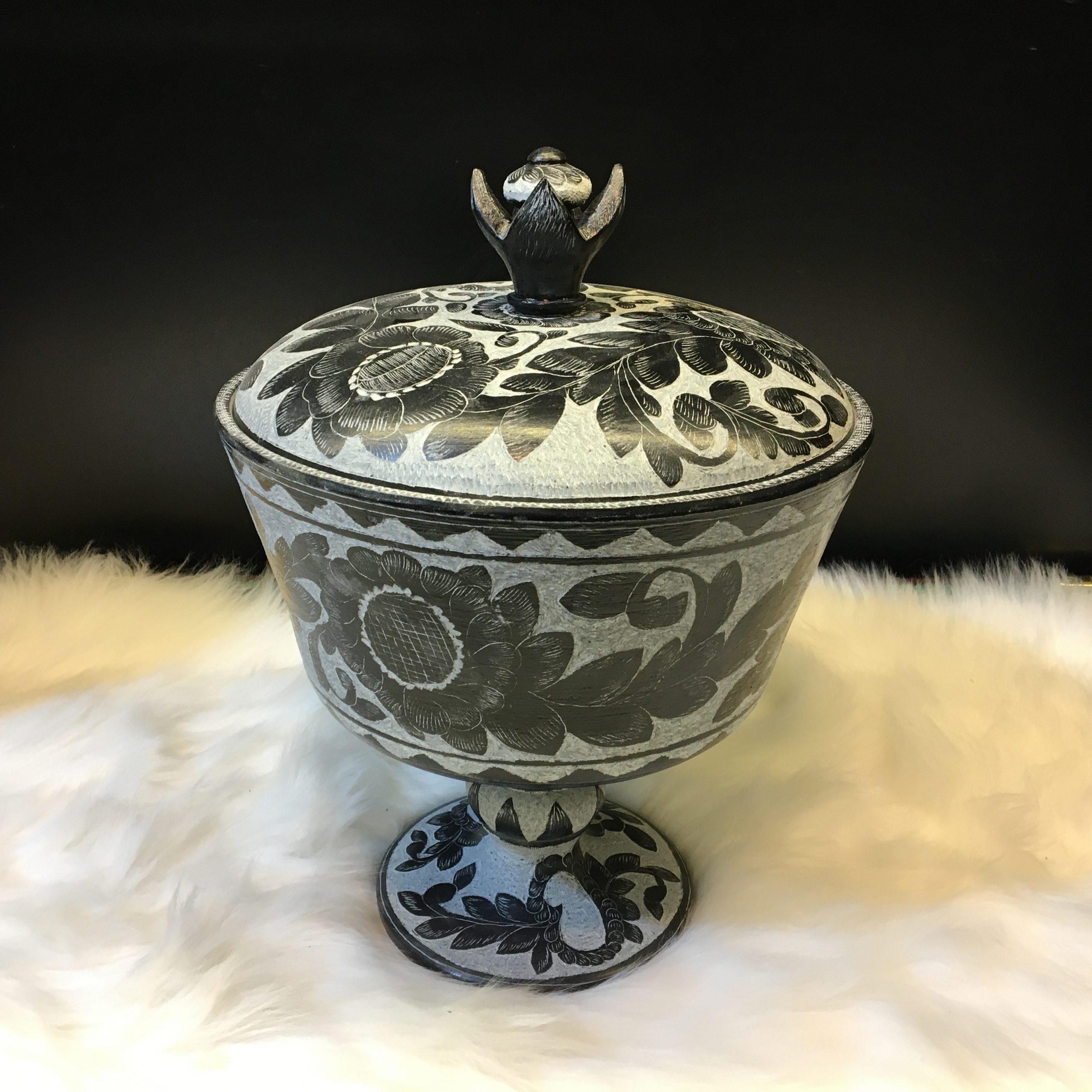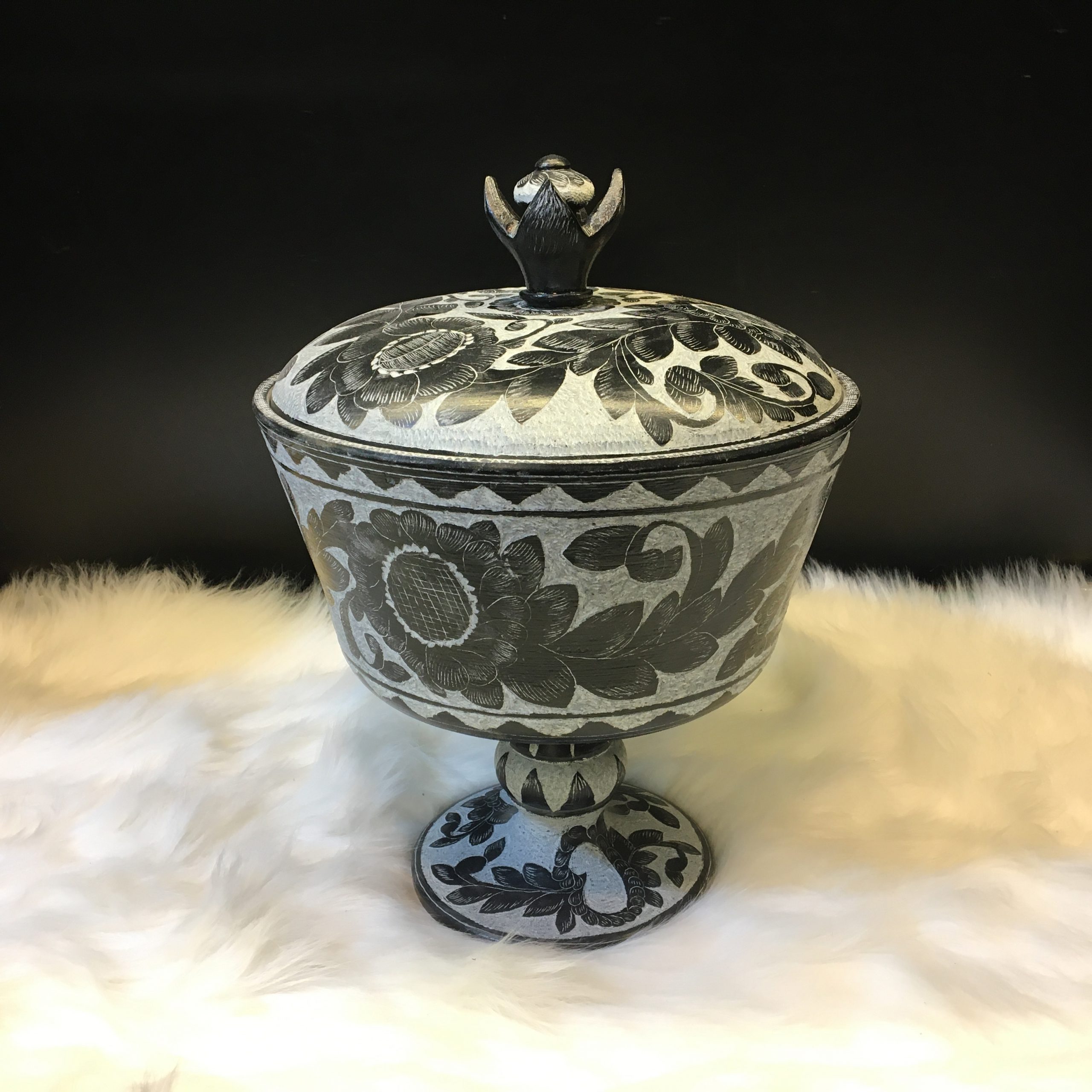 شکلات خوری سنگی پایه دار طرح قلبی سرزمین پهناور ایران پیوسته خواستگاه خلق هنرهای ناب،اصیل و معنوی در عین حال متناسب با زندگی مردم و آداب و رسوم جوامع و اقوام خود بوده است. قلم زنی به طور کلی عبارت است از طراحی نقوش وحکاکی بر روی اشیای مخنلف، به ویژه مس ، طلا ،برنج ،نقره و سنگ است، به عبارت دیگر ایجاد خطوط و نقوش به وسیله چکش قلم بر روی اشیا مختلف و حک انها برروی این اجناس است . سنگ تراشی و قلم زنی روی سنگ صابون یکی از صنایع و فنون کهن ایرانی است که صنعتگران سنگ تراش از گذشته های دور با بهره گیری از بعضی از ابزار و اشیاها ، وسایل اشپزخانه و زینتی، دکوری ،و ظروف قابل استقاده را می ساختند و استادان قلم زن بر روی انها نقش و طراحی می انداختند و روی سنگ سرپانتین حکاکی میکردند. با توجه به دست ساز بودن محصولات سنگی ، وزن و ابعاد آنها ممکن است اختلاف جزیی داشته باشند. صنایع دستی یعنی جریان زندگی در رگهای هنر یک ملت
