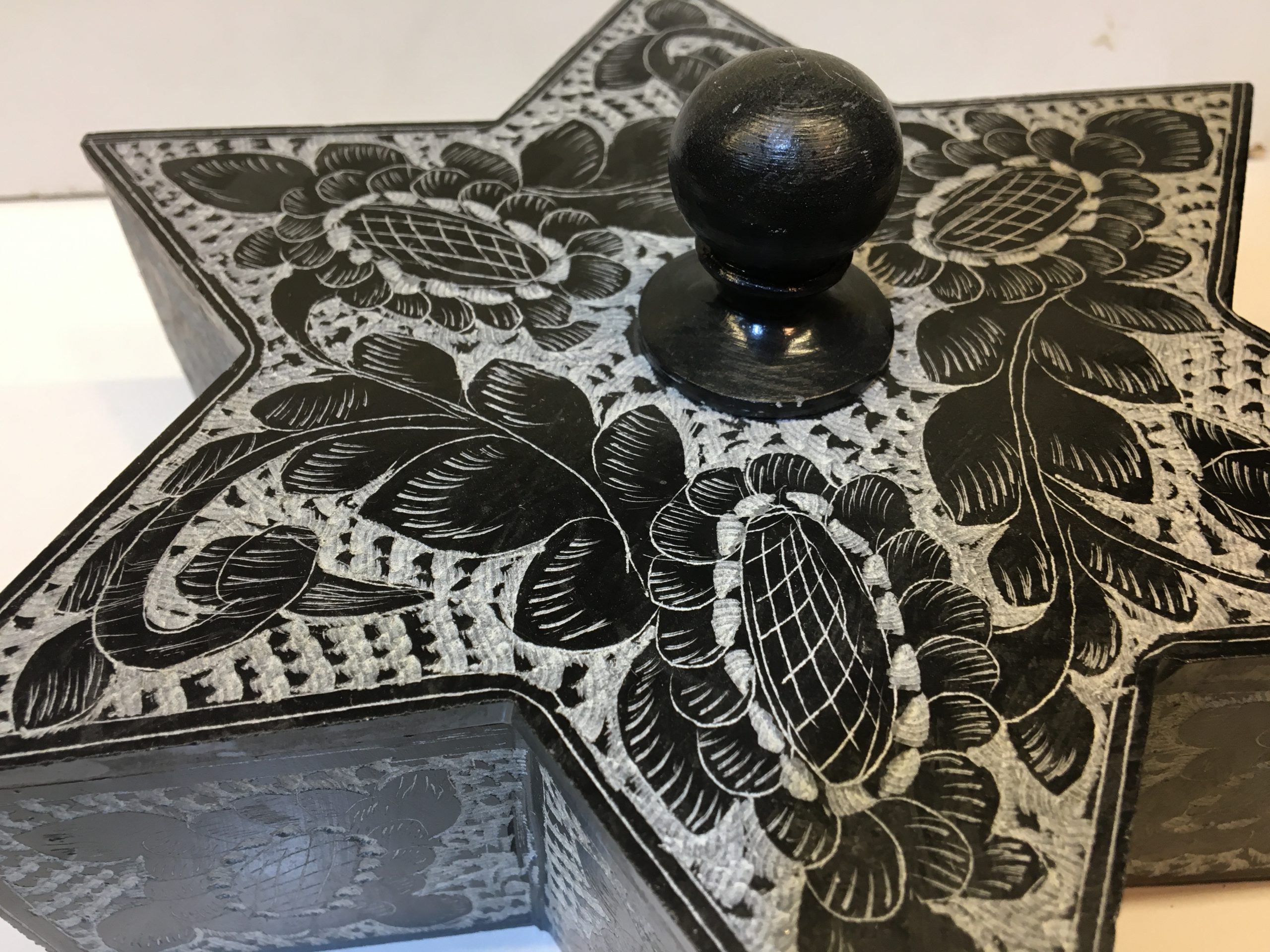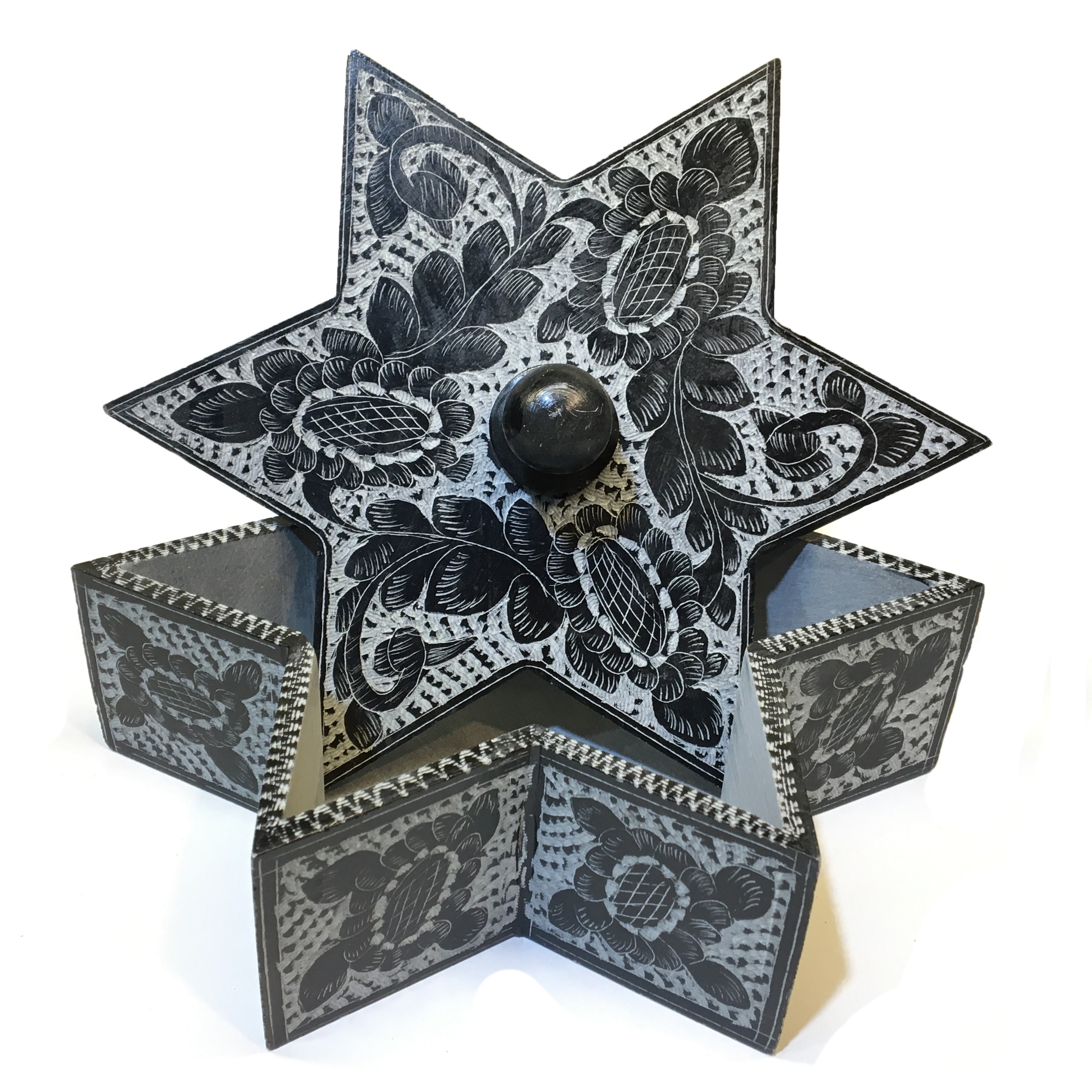 شکلات خوری سنگی ستاره ای با طرح سیاه قلم اثر هنرمندان برجسته سیاه قلم که از سنگ سرپانتین تراشیده شده است. شکلات خوری سنگی ستاره ای با قلمه زنی زیبا قابل استفاده در دکور منازل و سفره خانه های سنتی و کافی شاپ ها جنس آن از کوه های سنگی اطراف مشهد مقدس می باشد. این محصول دست کار استاد سید مجید سنگی در مشهد مقدس می باشد. این شکلات خوری سنگی ستاره ای، بدون قالب و طرح ریزی به صورت دستی تراشیده است و طرح سیاه قلم آن نیز با دست بدون دخالت ماشین طراحی شده که یک اثر کاملا هنری است. با توجه به دست ساز بودن محصولات سنگی این وزن و ابعاد ممکن است اختلاف جزیی داشته باشند.