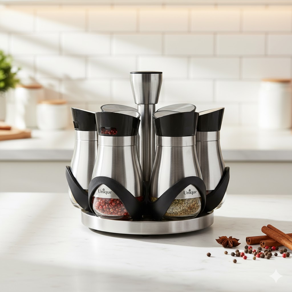 استفاده از ادویه در آشپزی ایرانی از جایگاه ویژه ای برخوردار است. از آنجا که ظروف ادویه به دلیل پرکاربرد بودن در خارج از کابینت و در کنار دست آشپز قرار میگیرند، زیبایی ظاهری و کیفیت آنها از اهمیت بالایی برخوردار است. "ست ادویه گردان اشکی یونیک کد 1428" محصولی با کیفیت از برندی معتبر بوده و از طراحی زیبایی برخوردار است. این محصول شامل 6 ظرف استیل به همراه یک استند فلزی گردان است. استیل استفاده شده در این محصول ضد زنگ بوده و از کیفیت بالایی برخوردار است. قسمت شیشه ای پایین این ظروف به دیدن شدن ادویه موجود در آن کمک میکند. درب این ظروف دارای سوراخ هایی برای پاشیدن ادویه است که با چرخاندن سر پوش روی آن ها بسته می شوند. در باره برند یونیک یونیک برندی شناخته شده در زمینه لوازم آشپزخانه در ایران می باشد. این برند در چندین سال اخیر مورد استقبال خانواده های ایرانی قرار گرفته است. شرکت یونیک که محصولات خود را تحت لیسانس کشور انگلیس در چین تولید میکند، سعی کرده است تا با طراحی مدرن و مورد نیاز خانواده ها و با بهترین کیفیت ممکن، تولیدات خود را روانه بازار کند. از جمله مهم ترین ویژگی های شرکت یونیک، قیمت مناسب در مقایسه با برند های کرکماز و زولینگن و … و همچنین خدمات پس از فروش مناسب در ایران است. با توجه به محصولات مشابه داخل بازار، خریداران گرامی حتما به لوگوی شرکت unique بر روی محصول دقت کنند. محصولاتی که زیر برند یونیک ،نام کشور و یا High Quality درج شده است فاقد گارانتی و محصولات شرکتی یونیک نمی باشند.