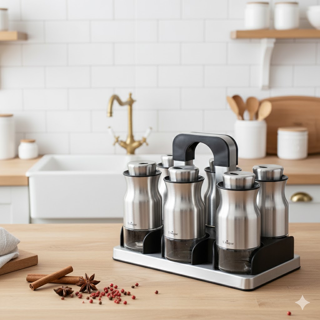 ست ادویه 7 پارچه پایه استیل یونیک کد 2021 مبلمونسرا مدل 288508