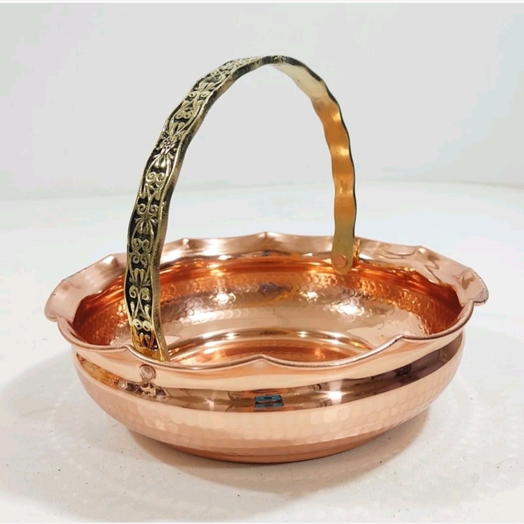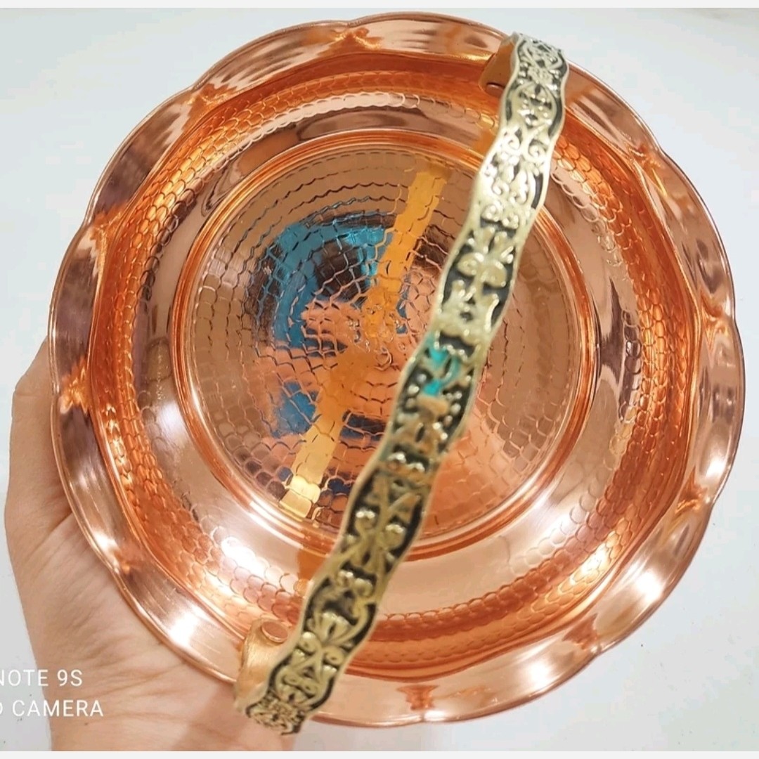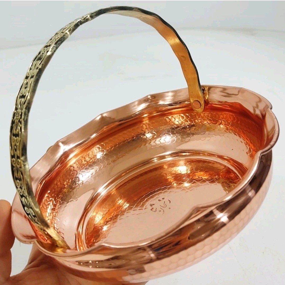 «سبد شکلات مسی» مع به ظرفی تزئینی و کاربردی از مس ساخته شده و برای پذیرایی یا نگهداری شکلات، نقل، شیرینی یا حتی خشکبار به کار میرود. 🔹 ویژگیها: جنس: از مس مرغوب ساخته میشود؛ گاهی به صورت چکشکاری سنتی یا با طرحهای قلمزنی و میناکاری. ظاهر: معمولاً براق، با رنگ مسی متمایل به سرخ یا ترکیب با آبکاری نقره/طلایی. شکل: به صورت سبدی کوچک با دسته یا بدون دسته، در طرحهای مدرن و سنتی. کاربرد: برای پذیرایی در مهمانیها، دکور روی میز پذیرایی یا حتی هدیه دادن. 🔹 مزایا: زیبایی و جلوه سنتی–مدرن همزمان. ماندگاری بالا نسبت به ظروف معمولی. قابلیت ست شدن با سایر ظروف مسی . در بعضی نمونهها داخل ظرف قلعاندود میشود تا برای مواد خوراکی مناسبتر باشد. 🔹 موارد استفاده: سرو شکلات، نقل، آجیل یا شیرینی. استفاده تزئینی به عنوان بخشی از دکوراسیون. هدیه لوکس در مراسم مختلف مثل عید نوروز، شب یلدا یا جشنها.