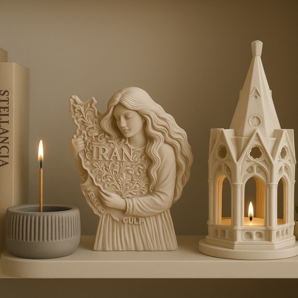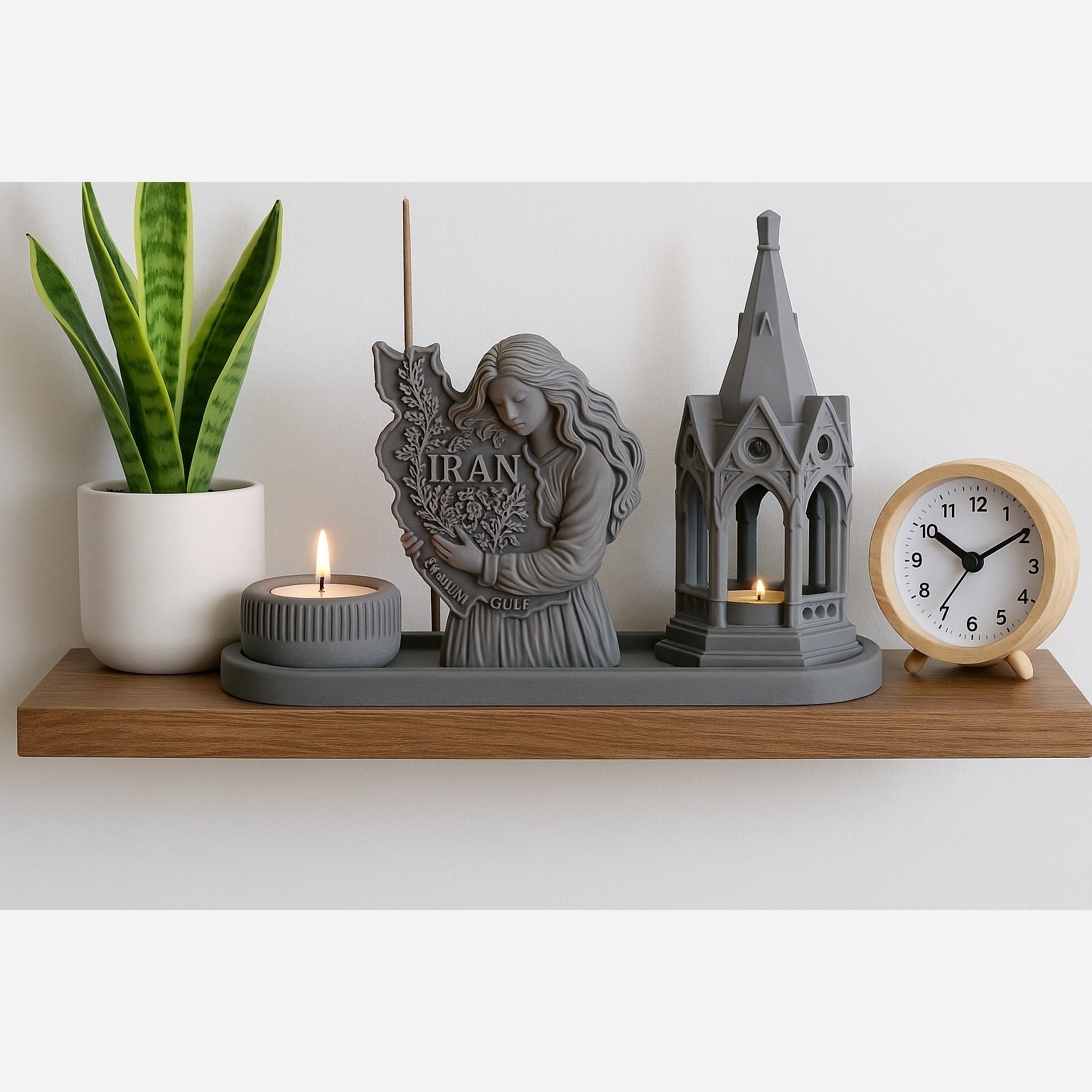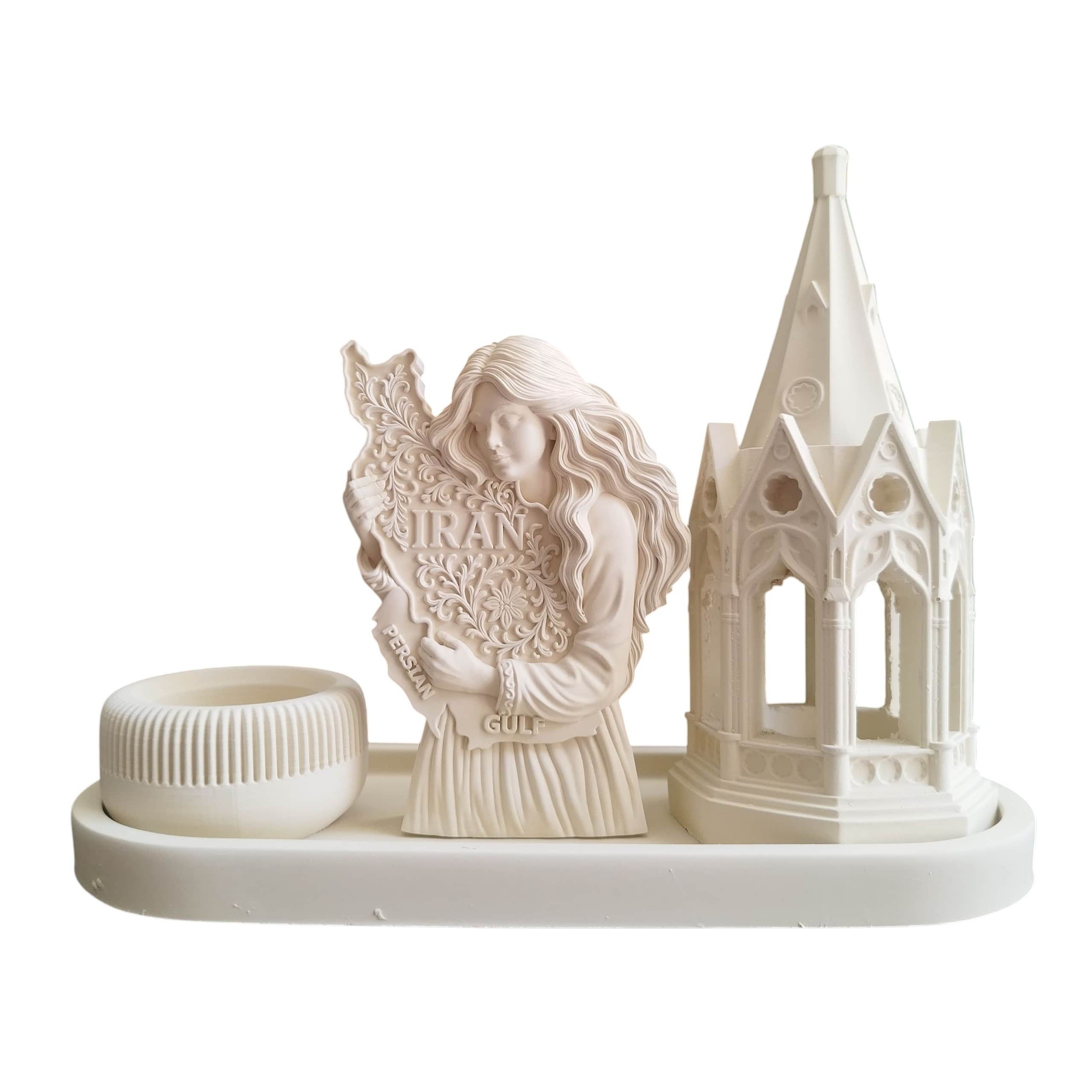 این ست دکوری سهتکه ترکیبی از زیبایی و کارایی است و شامل جاوارمری طرح کلیسا در سمت راست برای روشن کردن شمع وارمری و ایجاد نوری گرم و آرامشبخش، مجسمه ظریف دختر ایرانی در وسط که نقشه ایران را در آغوش گرفته و هویتی اصیل و هنری به فضا میدهد، و جاعودی قلمی در سمت چپ برای قرار دادن عود و پخش رایحهای دلنشین است. طراحی یکپارچه روی سینی پایهدار باعث میشود جابهجایی و گردگیری آسان باشد و این مجموعه با سبکهای مینیمال، مدرن و کلاسیک هماهنگی کامل دارد. متریال شبهسنگی با روکش مات علاوه بر دوام بالا، جلوهای طبیعی و لوکس به محصول بخشیده و در دو رنگ پرطرفدار طوسی سنگی و سفید استخوانی عرضه میشود. کافیست یک شمع روشن در جاوارمری بگذارید و عود را در جاعودی قرار دهید تا ترکیب نور و عطر، فضایی شاعرانه و آرام ایجاد کند. قرار دادن این ست در قفسه میانی کتابخانه با کتابهایی در دو طرف، روی شلف دیواری بههمراه گلدان و ساعت رومیزی یا روی میز پذیرایی و کنسول ورودی، جلوهای خاص و متفاوت به دکور شما میدهد. این محصول با الهام از فرهنگ و هویت ایرانی، انتخابی خلاقانه و ماندگار برای هدیه دادن در مناسبتهای خاص یا برای تکمیل دکور منزل و محل کار است و هر بار که شمع روشن میکنید و دود عود بالا میرود، داستانی از آرامش و اصالت در فضای شما روایت میشود.