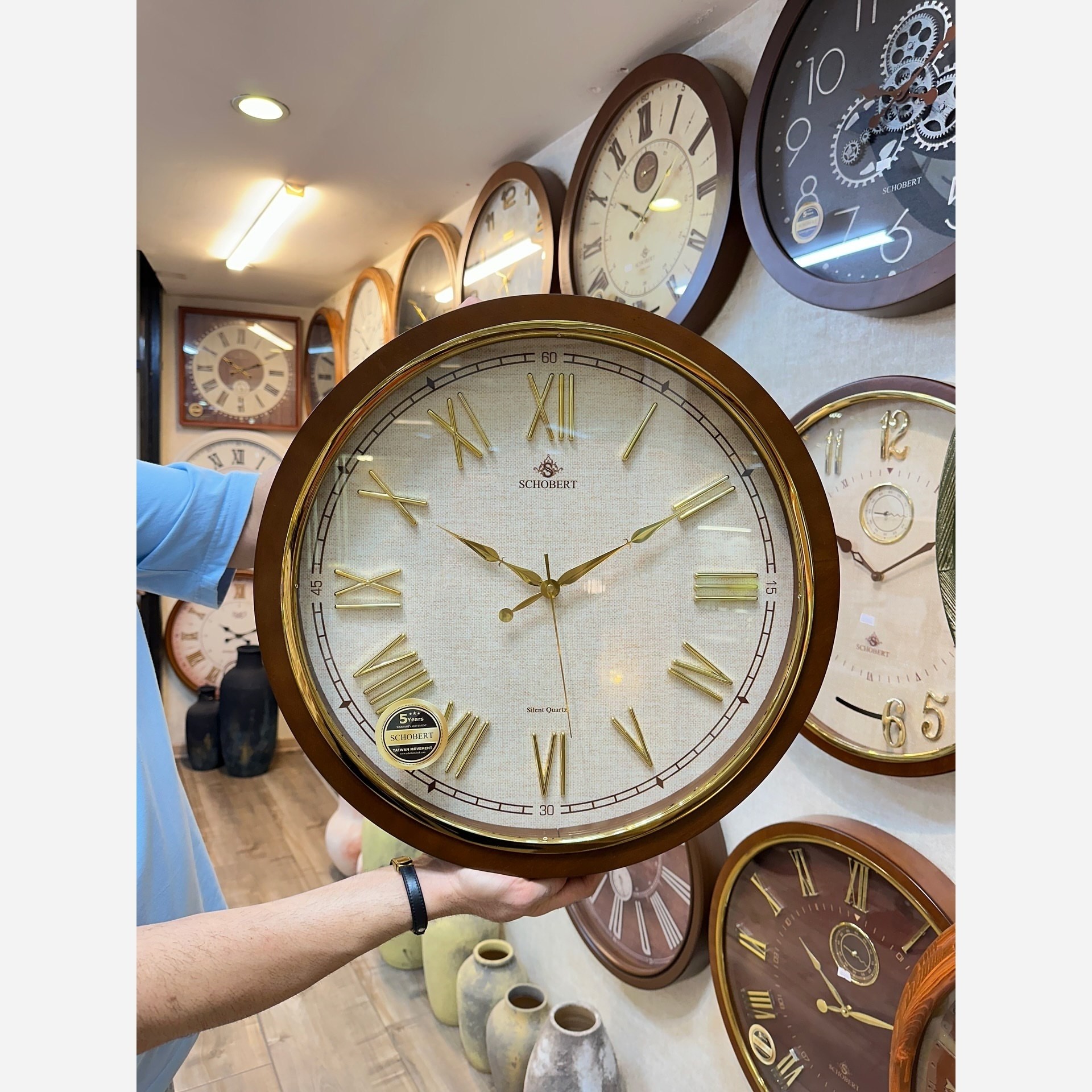 ساعت دیواری شوبرت مدل 6320 ✨ ترکیب اصالت چوب با درخشش طلایی 🟤 قاب چوبی با رنگ گرم و طبیعی 🟡 رینگ فلزی طلایی براق ⏱ موتور تایوانی بیصدا + ثانیهشمار روان 📏 قطر 50 سانتیمتر – مناسب هر نوع دکور 🔒 5 سال ضمانت موتور 🚚 ارسال امن به سراسر کشور