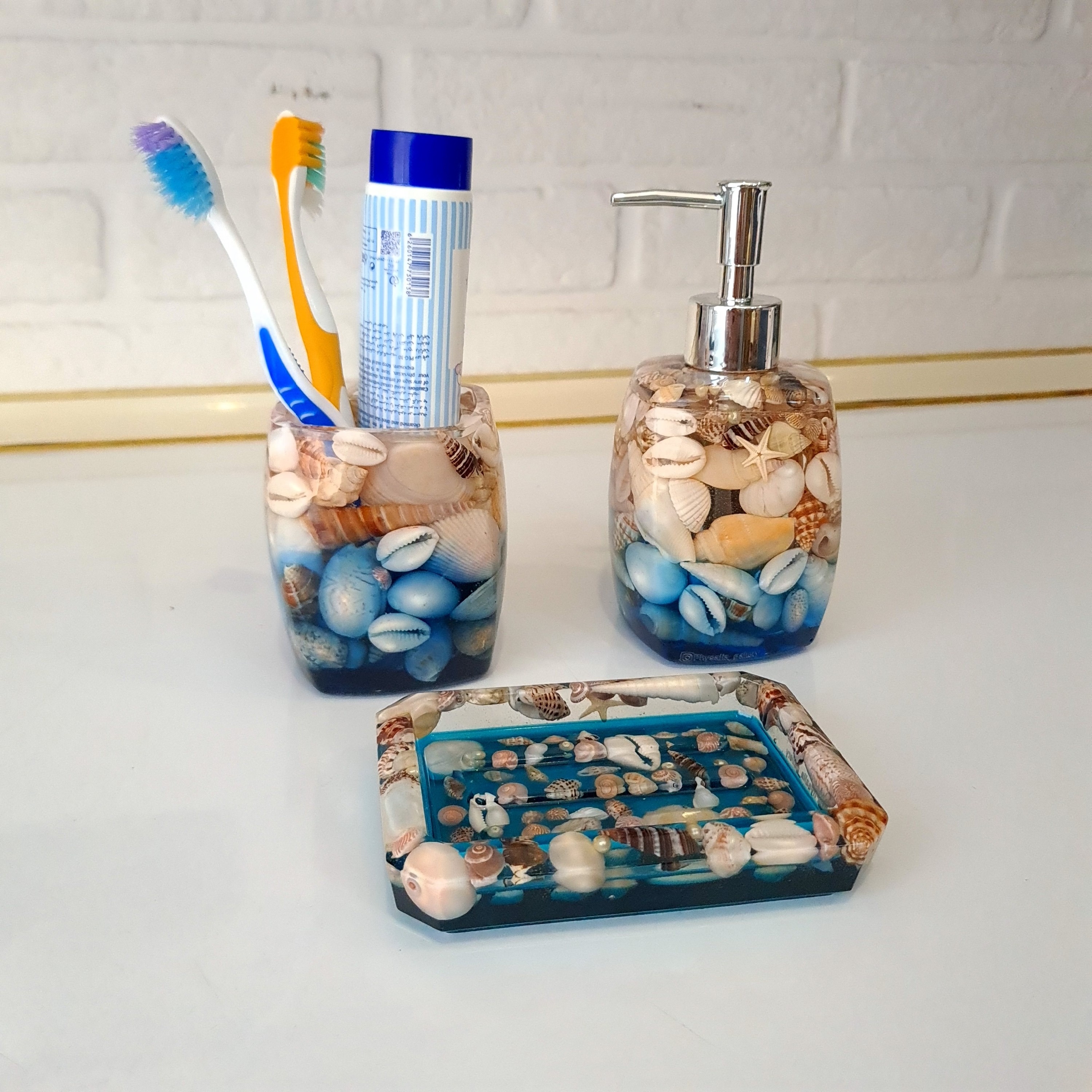 ست جامایع ، صابون و مسواک رزینی طرح صدفی مبلمونسرا مدل 266074