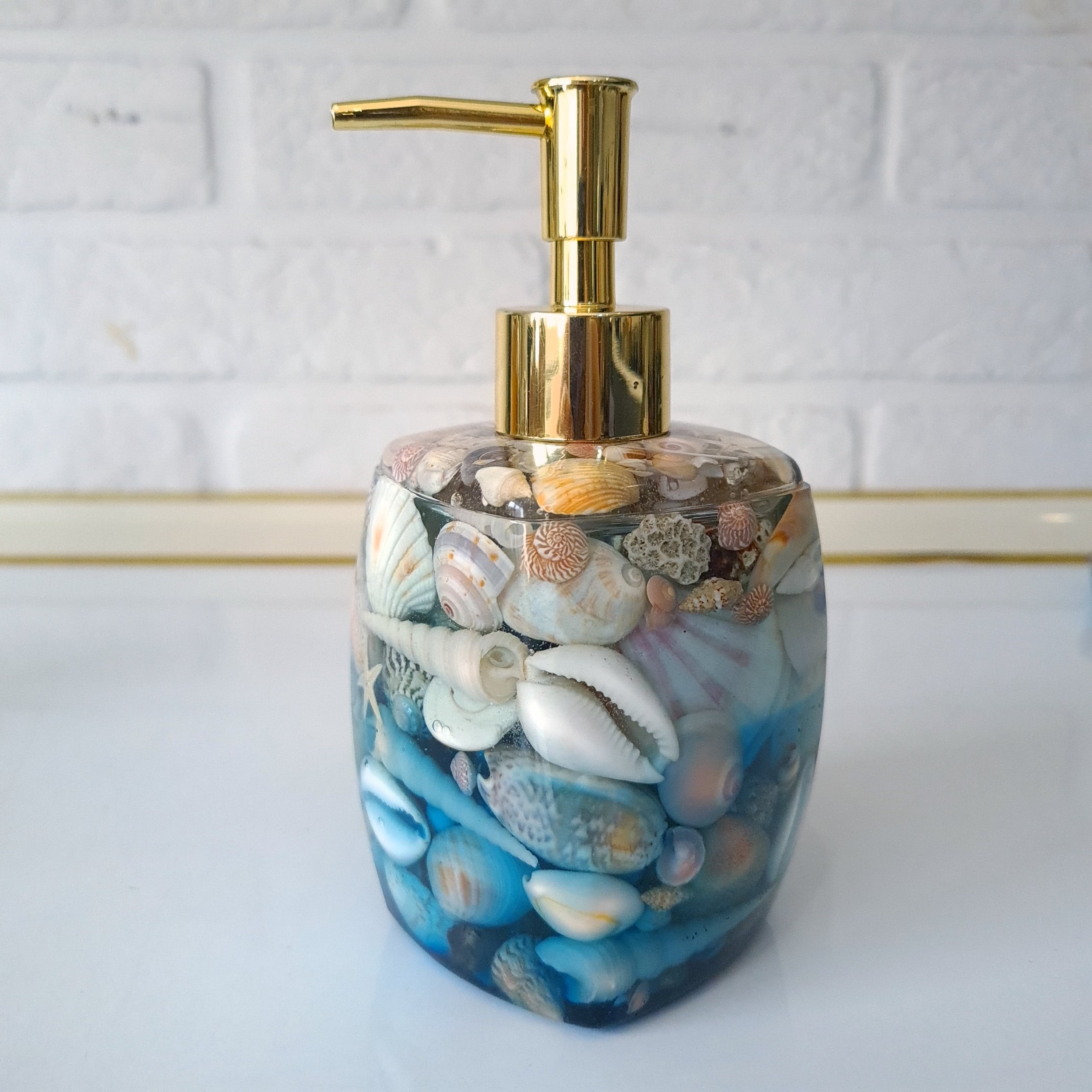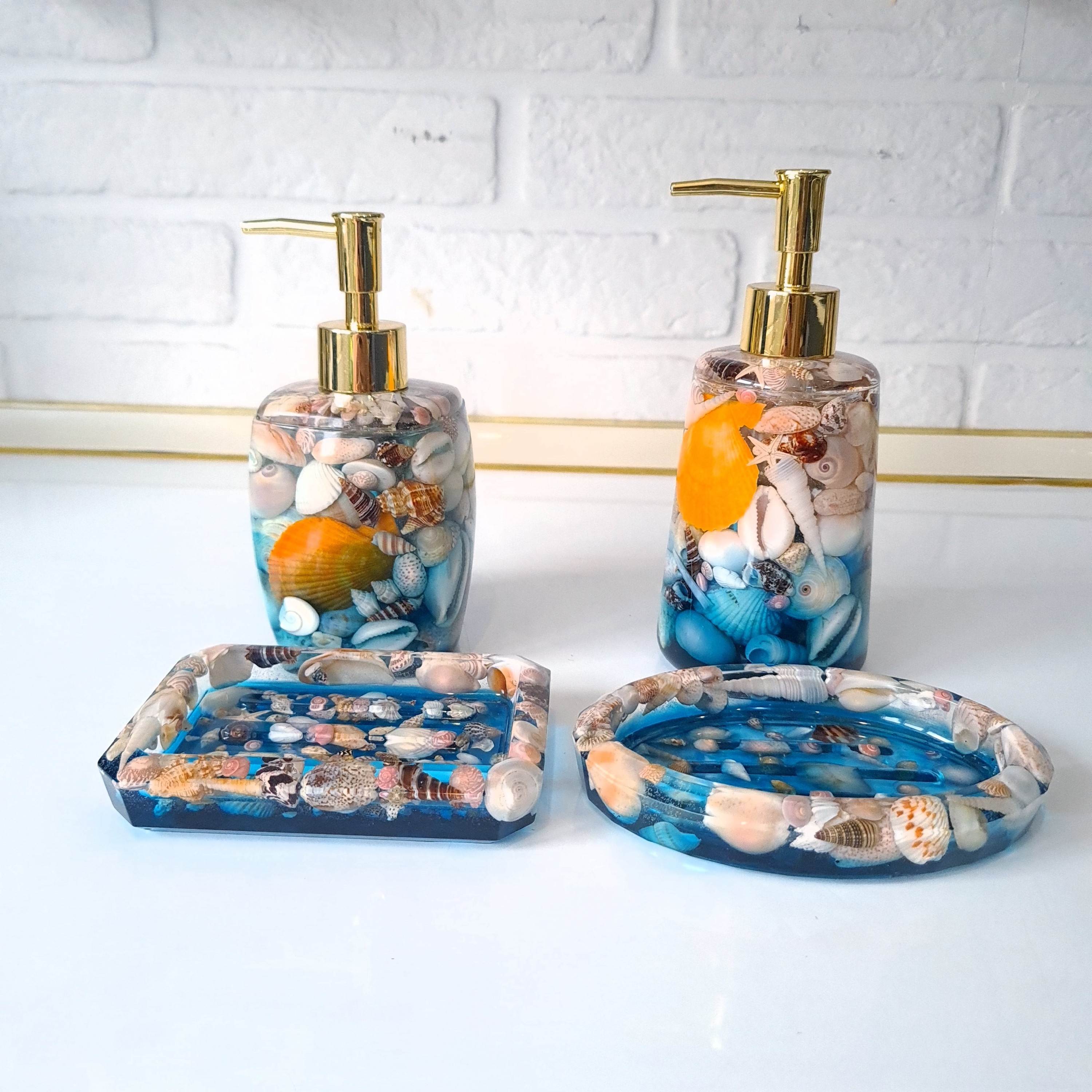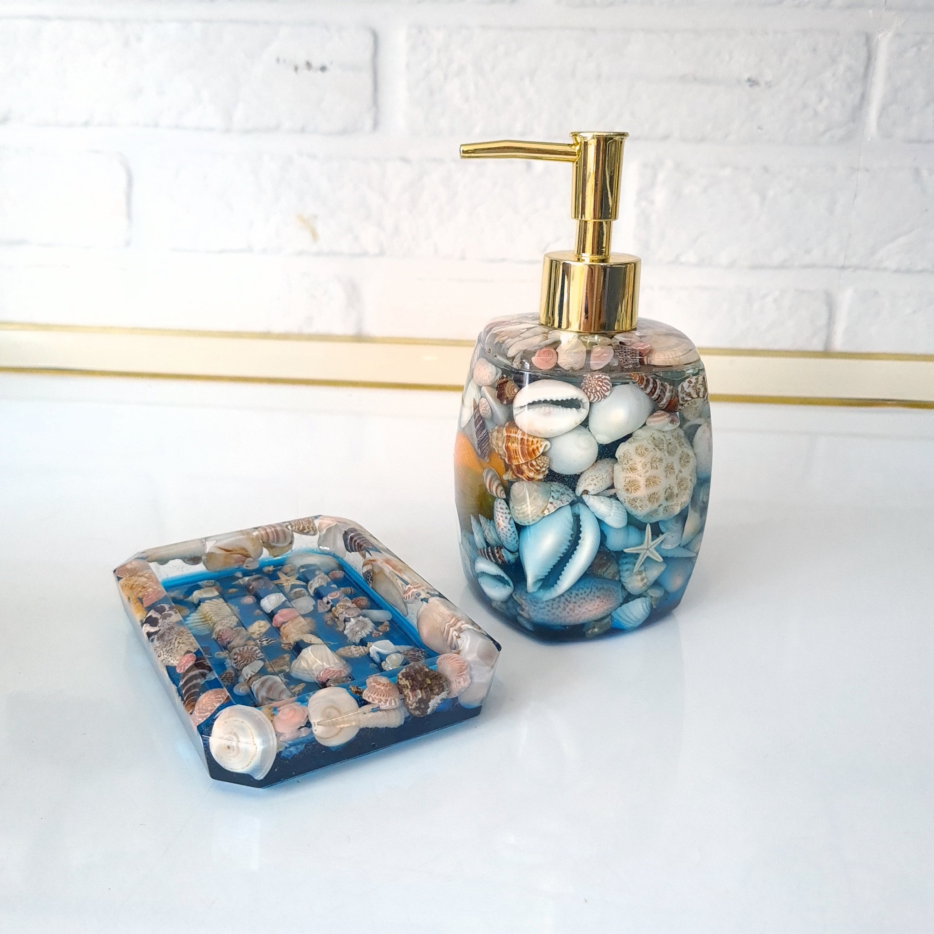 ست جا مایع و صابونی رزینی طرح صدفی ساخته شده از رزین شفاف و صدف های کاملا طبیعی قابل سفارش در رنگ های دلخواه پمپ قابل تعویض در دو رنگ نقره ای و طلایی استوانه 160 cc مستطیل 180 cc مربع 100 cc