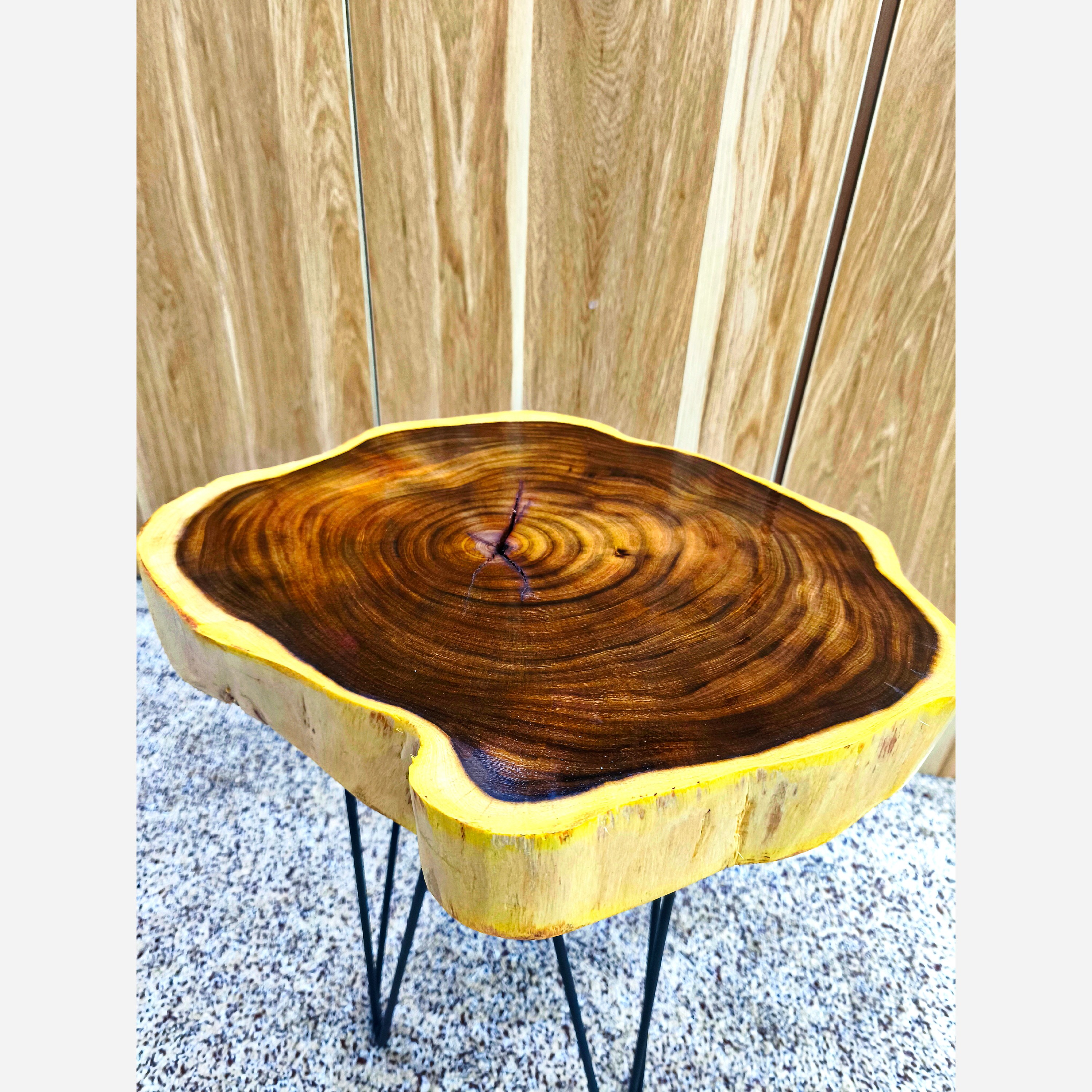 میز عسلی از جنس چوب کهور به قطر 40 سانتی متر و ارتفاع 6 سانتی متر هست ارتفاع میز با پایه سنجاقی سه شاخه 45 سانتیمتر سطح کار روغن گیاهی خورده و ضد آب هست