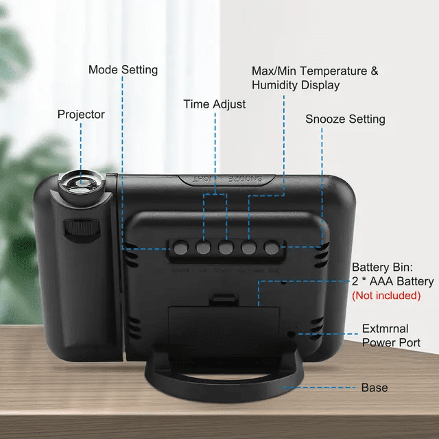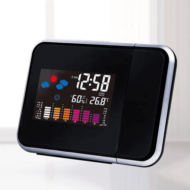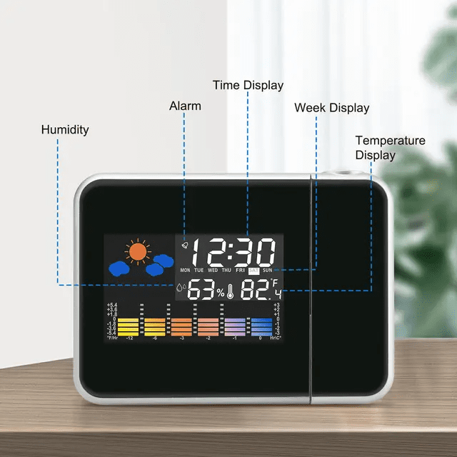 ساعت رومیزی پروژکتوری مدل 8190 ساعت پروژکتوری رومیزی دارای قابلیت های نمایش ساعت روی سقف یا دیوار ، نمایشگر وضعیت آب و هوا به همراه تقویم و دماسنج و رطوبت سنج و ساعت زنگدار می باشد. ساعت دیجیتال پروژکتوری رومیزی مدل DS-8190 با قابلیت نمایش ساعت روی سقف یا دیوار به همراه تقویم و دماسنج و رطوبت سنج و ساعت زنگدار میباشد. با داشتن این ساعت زمانی که شما نیمه شب از خواب نازتان بیدار می شوید با فشار دادن دکمه بالای ساعت چراغ صفحه نمایش به همراه ساعت پروژکتوری بر روی سقف یا دیوارروشن میشود. همچنین با دکمه ولومی تعبیه شده شما می توانید به نسبت فاصله مانع وضوح تصویر منعکس شده را تنظیم کنید تا واضح ترین ساعت را بصورت سینمایی ببینید و حالت چرخشی بخش پروکتور به شما کمک می کند تا زاویه تابش را به دلخواه تعیین کنید . قابلیت نمایش ساعت بصورت پروجکشن شده عین پرده سینما روی دیوار یا سقف را دارد. دارای محفظه پروژکتور با قابلیت تغییر زاویه تابش روی دیوار یا سقف را دارد. دارای صفحه نمایش LCDمی باشد. دارای دماسنج دیجیتالی از 9.9- الی +60 درجه سانتیگراد و دارای رطوبت سنج دیجیتالی از 20 الی 90 درصد می باشد. امکان تغییر نمایش دما در واحد سانتیگراد یا فارنهایت را دارد. برد پروژکتور حدود 1.5 الی 2 متر در فضای تاریک را دارد که هر چه فضا و محیط تاریکتر فاصله بیشتری را نمایش می دهد. نیروی برق مورد نیاز 2 عدد باتری نیم قلمی AAA یا ورودی برق 5 ولت را دارد. مشخصات: - ساعت پروژکتوری با نمایش وضعیت آب و هوا ، تقویم ، دماسنج و رطوبت سنج - نمایش ساعت بصورت پروجکشن روی دیوار یا سقف سایر مشخصات - برد پروژکتور: حدود 1.5 الی 2 متر در فضای تاریک - نیروی برق مورد نیاز: 2 عدد باتری نیم قلمی AAA یا ورودی برق 4.5 ولت - دارای محفظه پروژکتور با قابلیت تغییر زاویه تابش روی دیوار یا سقف - صفحه نمایش LCD - چراغ پس زمینه رنگی - دارای آلارم بیدارباش - نمایش ساعت بصورت پروجکشن روی دیوار یا سقف - دارای ولومی تنظیم میزان وضوح تصویر - دارای دماسنج دیجیتالی از 9.9- الی 50 درجه سانتیگراد - امکان تغییر نمایش دما در واحد سانتیگراد یا فارنهایت - دارای تقویم از سال 2000 الی 2099 میلادی - دارای آلارم بیدارباش - دارای حالت چرت یا Snooze برای زنگ بیدارباش - دارای رطوبت سنج دیجیتالی از 20 الی 90 درصد