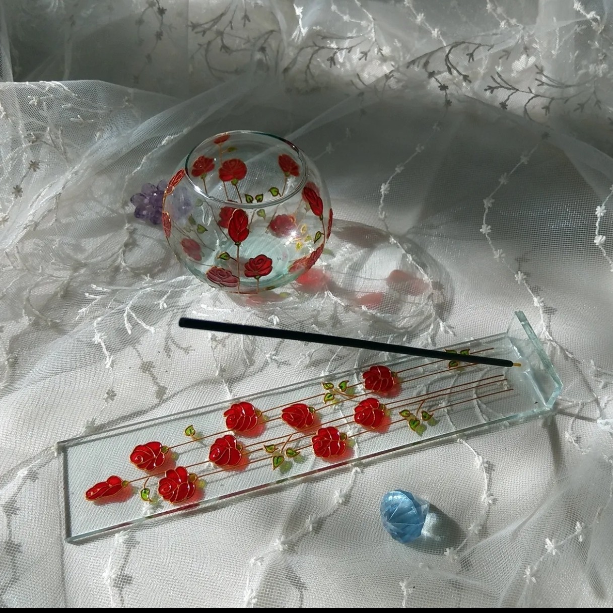 فکر کن همزمان که عود رو روشن میکنی کنارش یه عالمه نور رنگی ام ببینی 😍😍😍😍 این ست یه جاعودی شیشه ای داره با نقاشی برجسته ویترای و یه جاشمعی ست که طرح مشابه جاعودی رو داره کاملا قابل شست و شوو ضد آب هست و در برابر گرمای شمع مقاومه این ست شامل یه جاعودی به ابعاد 20×4×2 و یه جاشمعی به قطر 6 هیت