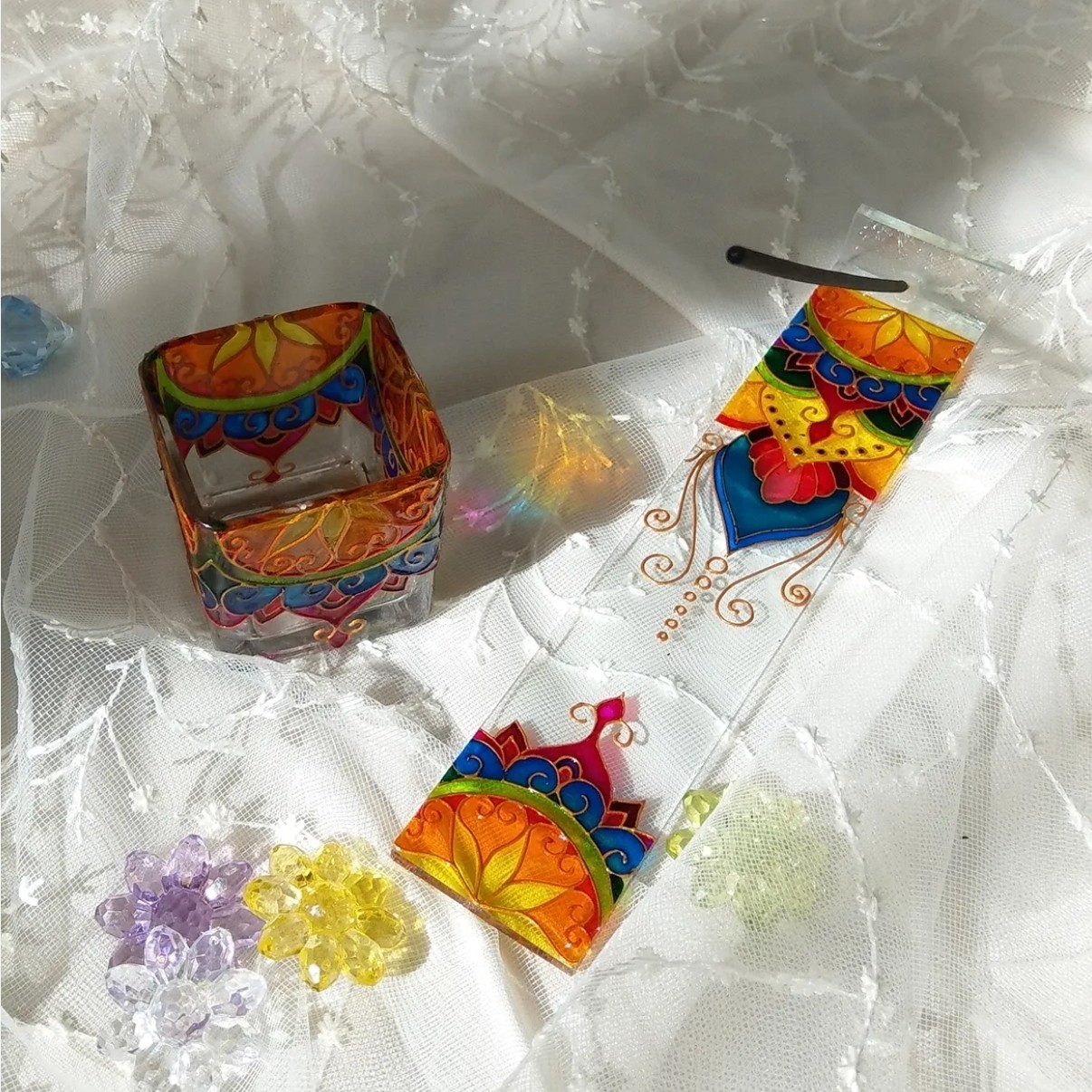 فکر کن همزمان که عود رو روشن میکنی کنارش یه عالمه نور رنگی ام ببینی 😍😍😍😍 این ست یه جاعودی شیشه ای داره با نقاشی برجسته ویترای و یه جاشمعی ست که طرح مشابه جاعودی رو داره کاملا قابل شست و شوو ضد آب هست و در برابر گرمای شمع مقاومه این ست شامل یه جاعودی به ابعاد 20×4×2 و یه جاشمعی به سایز 5×5هست
