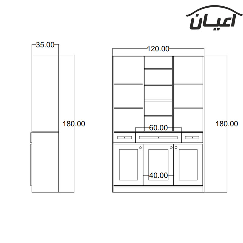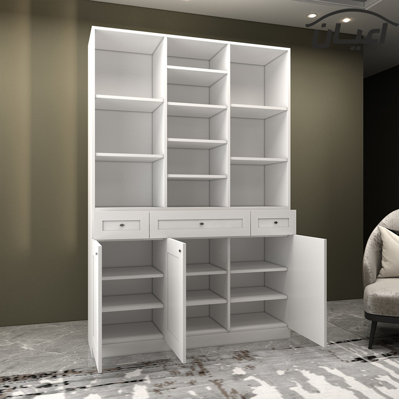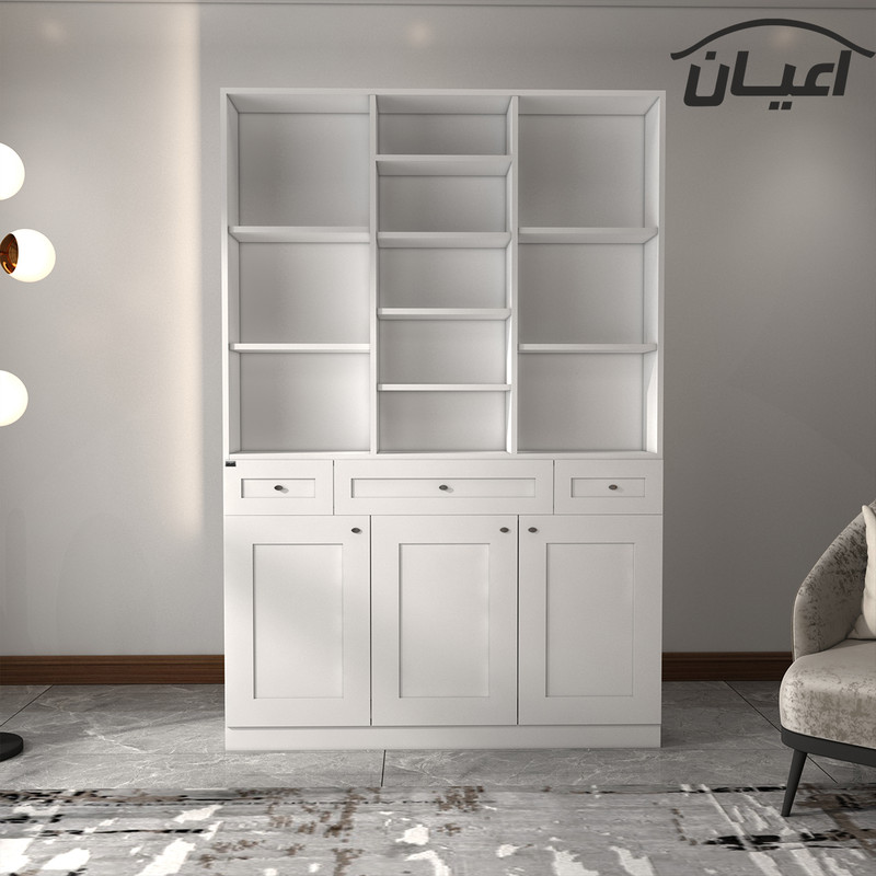 جنس وکیوم و ملامینه. وزن متناسب با ابعاد. نوار پی وی سی. ۳درب کمدی با لولا آرام بند. ۳عدد کشو با ریل ۳تیکه. بسته بندی با لوگو و برند اعیان.