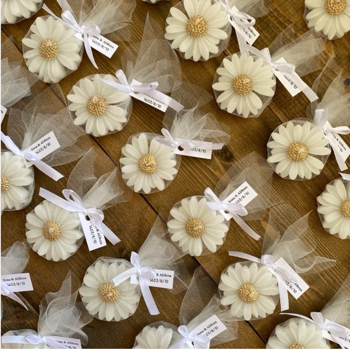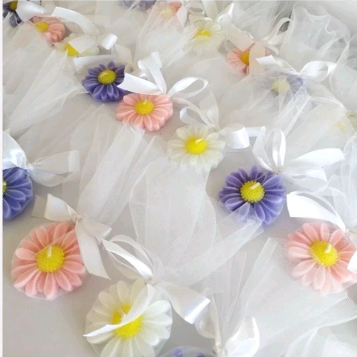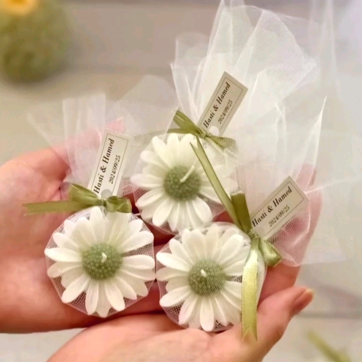 گیفت شمع گل بابونه 5سانت اقتصادی مناسب برای عروسی و هدیه دادن کیفیت عالی و تمیز. تزیینات تور، روبان، لیبل، تاریخ و اسم قابل تغییر به سلیقه شما عزیزان در رنگ دلخواه و هر تعداد که خواستید زمان آماده سازی کمتر هست