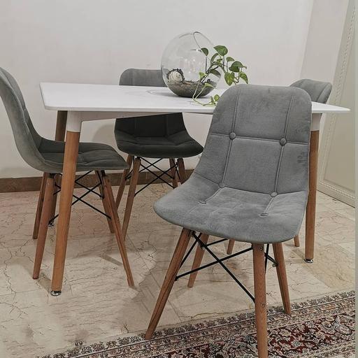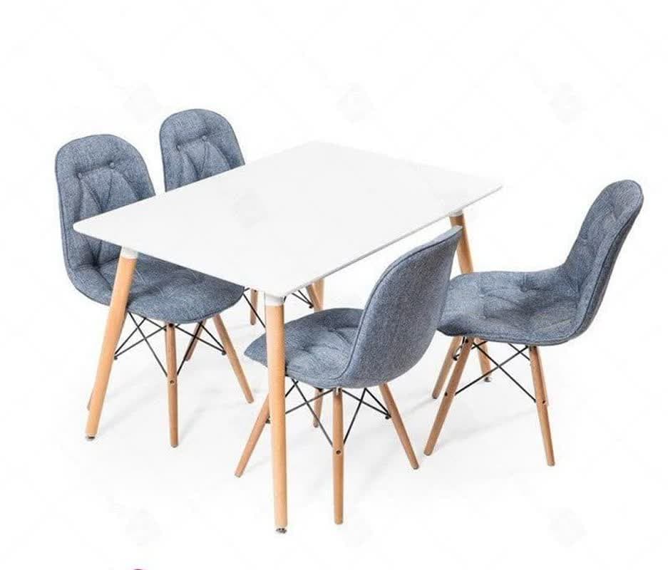 میز و صندلی ناهار خوری لمسه چهار نفره میز مستطیل ابعاد ۱۲۰ در ۸۰ صندلی ایفلی پایه چوب قابلیت تحمل وزن بالا مناسب برای أشپزخانه، کافه، رستوران و فست فود صندلی اسفنج و روکش پارچه ای، رنگبندی متنوع بر اساس کالیته رنگ به انتخاب مشتری صفحه میز ام دی اف در رنگهای مختلف