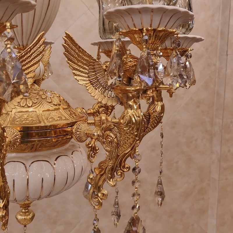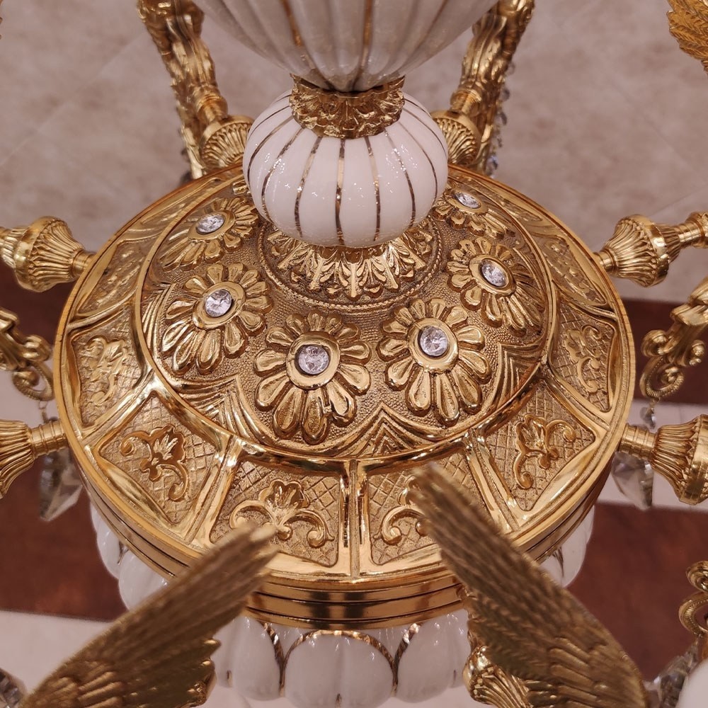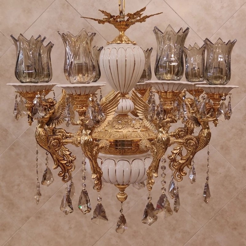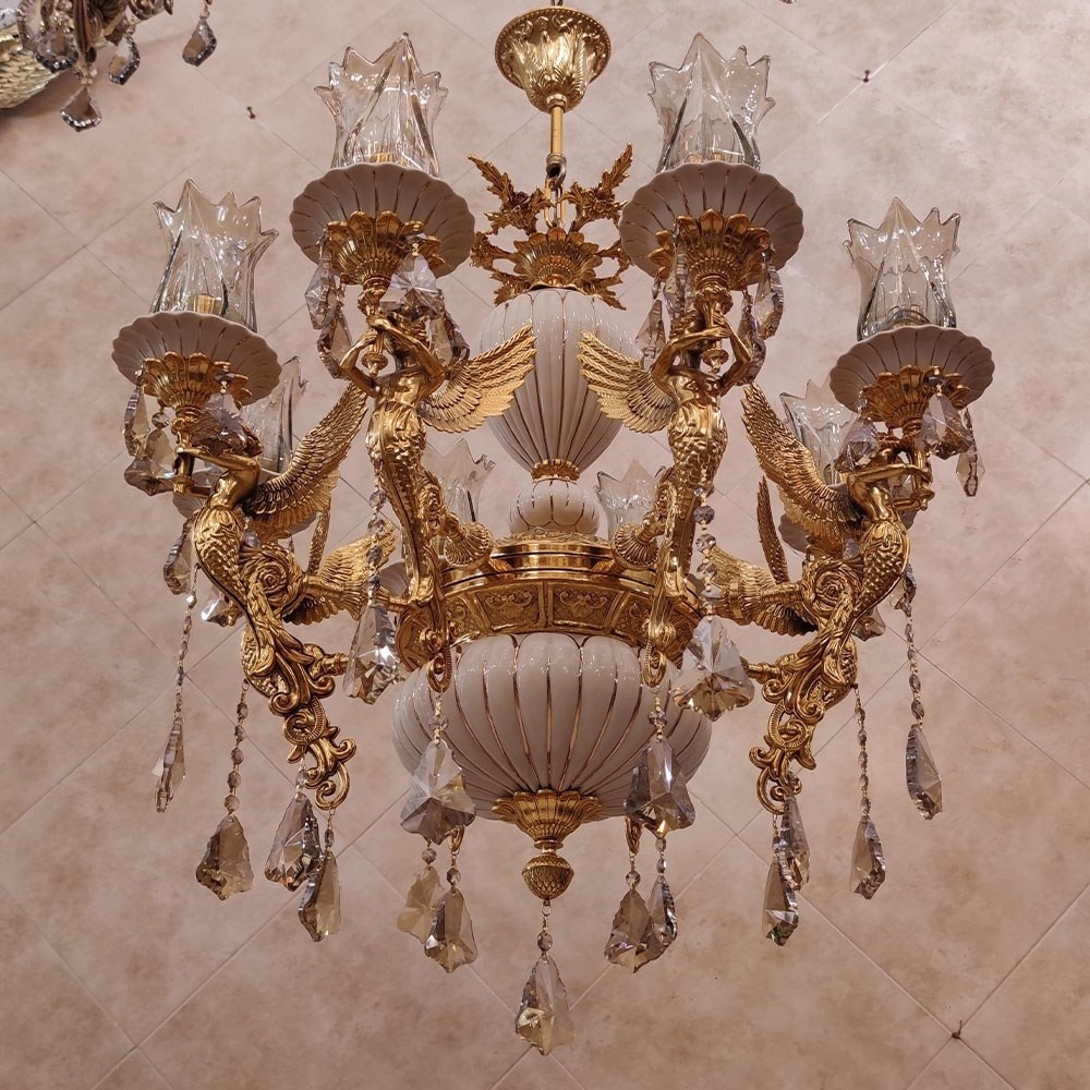 لوستر فرشته آبکاری فورتیک طلا براق چینی برنز برنزی ملکه 8 شاخه 8 شعله ضمانت 10 ساله مبلمونسرا مدل 245094