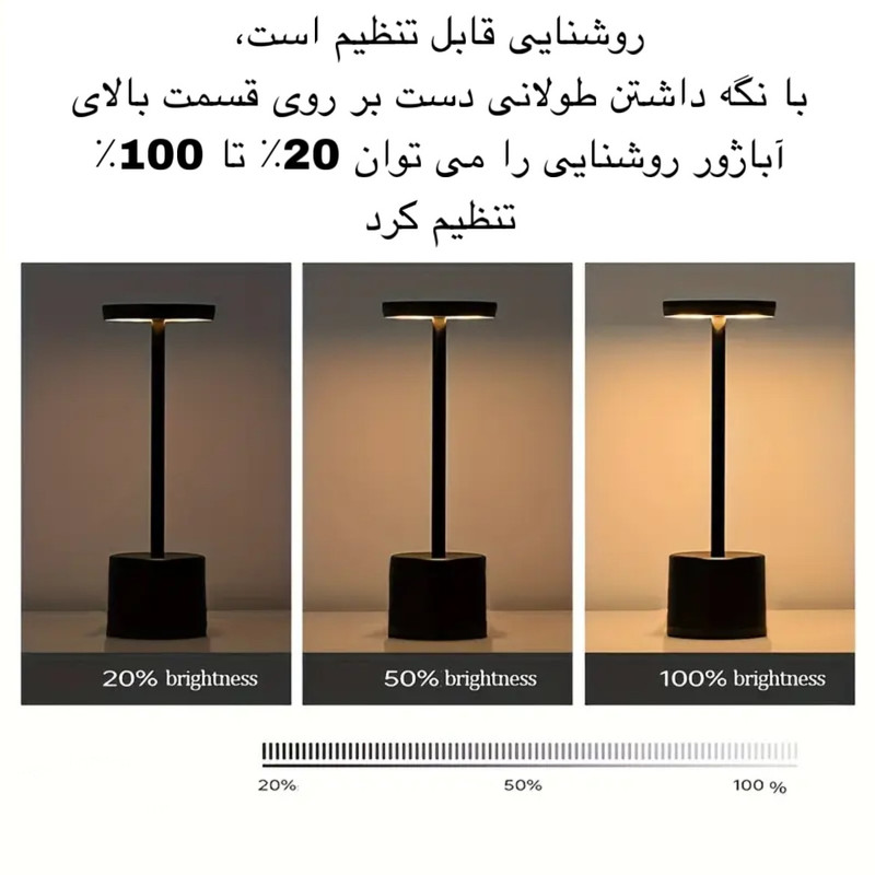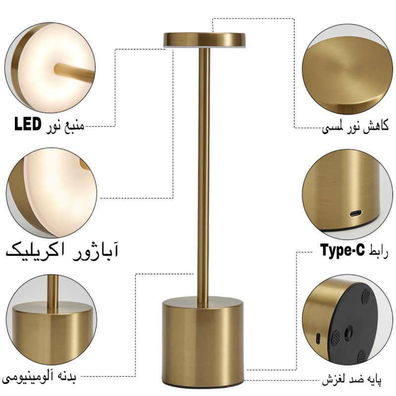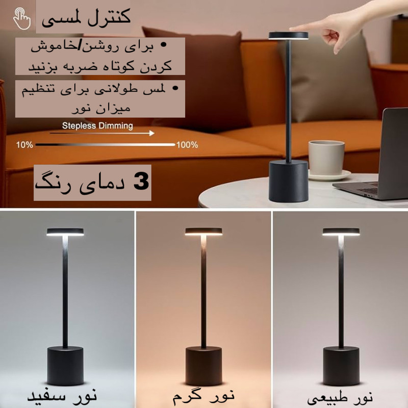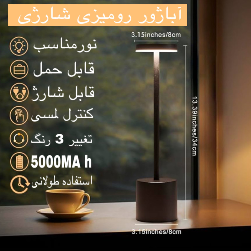 آباژور رومیزی شارژی با توان 5 وات رنگ نور 3500 کلوین، موجود میباشد. زیبایی و سایز مناسب این امکان را فراهم میآورد تا از این چراغ دکوراتیو علاوه بر نورپردازی فضای داخلی، در نورپردازی فضای بیرونی مانند تراس و یا روی میز رستوران ها قابل استفاده باشد. مزیت های چراغ شارژی رومیزی: این چراغ شارژی توسط باتری لیتیومی تغذیه شده و به وسیله شارژر پورت تایپ سی قابل شارژ میباشد.این دستگاه دارای سه طیف نور می باشد نور طبیعی نور سفید و نور زرد که با تاچ قسمت بالای آباژور قادر به تغییر رنگ آن هستید و با نگه داشتن آن قسمت می توانید نور را کم یا زیاد کنید. شما می توانید با 5 تا 7 ساعت شارژ دستگاه ، به مدت حداقل 6 تا 8 ساعت از نور دلنشین آن در فضاهای دلخواه خود بهره مند شوید. بدنه مقاوم و بسیار با کیفیت آباژور سهولت در جابجایی را نیز می توان از دیگر نقاط قوت این محصول دانست. مشخصات فنی محصول: ** مشخصات ** نوع چراغ خواب و آباژور: پایهدار رنگ نور: چند رنگ ویژگیهای خاص: شارژی ابعاد: 34x8x1 سانتیمتر وزن: 200 گرم نوع لامپ: LED منبع انرژی: USB سایر توضیحات: دارای سه رنگ نور متفاوت- سنسور لمسی در بالای چراغ- شدت نور قابل تنظیم جنس بدنه: آلومینیوم