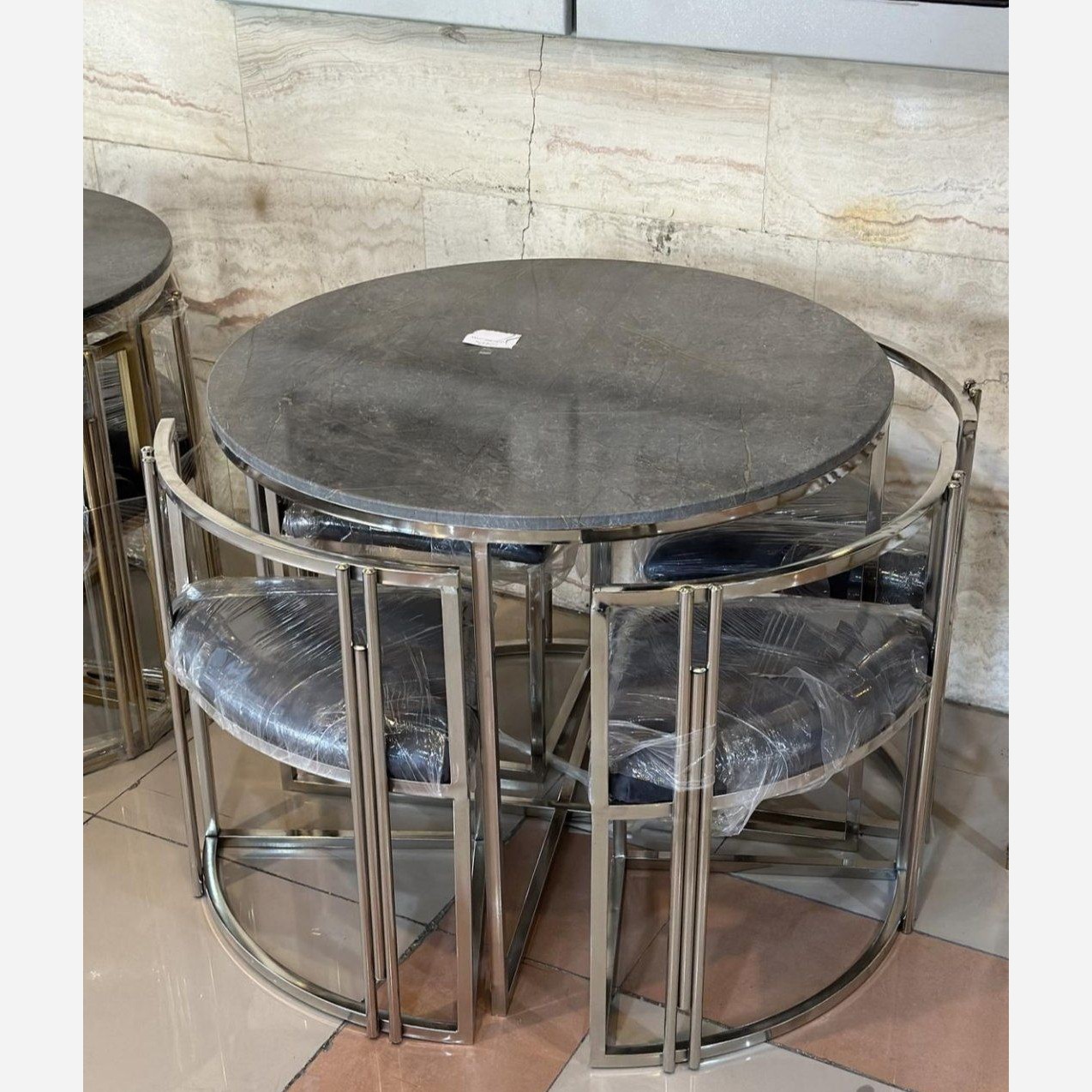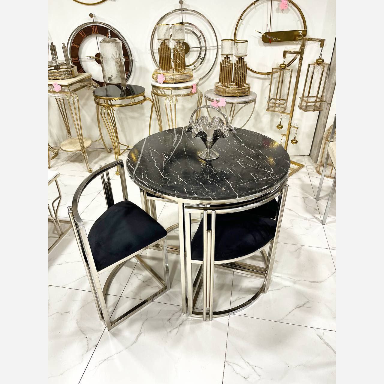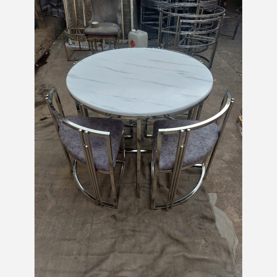 میزغذاخوری ساخته شده از فلز با آبکاری فورتیک سیلور برای رنگ صفحه ام دی اف نشیمن ساخته شده از یک لایه فوم و یک لایه اسفنج 5 سانتی و پارچه دیاموند