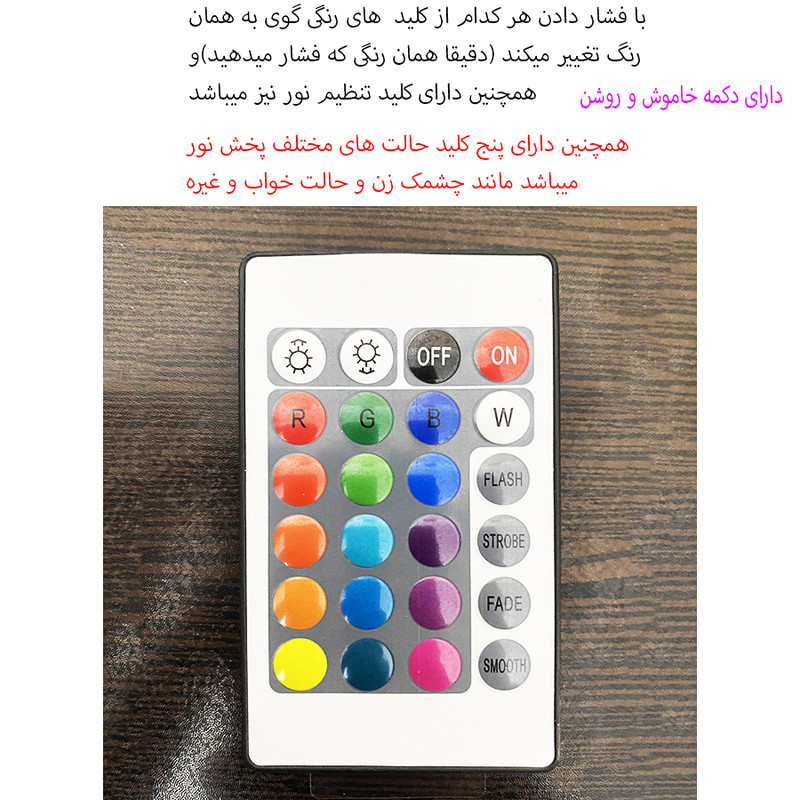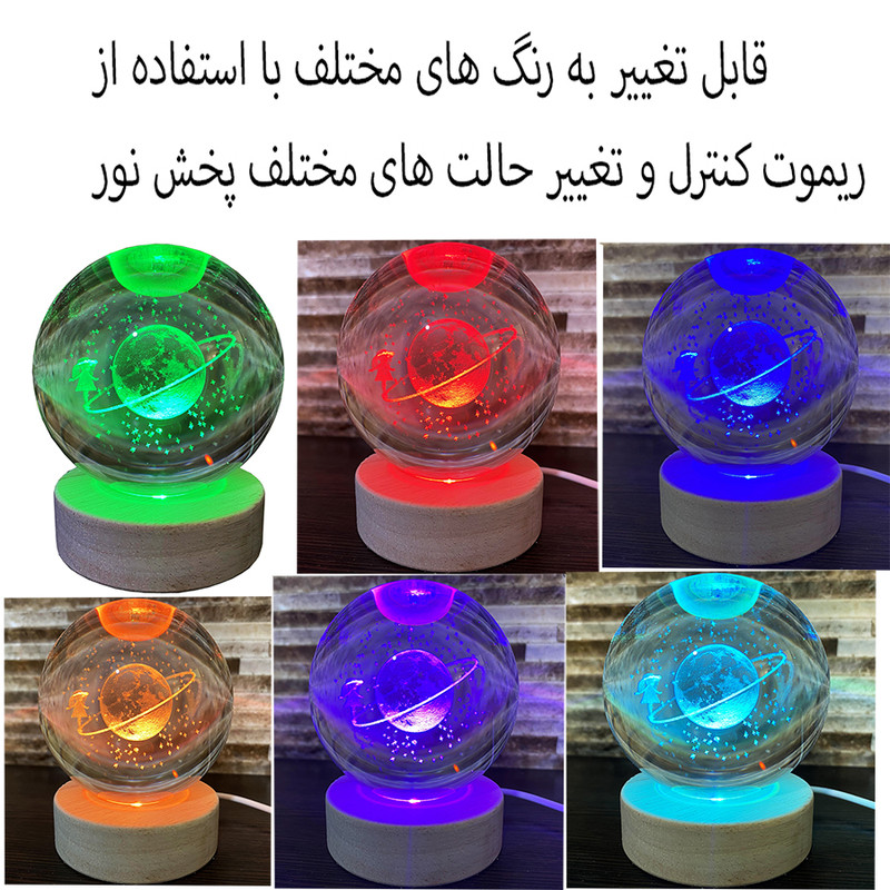 این گوی کریستالی میتواند یک هدیه بسیار زیبا به کودکان و حتی بزرگسالان باشد. پایه ی چوبی زیر گوی از طریق کابل مربوطه به برق متصل می گردد و سپس LED های روشنایی رنگی به وسیله ریموت کنترل تغییر رنگ میدهد که داخل پایه ی چوبی طراحی شده اند, روشنایی دل انگیزی به گوی می دهند طوری که طراحی داخل گوی به زیبایی می درخشند و کودک و حتی بزرگسالان را مجذوب خود می کند. مشخصات فنی محصول: ** مشخصات ** ابعاد: 8x8x9 سانتیمتر وزن: 250 گرم نوع لامپ: LED منبع انرژی: USB سایر توضیحات: - این محصول به تازگی روانه بازار شده و کاملا متفاوت با سایر کالاها میباشد زیرا این گوی به وسیله ریموت کنترل قابل تغییر رنگ های مختلف میباشد و دارای دکمه های مختلف تغییر رنگ خودکار و غیره نیز میباشد و همچنین دارای دکمه خاموش و روشن کردن و تنظیم روشنایی نور است - نور ملایم چراغ شب ما نه تنها می تواند فضایی دنج را به اتاق خواب شما بیافزاید، بلکه یک دکوراسیون بسیار زیبا,مناسب برای اتاق خواب، اتاق نشیمن، حمام و مطالعه است. - بسیار با کیفیت و خوش ساخت جنس بدنه: کریستال