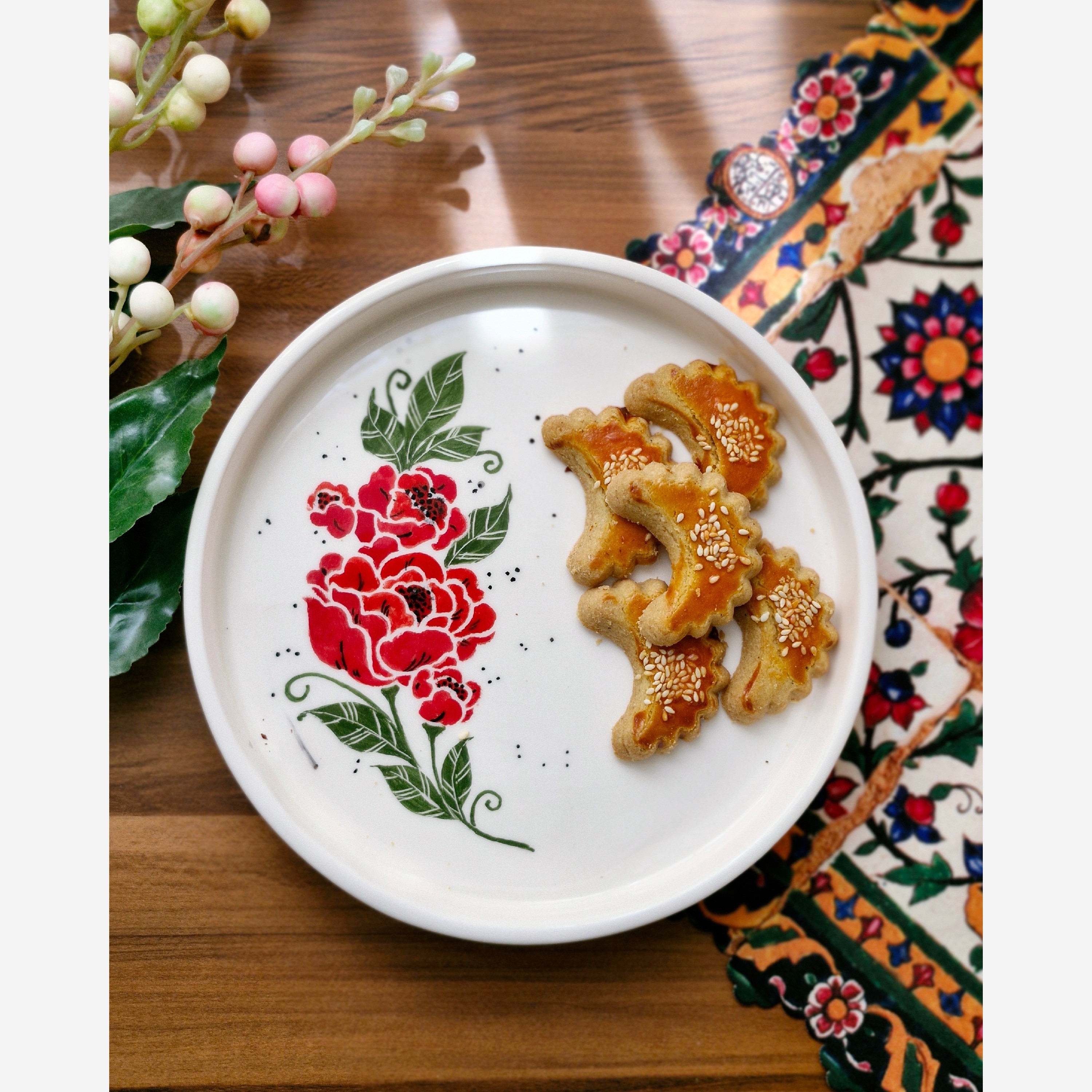 دیس سرامیکی گرد کاملا دستساز نقاشی شده و قابل شستشو قابل سفارش بعنوان شیرینی خوری با پایه چوبی یا سرامیکی