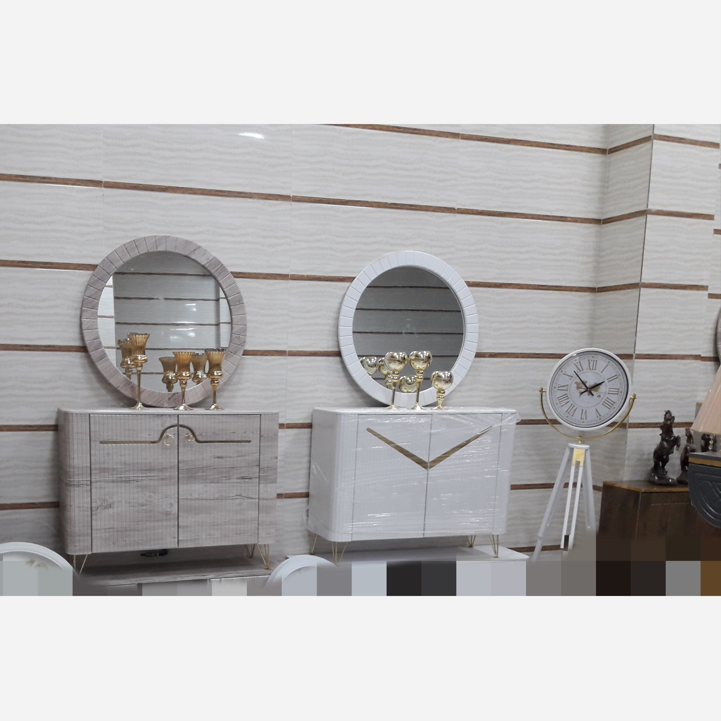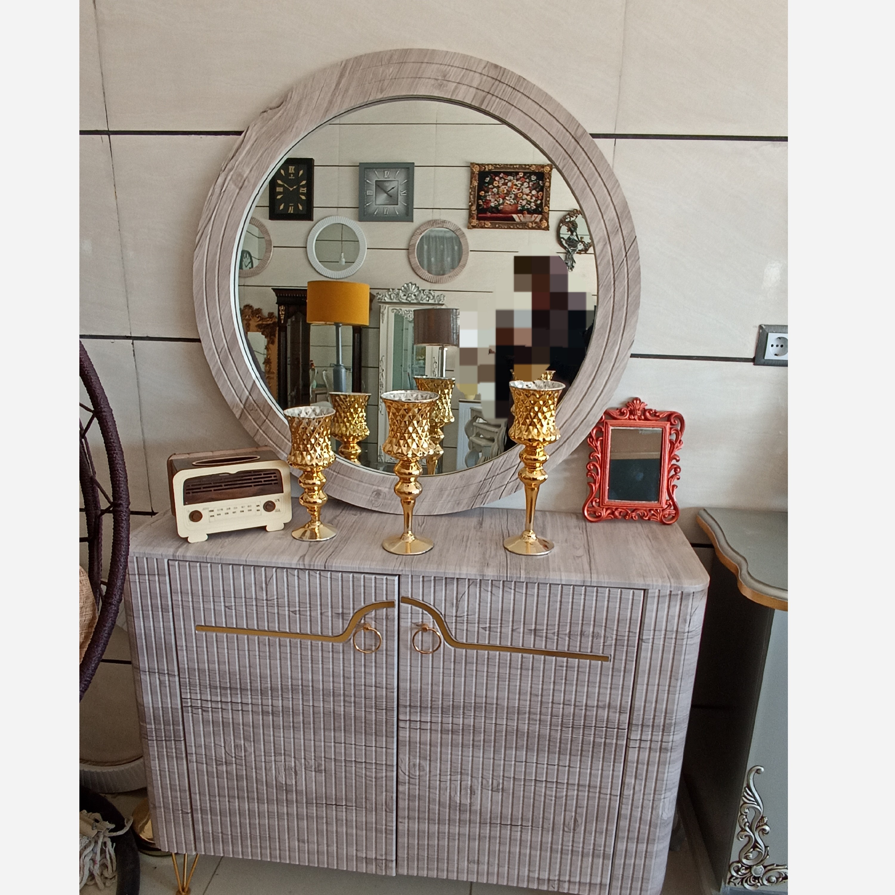 آینه کنسول دوطرف خم جنس ترکیبی امدیاف با ملامینه با وکیوم کره ای ضدخش آینه گرد سایز بزرگ پایه و دستگیره فلزی ابکاری فورتیک طول120/عمق35/ارتفاع90 تولیدی مصنوعات چوبی ماهون