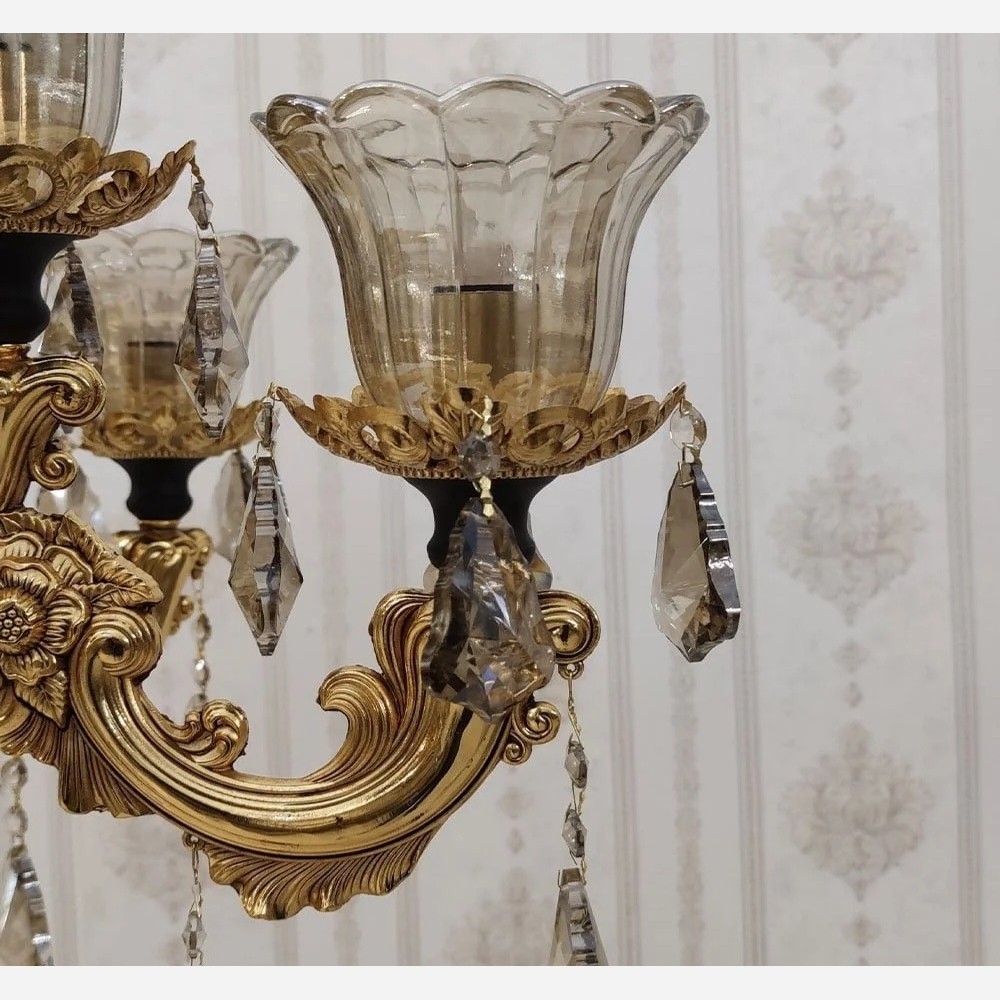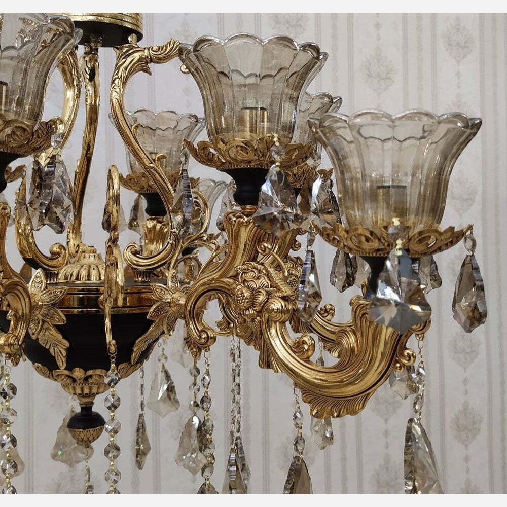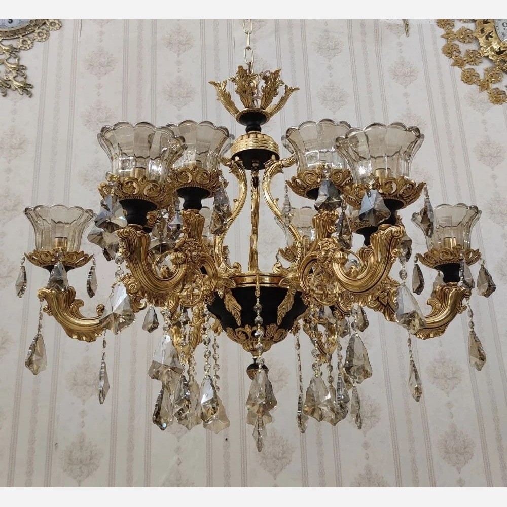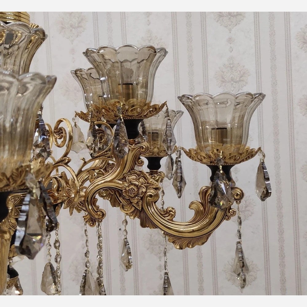 لوستر برنز اصل ضمانت 10 ساله 12 شاخه 6 شعله بزرگ گل رز فورتیو سیاه کاری استاتیک برنزی مبلمونسرا مدل 245107
