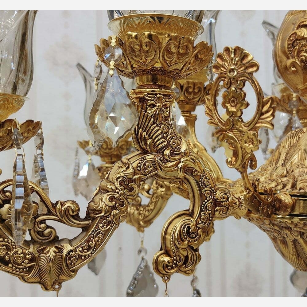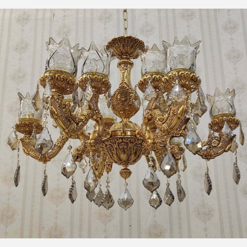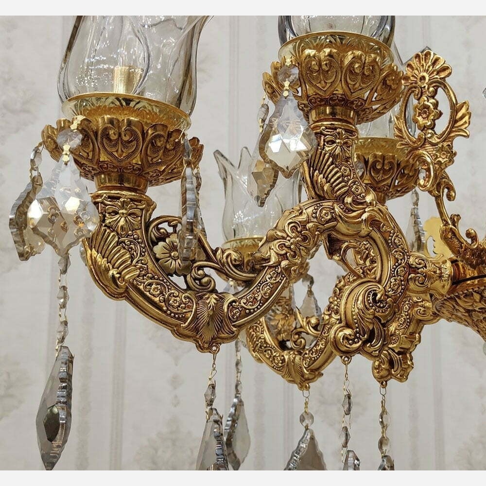 لوستر برنز اصل با ضمانت 10 ساله پانیذ 12 شعله فورتیک آبکاری طلا لوستر جدید برنزی مبلمونسرا مدل 245097