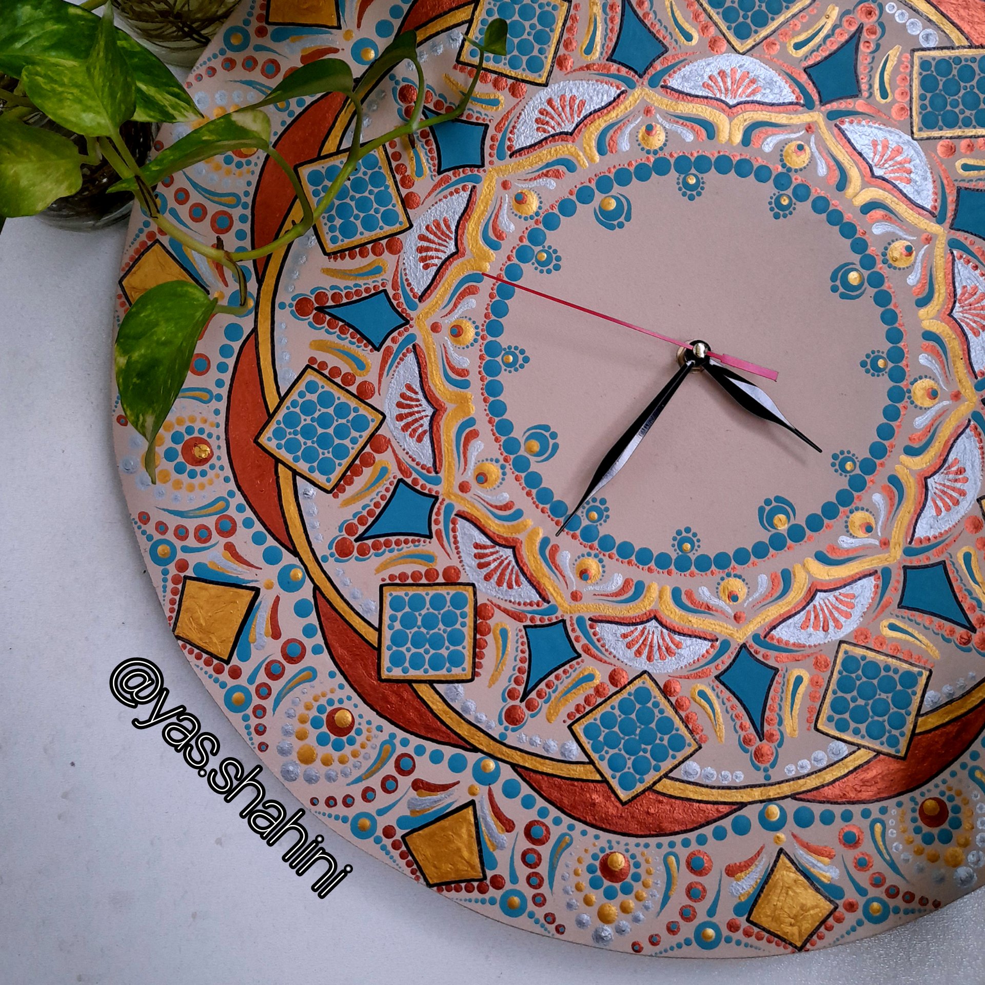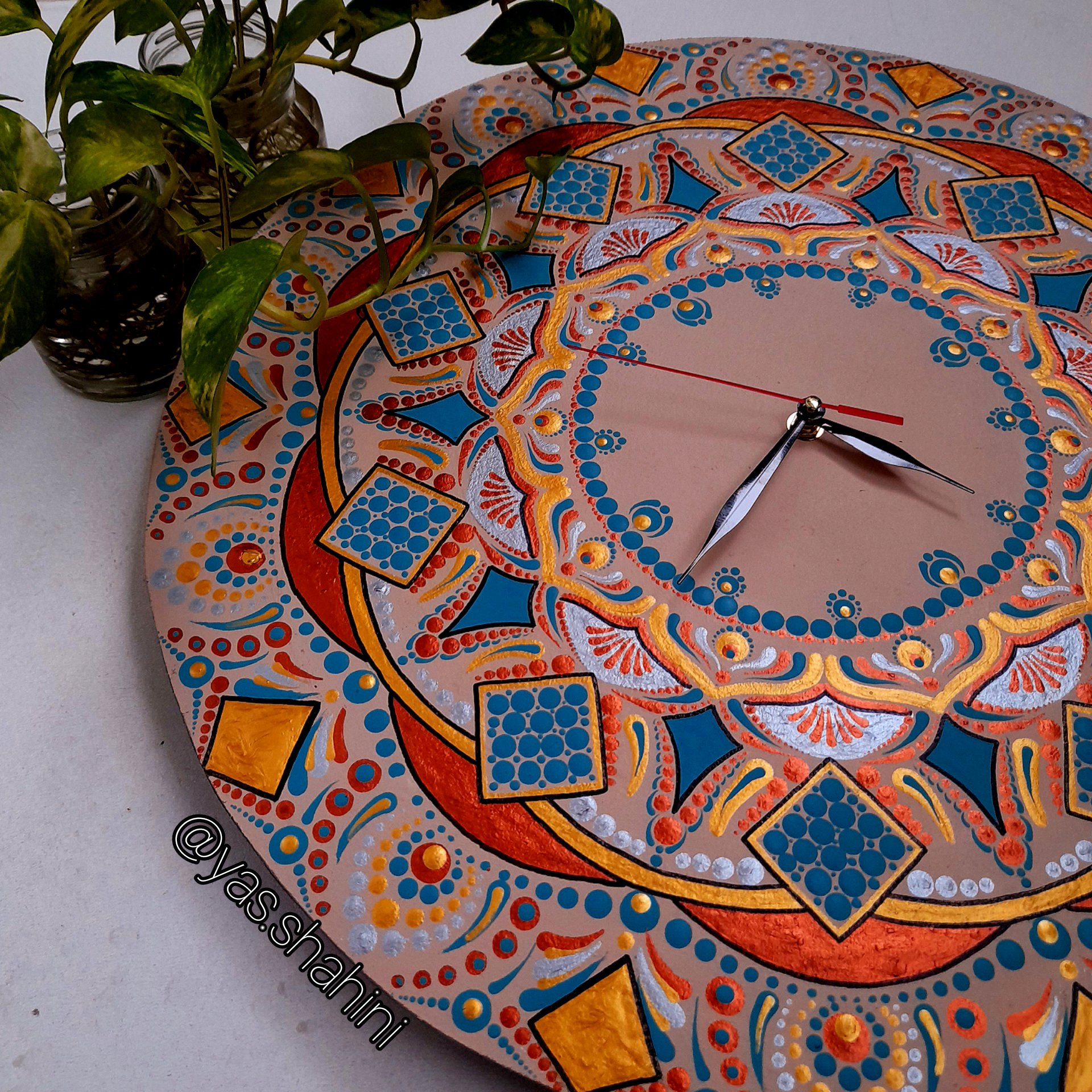 اینکار قابل گردگیری هست با روکش براق . رنگ ترکیبی داره یک عدد طراحی شده و موجوده . جنس موتور ساعت مرغوب گیره اویز دیواری داره قطر حدود 50سانت