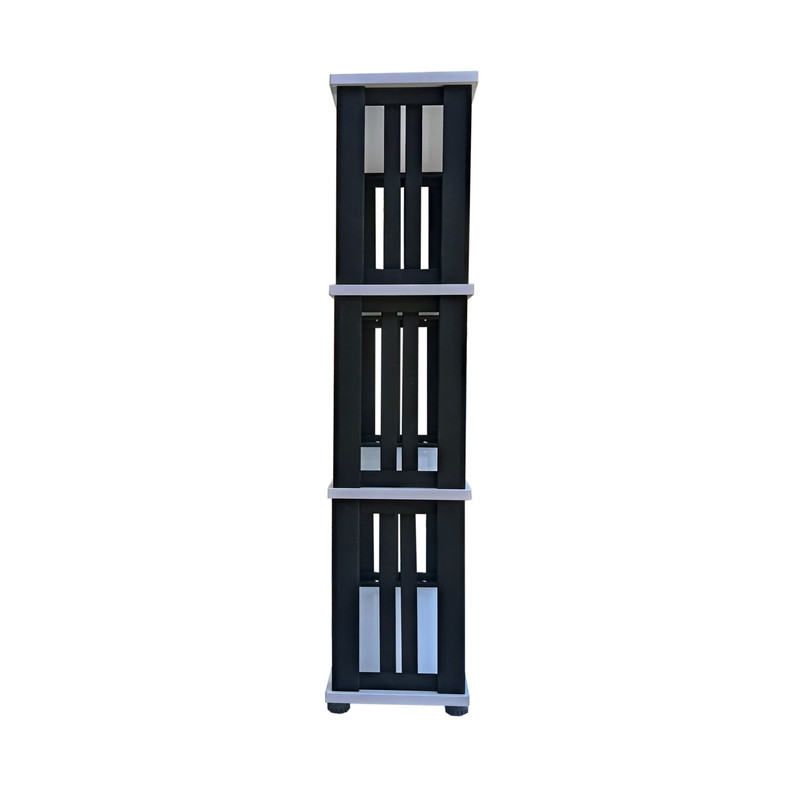طراحی زیبا و سادگی از مزایای این کتابخانه است. فاصله طبقات 30 سانتی متر است. طبقات این کتابخانه از جنس ملامینه با نوار پی وی سی است. پایه های مشکی داخلی این کتابخانه از ام دی اف خام هشت میلیمتری ساخته شده است که با رنگ اکریلیک مشکی رنگ آمیزی شده است. پایه های پلاستیکی کف آن قابلیت تراز کردن کتابخانه را می دهد. این کتابخانه با 16 پیچ به راحتی مونتاژ می شود. لینک فیلم آموزش مونتاژ در بسته بندی قرار دارد.