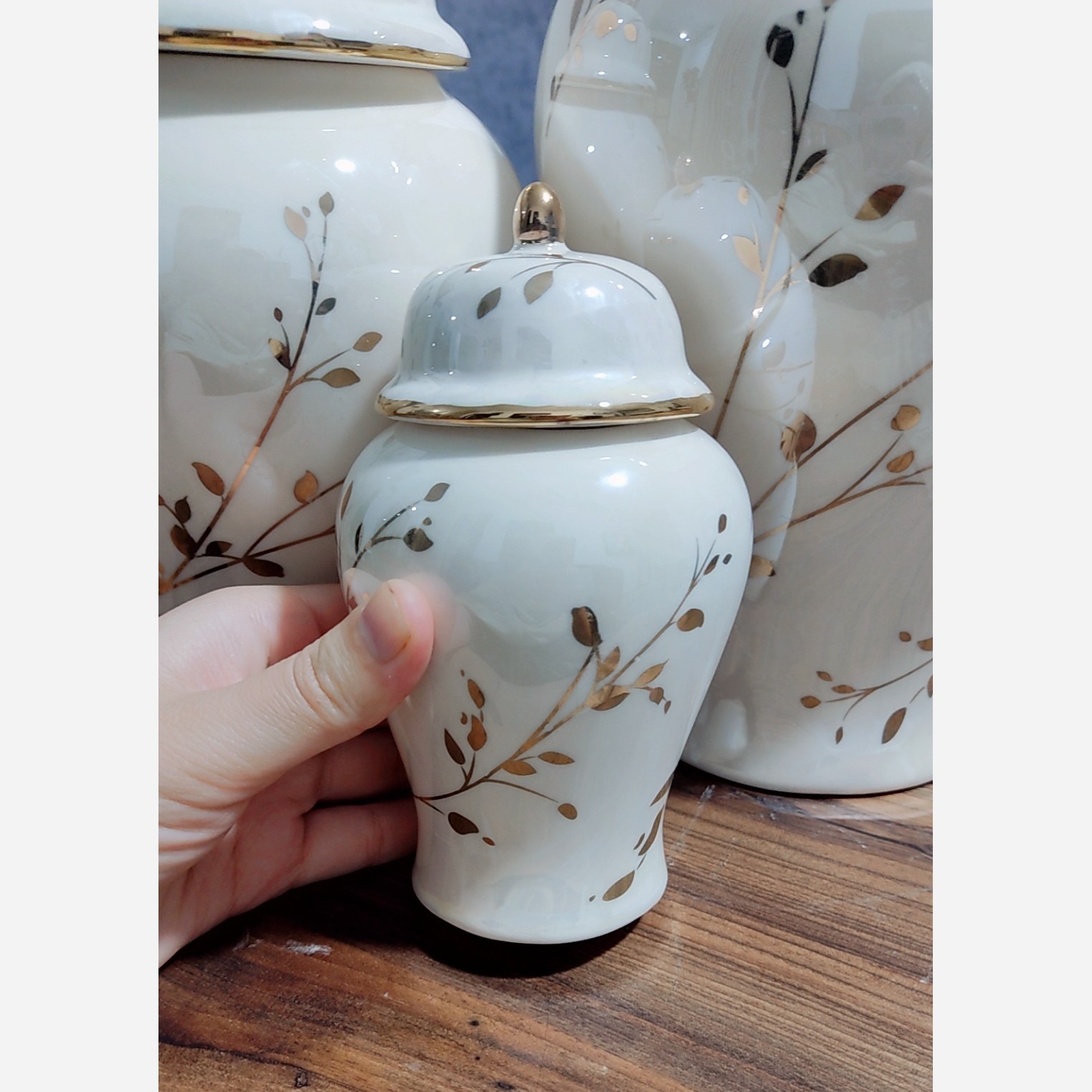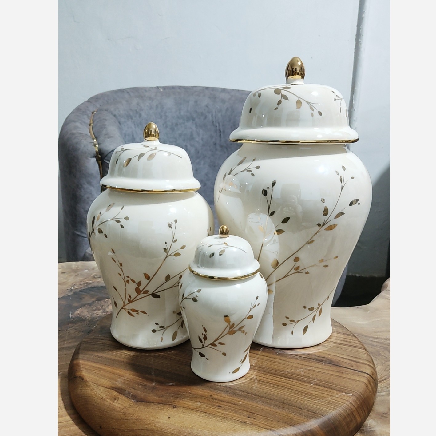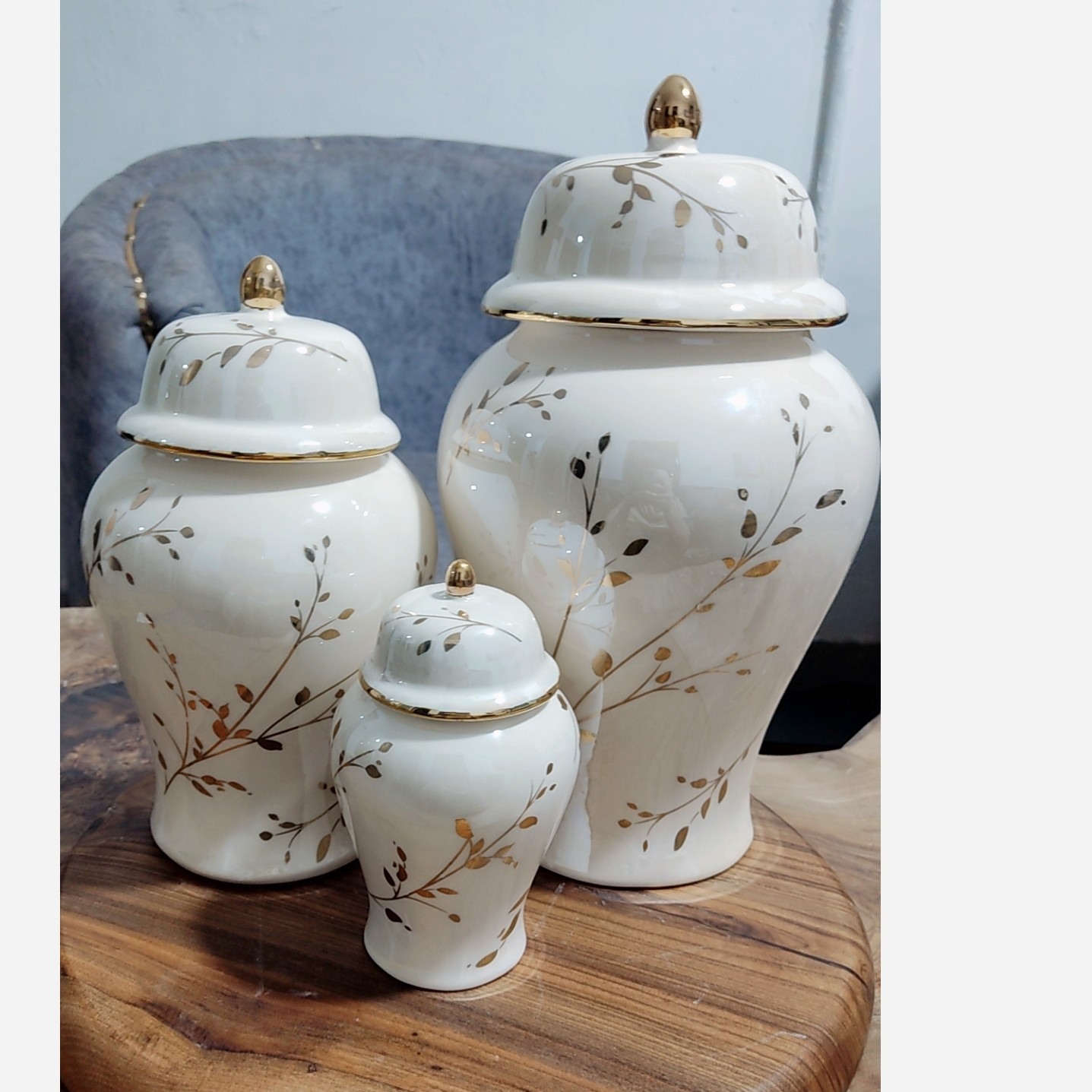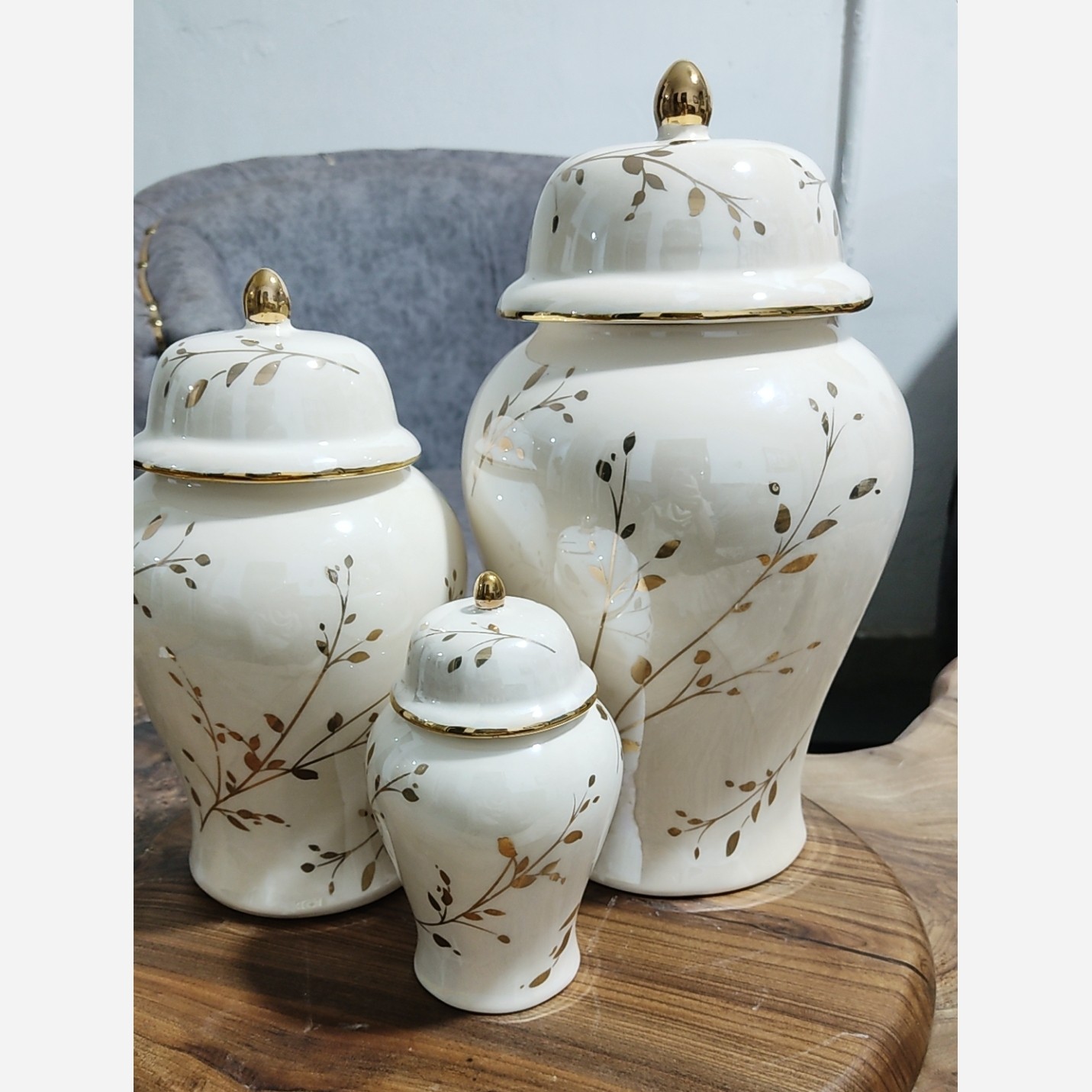 ست سه تایی جینجرجار شاخه طلایی این کار علاوه بر لعاب عادی لاستر صدفی هم خورده ک ب کار حالت صدفی هفت رنگ میدهد