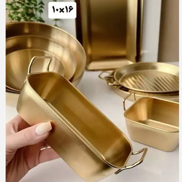 سوفله خوری طلایی دو دسته مربع و مستطیل محصول وارداتی جنس استیل با کیفیت نگیر رنگ طلایی رنگ ثابت و ضد زنگ مناسب برای سرو غذا،سالاد،تنقلات و... ابعاد 10*16و 10*10