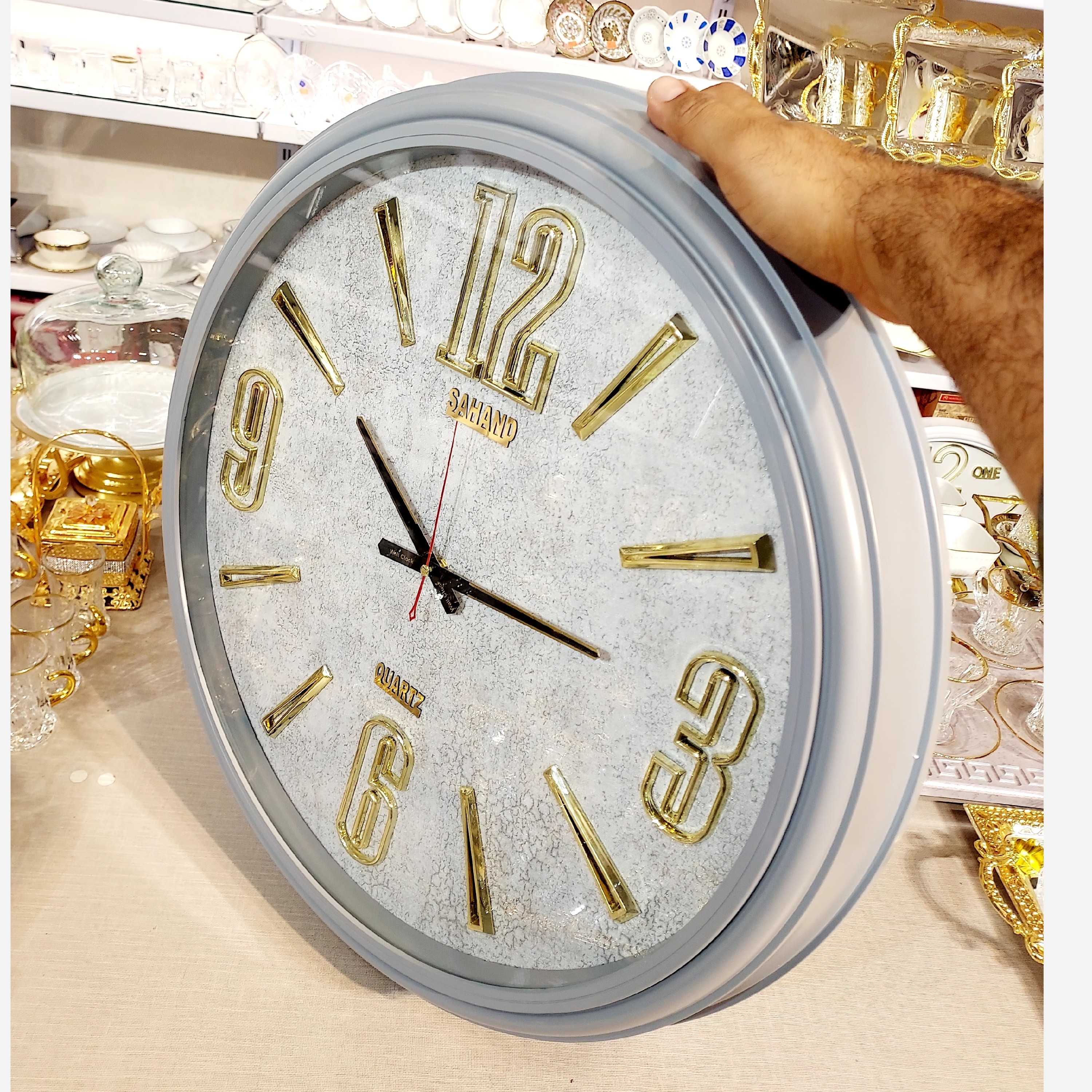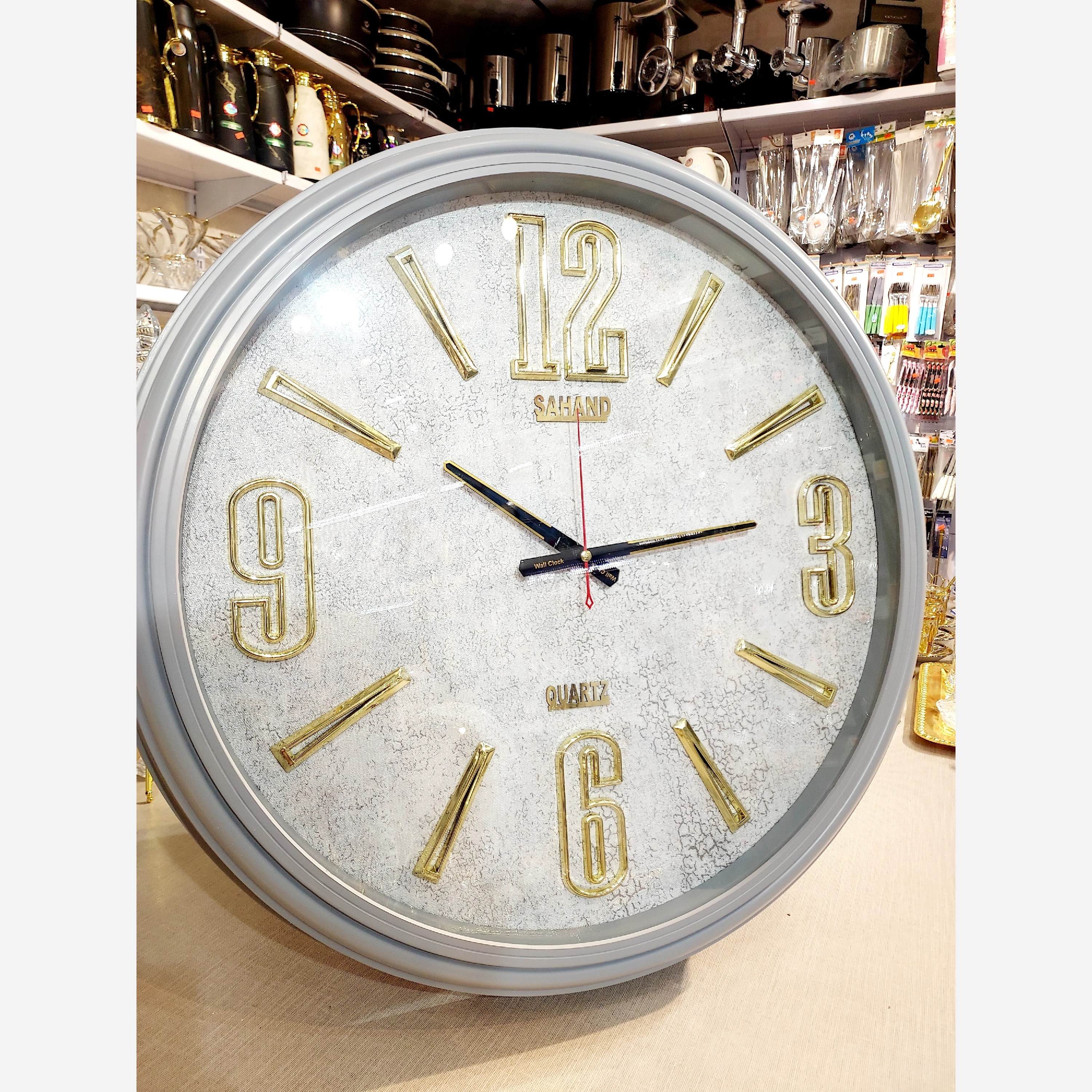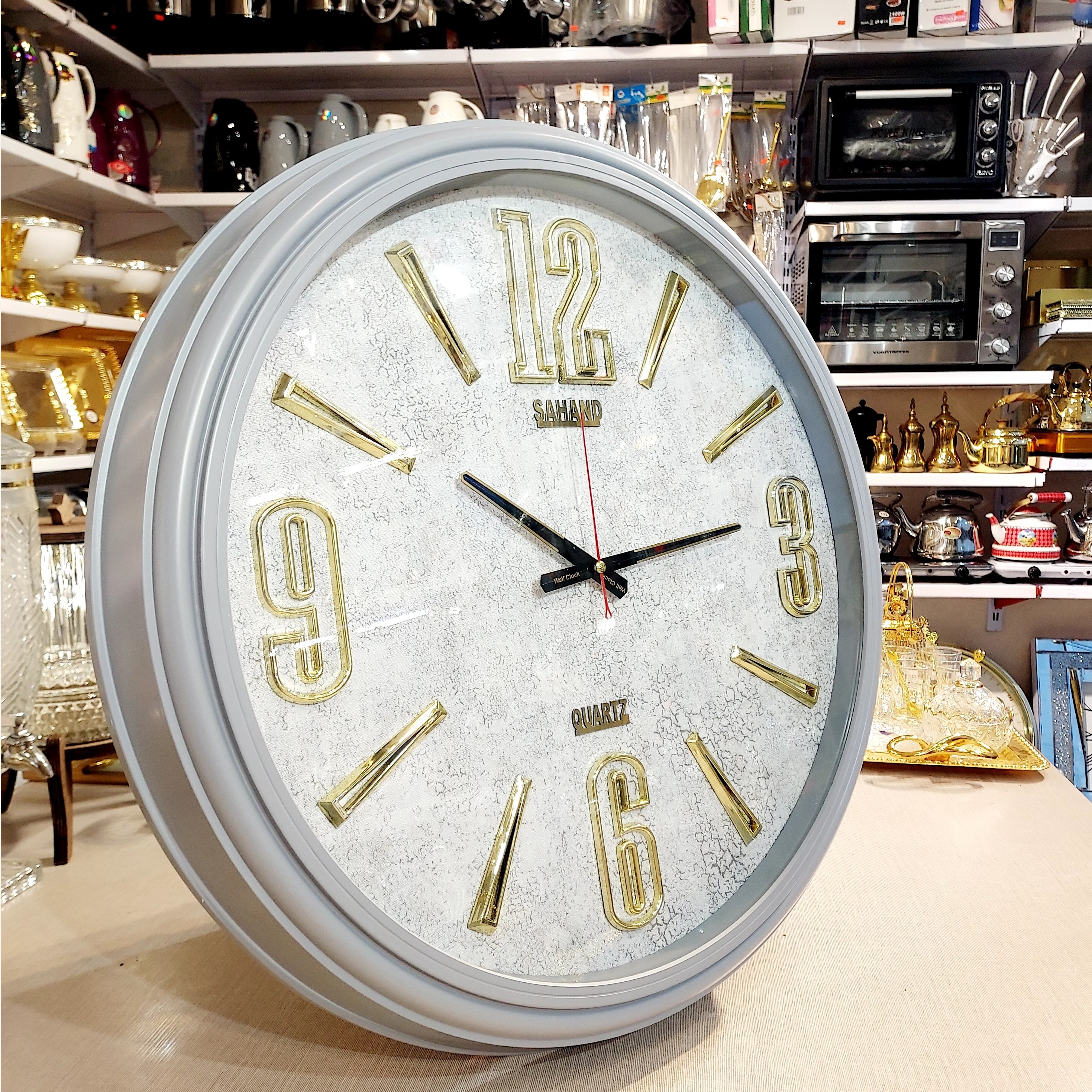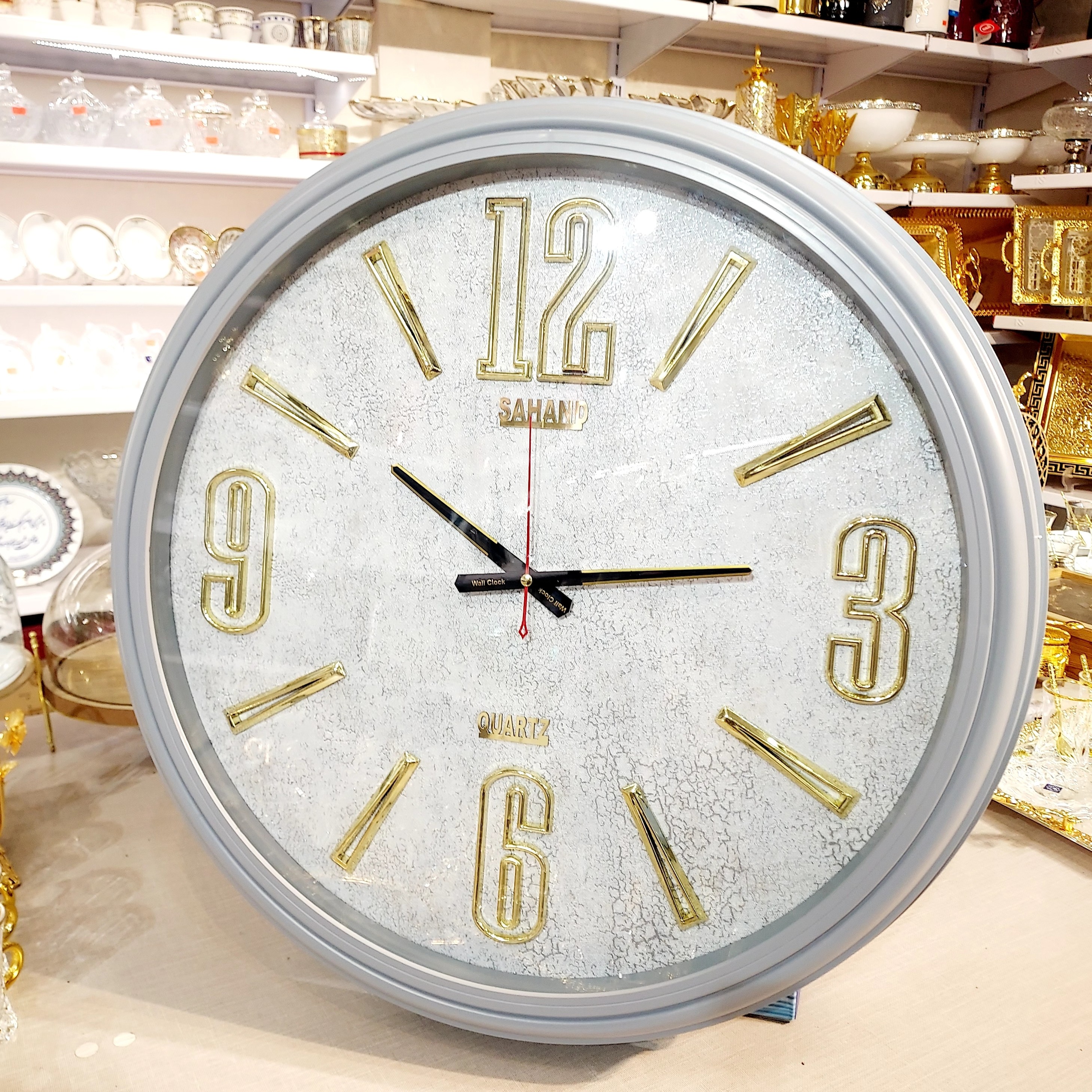 ساعت دیواری مدل سهند رنگ طوسی طلایی کیفیت بالا و درجه یک موتور قطر 65 موتور آرام گرد و بی صدا جنس بدنه پلاستیک فشرده