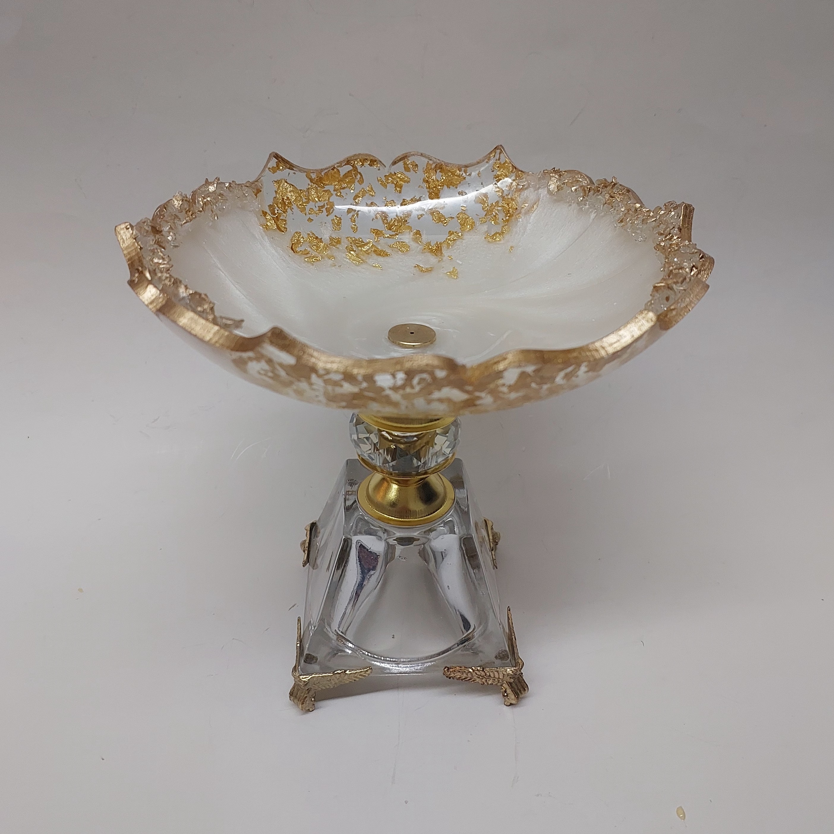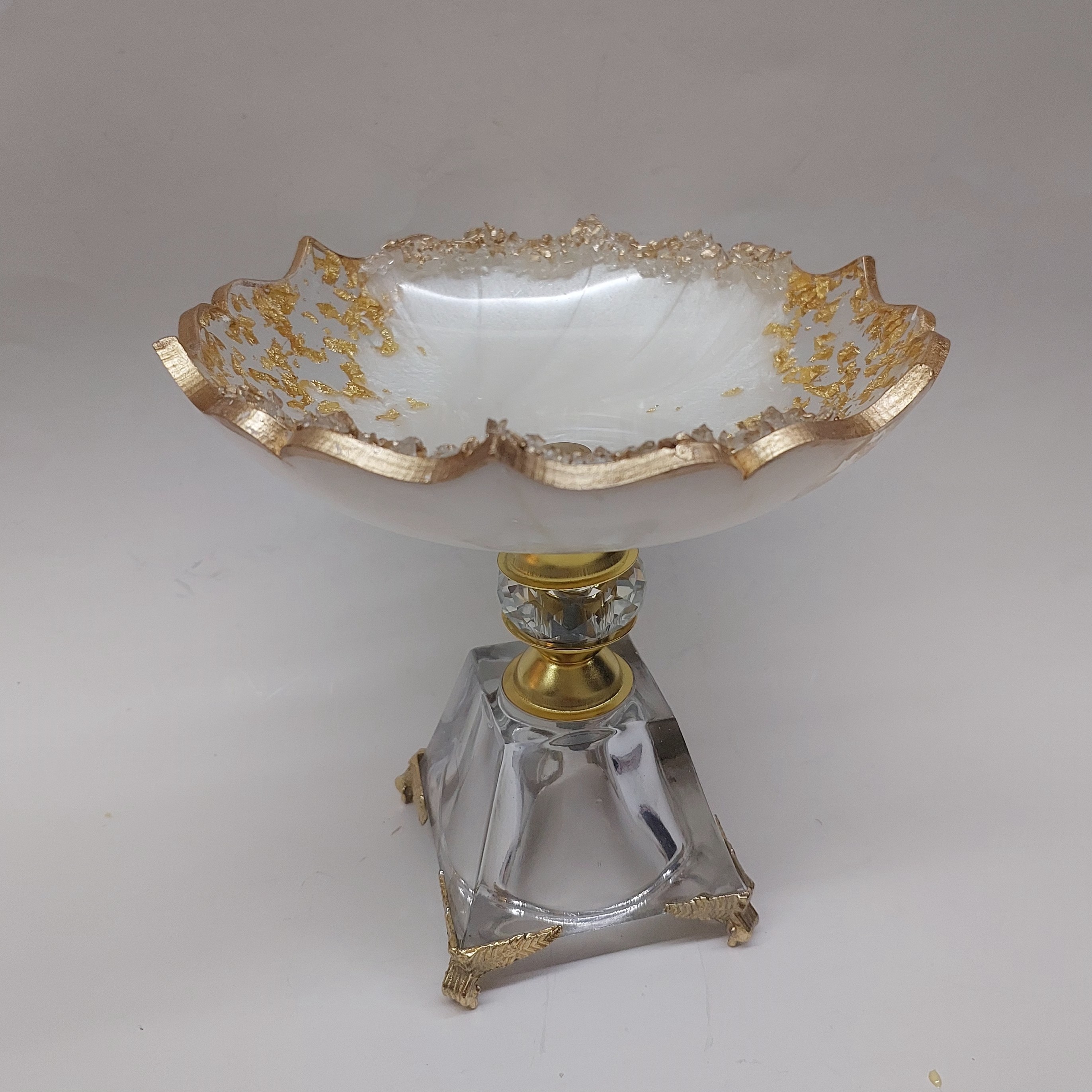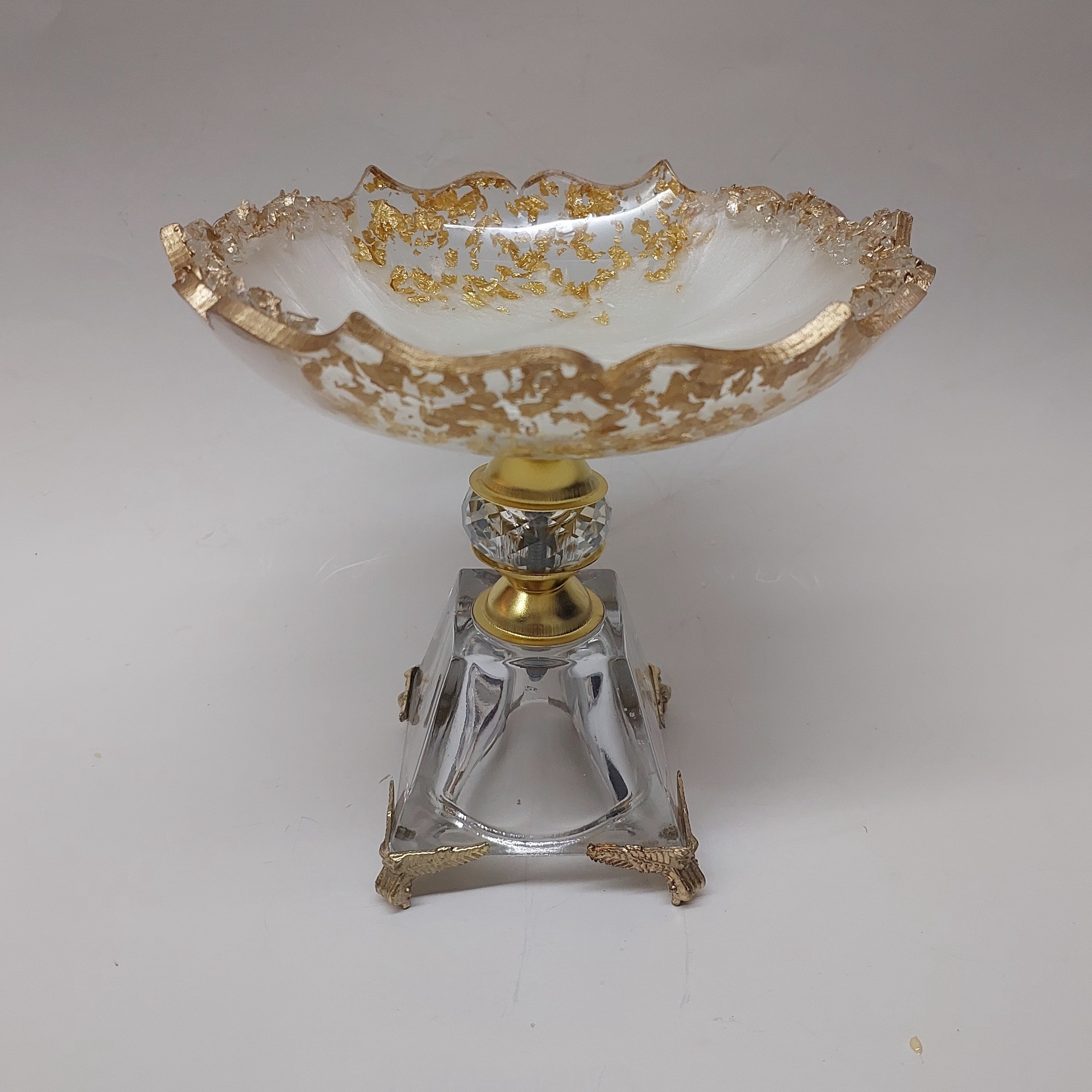 جنس رزین شفاف کار شده با ورق طلا و کریستال طلایی ابعاد 18 سانت قالب تخت آن 22 سانت می باشد بسیار زیبا مناسب سرو شکلات قابل شست و شو و تا حدودی نشکن