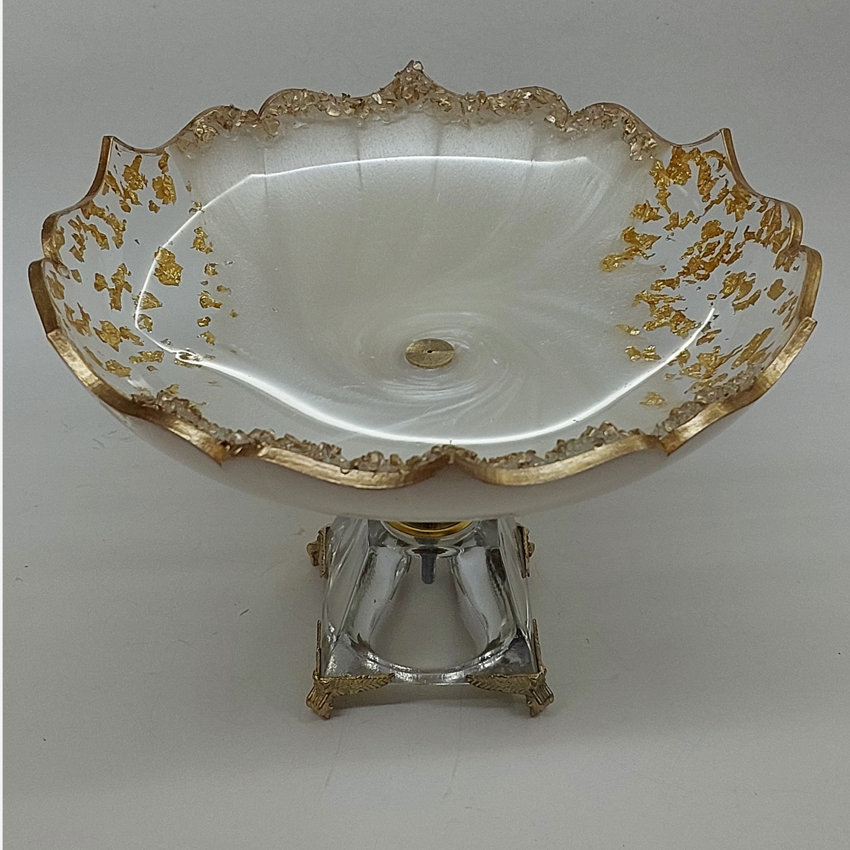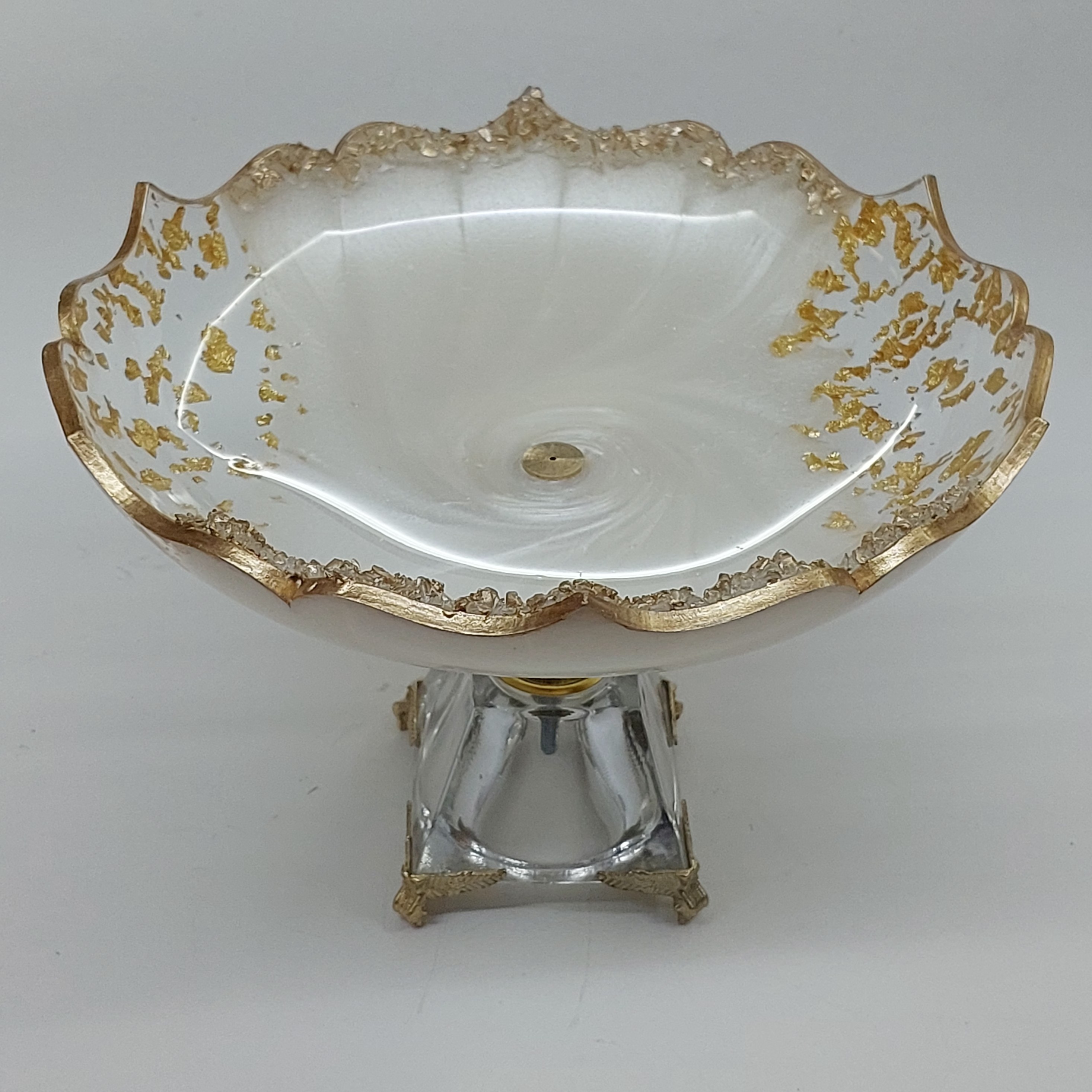 جنس رزین شفاف کار شده با ورق طلا و کریستال طلایی پایه کریستال ابعاد 26 سانت قالب تخت آن 30 سانت قابل شست و شو و تا حدودی نشکن مناسب سرو میوه یا اجیل